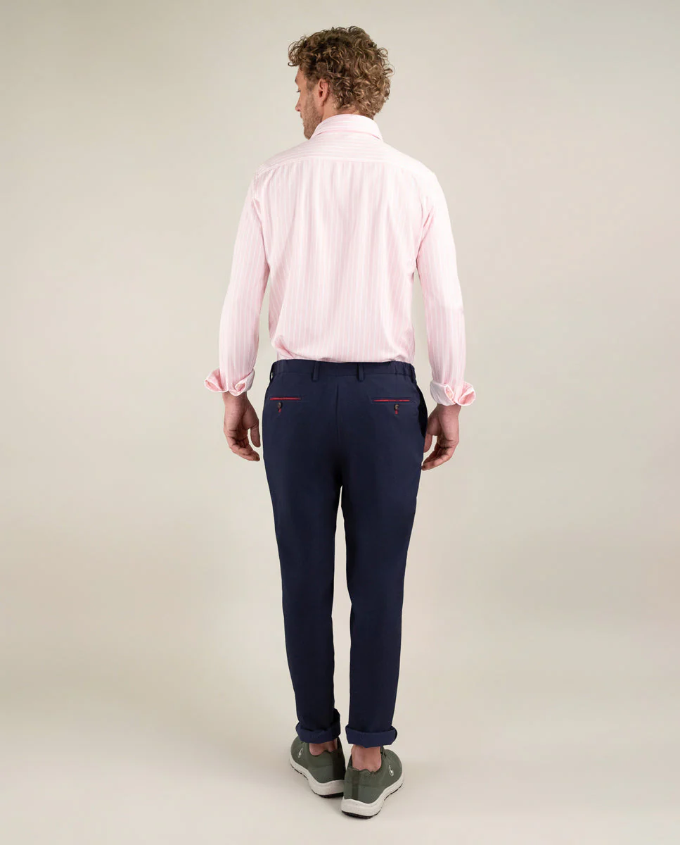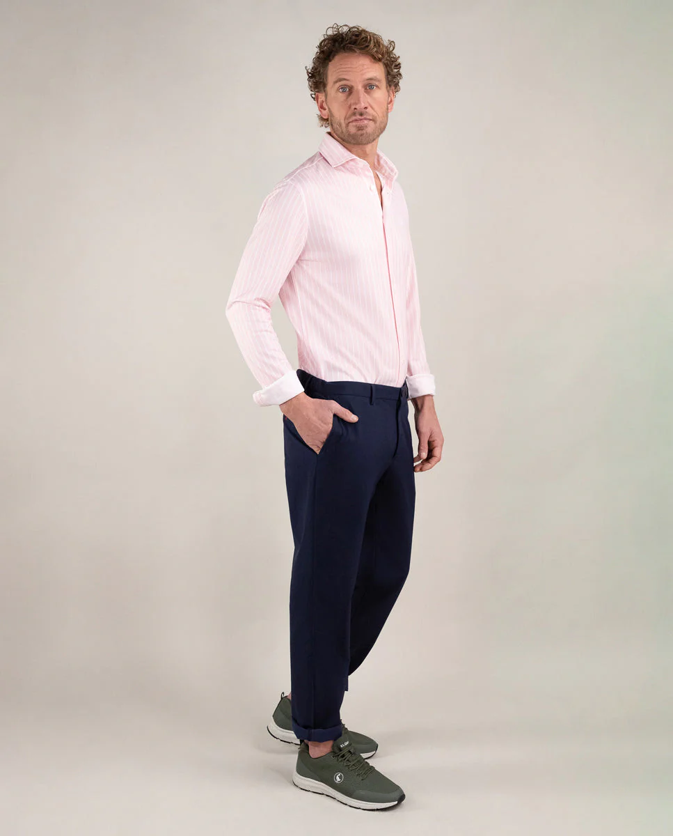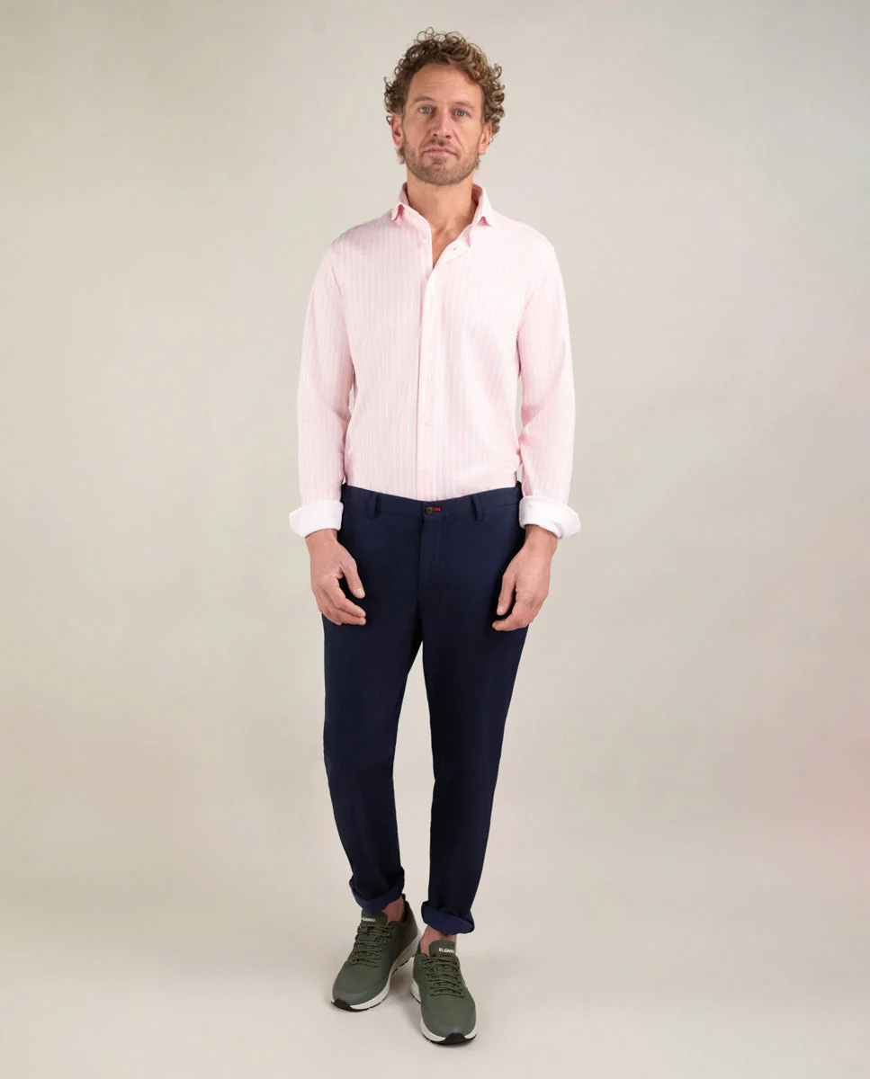 Camisa de hombre raya butcher con tecnología Sepiia confeccionada en 100% poliéster técnico antibacteriano reciclable. Corte Slim Fit, cuello buttondown y cierre con botones. Manga larga terminada en puño simple y logo bordado en el pecho a contraste. Tiene cortes en la espalda que permite ajustarse ligeramente al cuerpo, manteniendo la comodidad. Costura del hombro reforzada, para prevenir el desgaste por el uso. Bajo redondeado. Estos tejidos han sido producidos en España y las prendas han sido confeccionadas en Portugal de una forma sostenible.