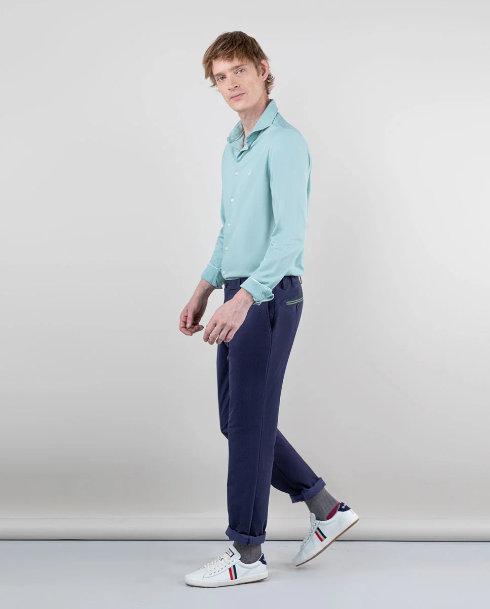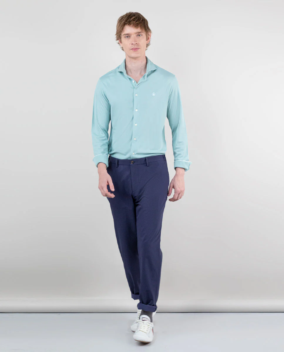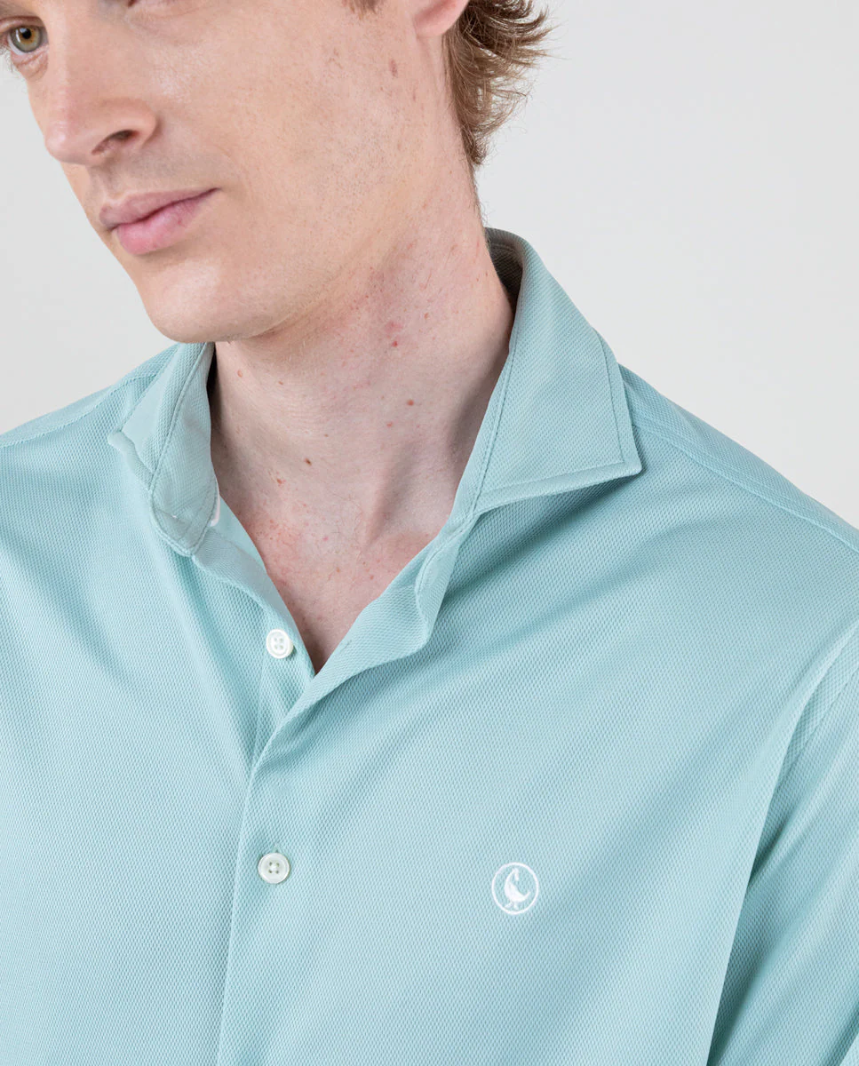 Camisa de hombre lisa con tecnología Sepiia confeccionada en 100% poliéster técnico antibacteriano reciclable. Corte Slim Fit, cuello buttondown y cierre con botones. Manga larga terminada en puño simple y logo bordado en el pecho a contraste. Tiene cortes en la espalda que permite ajustarse ligeramente al cuerpo, manteniendo la comodidad. Costura del hombro reforzada, para prevenir el desgaste por el uso. Bajo redondeado. Estos tejidos han sido producidos en España y las prendas han sido confeccionadas en Portugal de una forma sostenible.