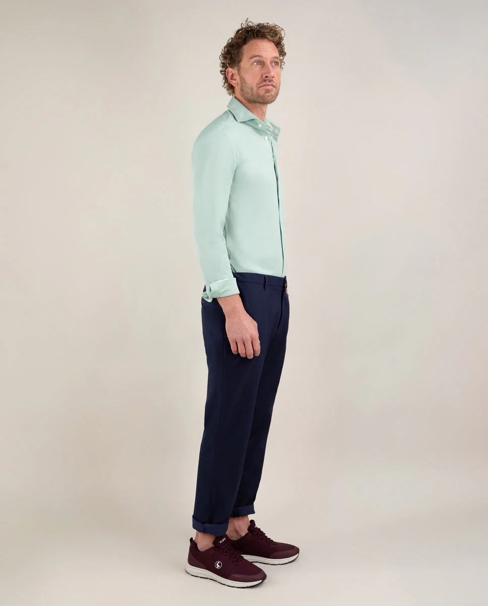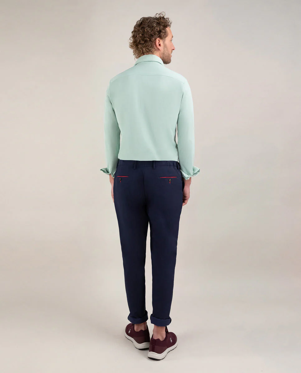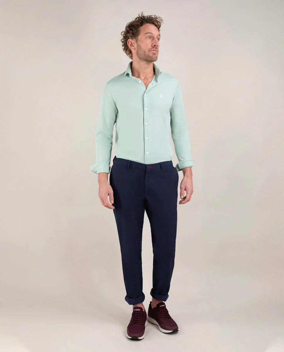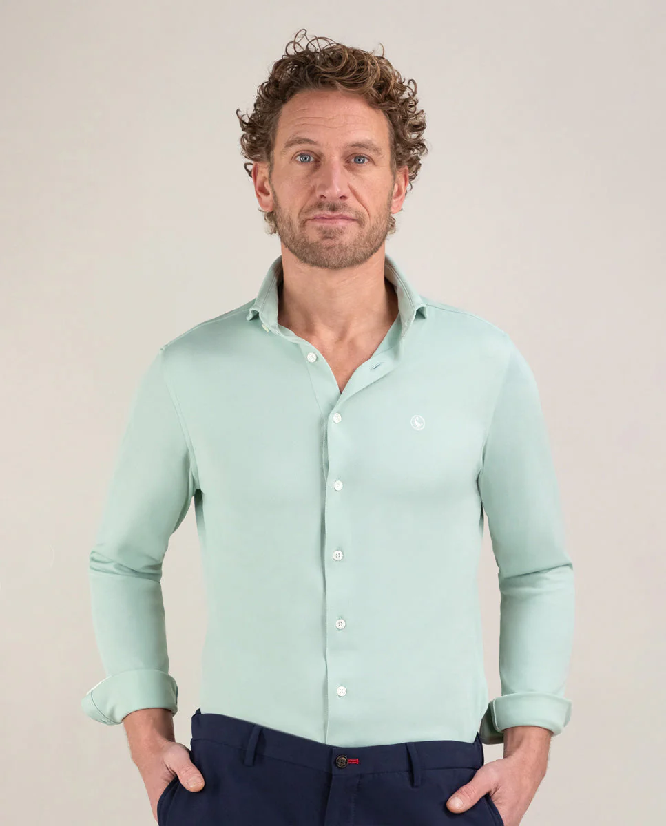Camisa de hombre lisa con tecnología Sepiia confeccionada en 100% poliéster técnico antibacteriano reciclable. Corte Slim Fit, cuello buttondown y cierre con botones. Manga larga terminada en puño simple y logo bordado en el pecho a contraste. Tiene cortes en la espalda que permite ajustarse ligeramente al cuerpo, manteniendo la comodidad. Costura del hombro reforzada, para prevenir el desgaste por el uso. Bajo redondeado. Estos tejidos han sido producidos en España y las prendas han sido confeccionadas en Portugal de una forma sostenible.