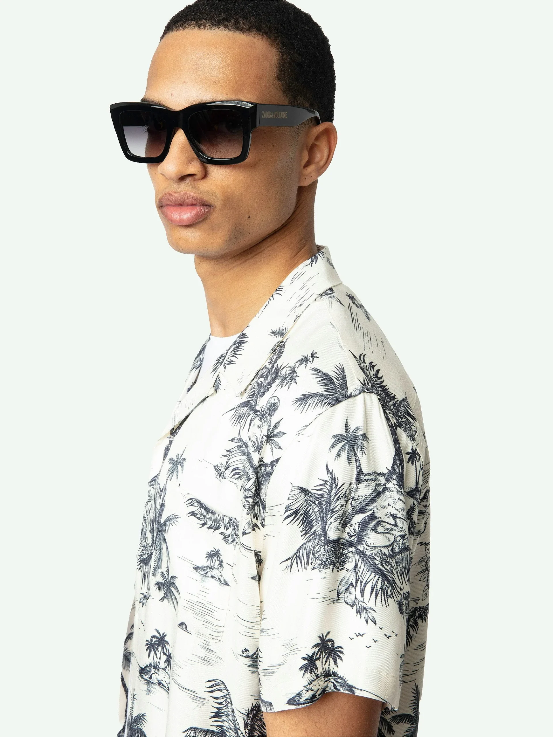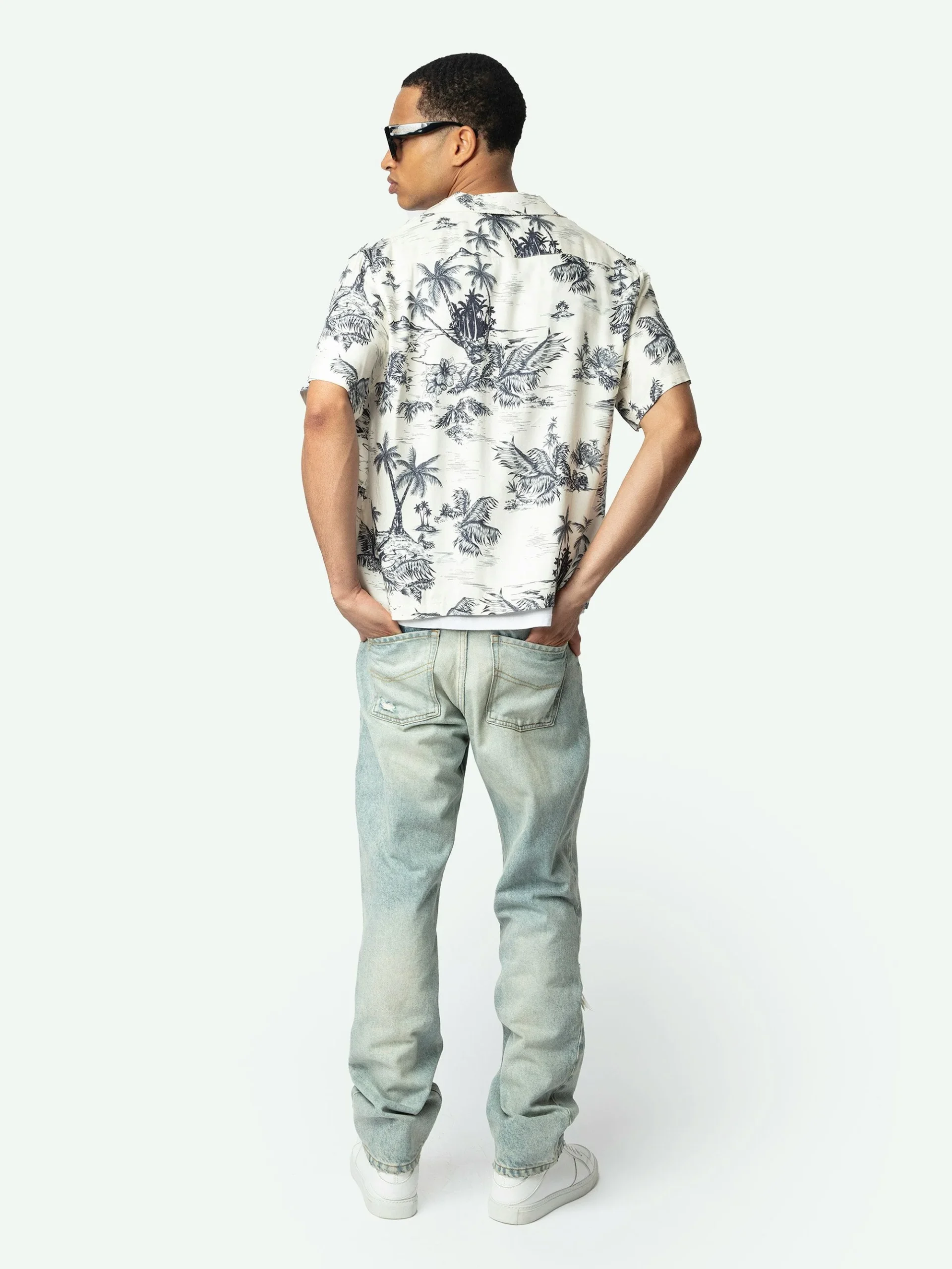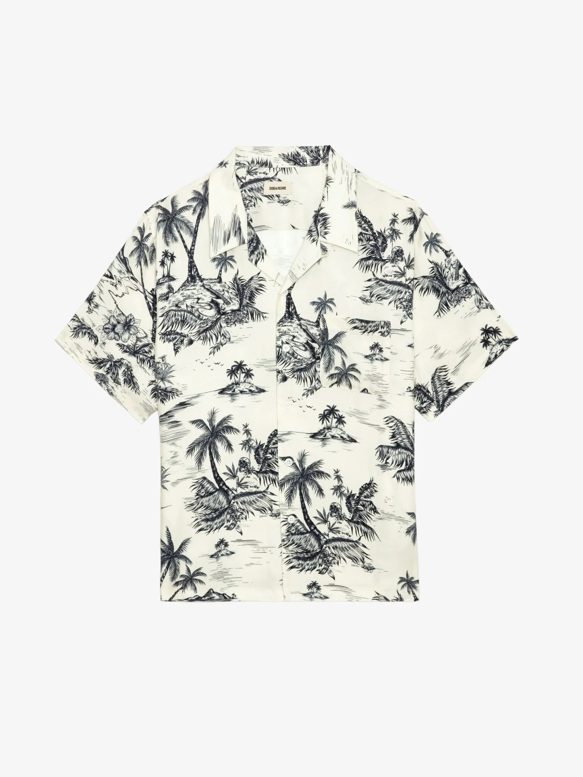 Camisa casual de viscosa estampada con bordado de alas, manga corta y cierre abotonado.