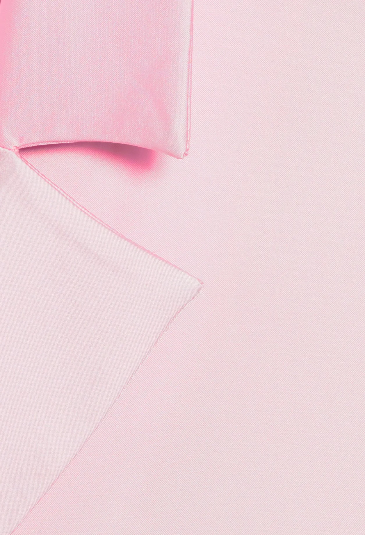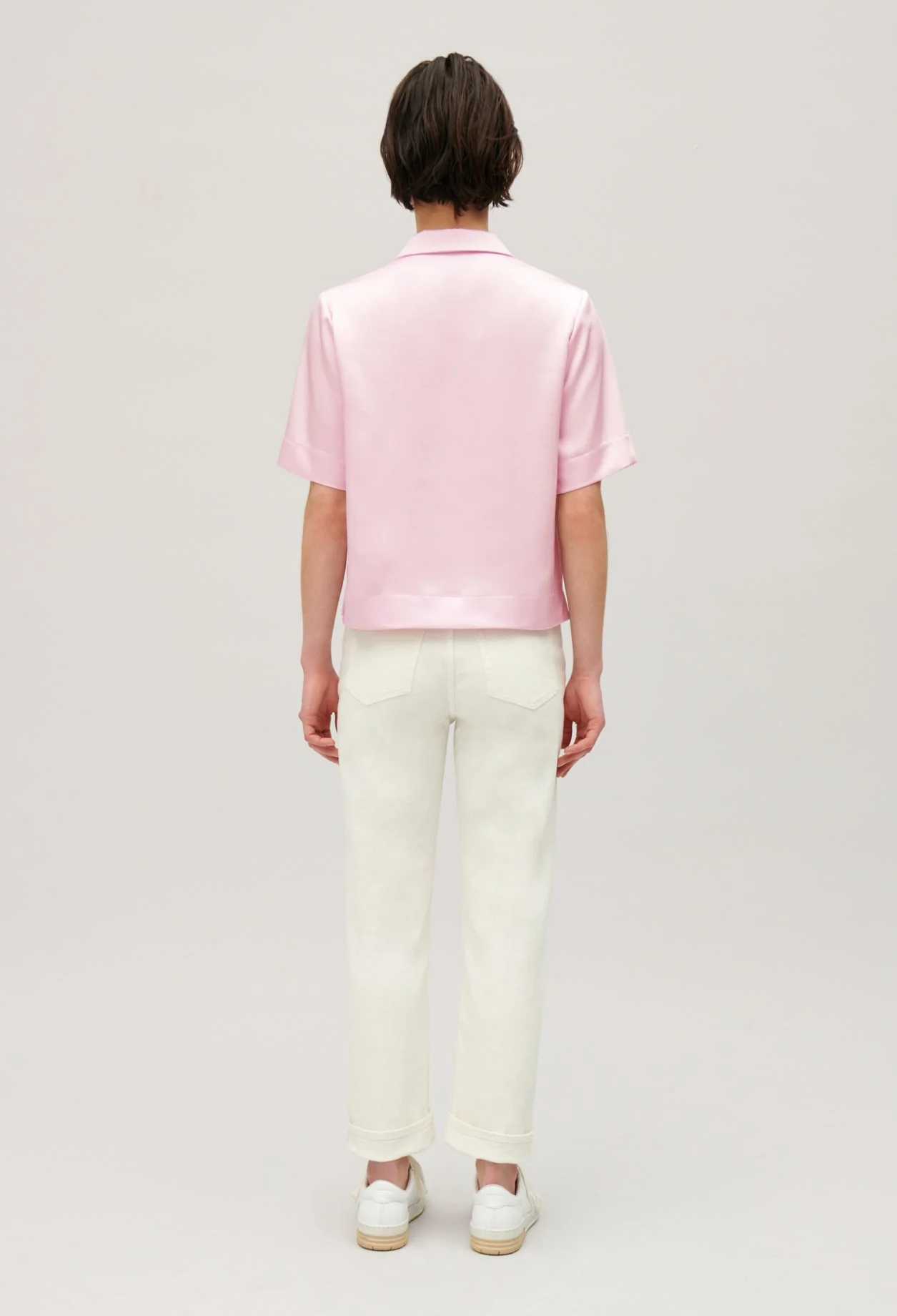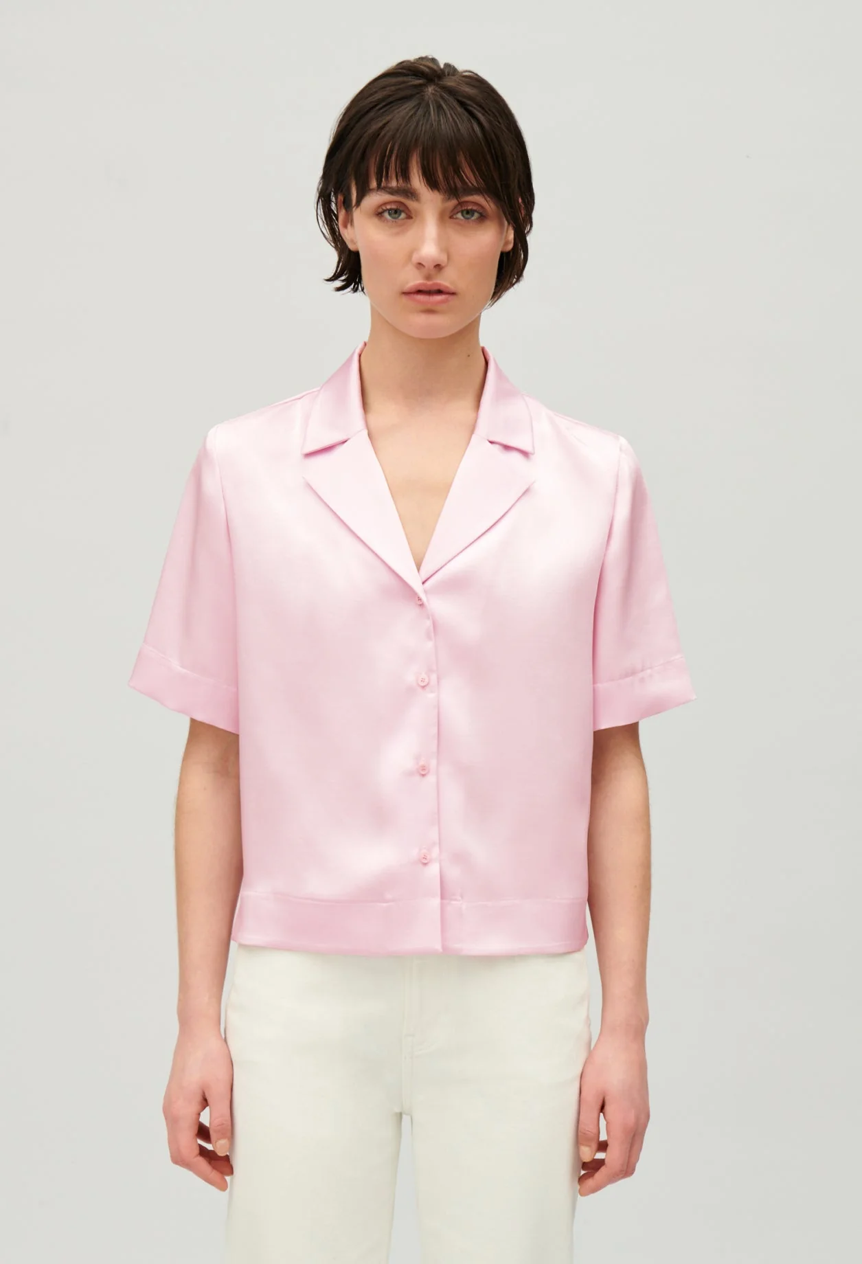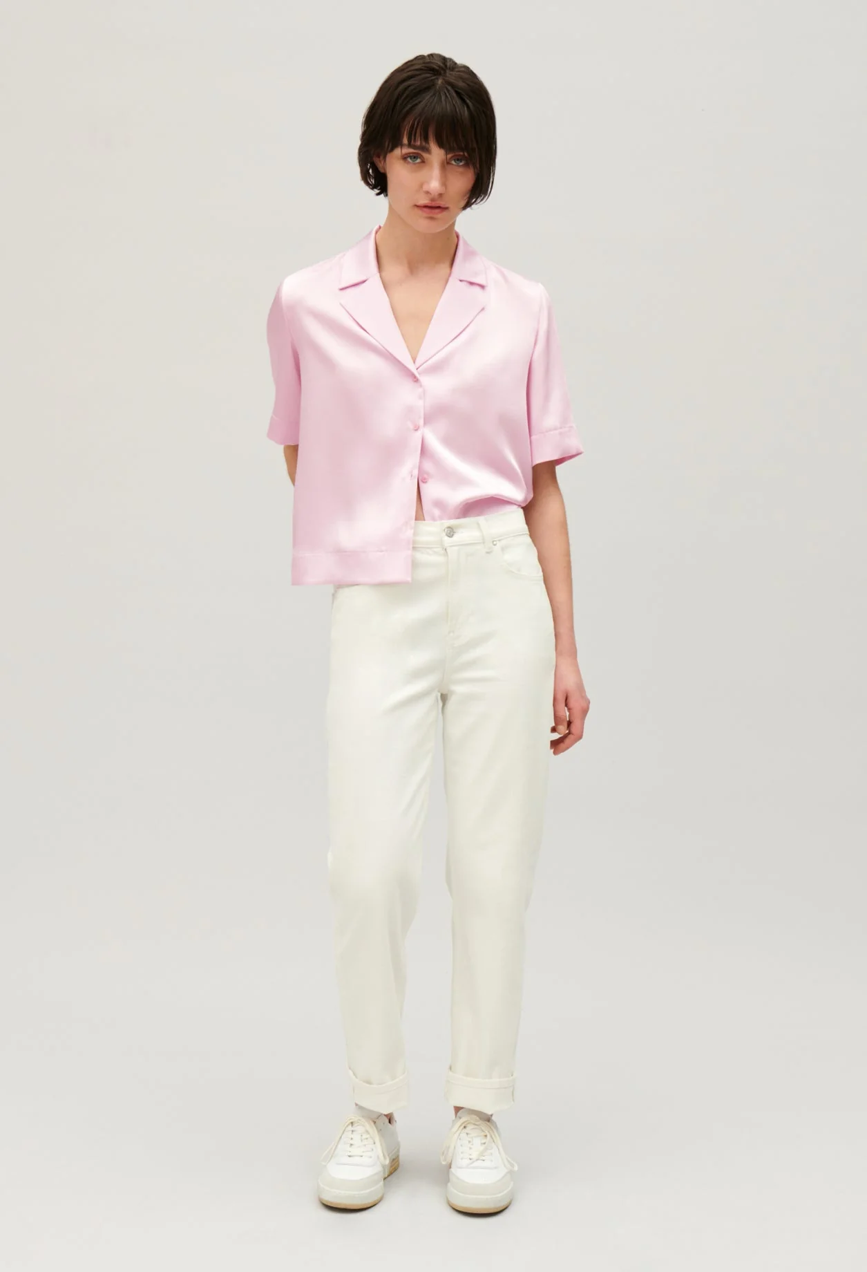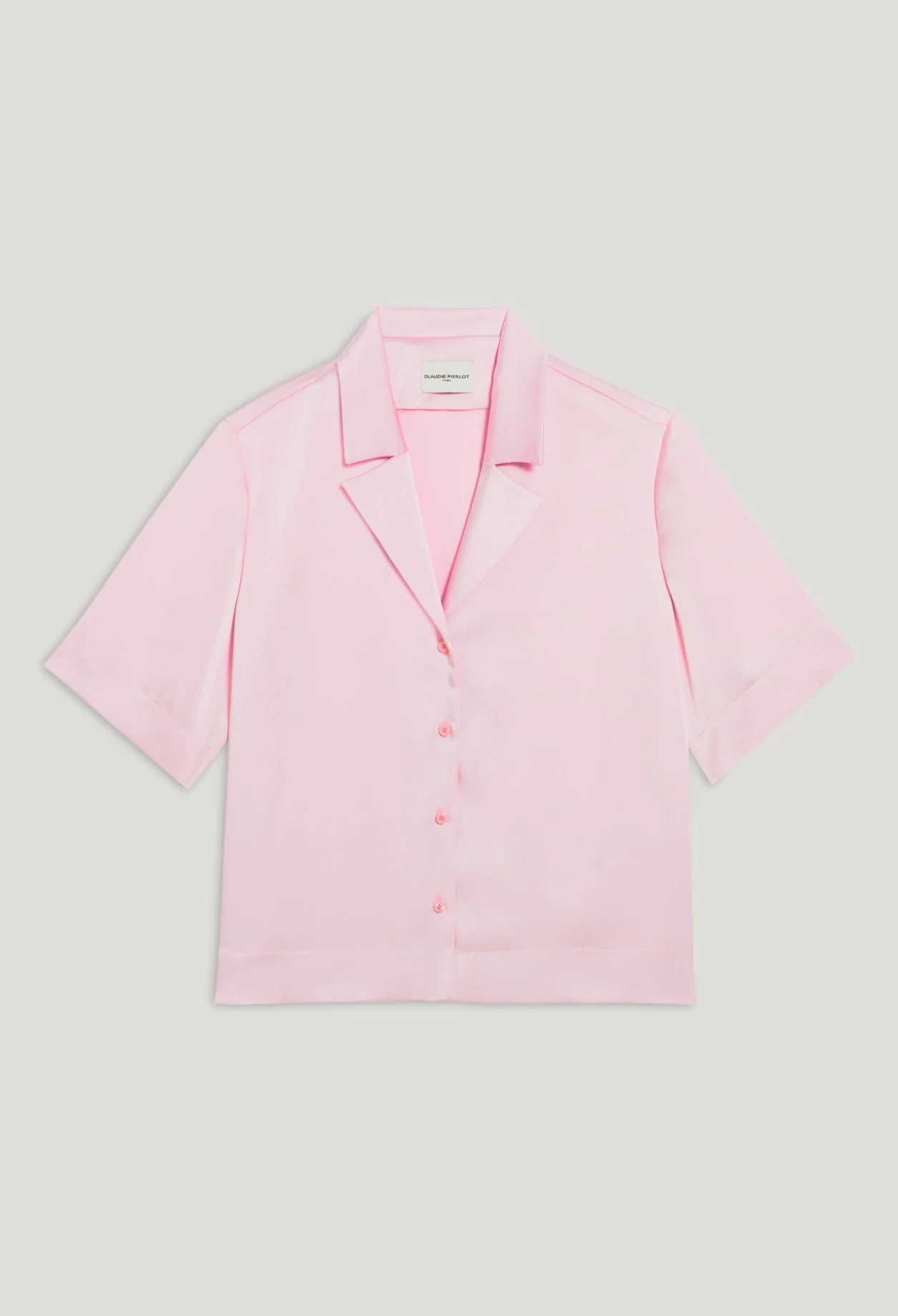 Cuello camisero abierto, manga corta, cierre de botones, pequeñas aberturas laterales, ourlets en la cintura y los bajos de las mangas