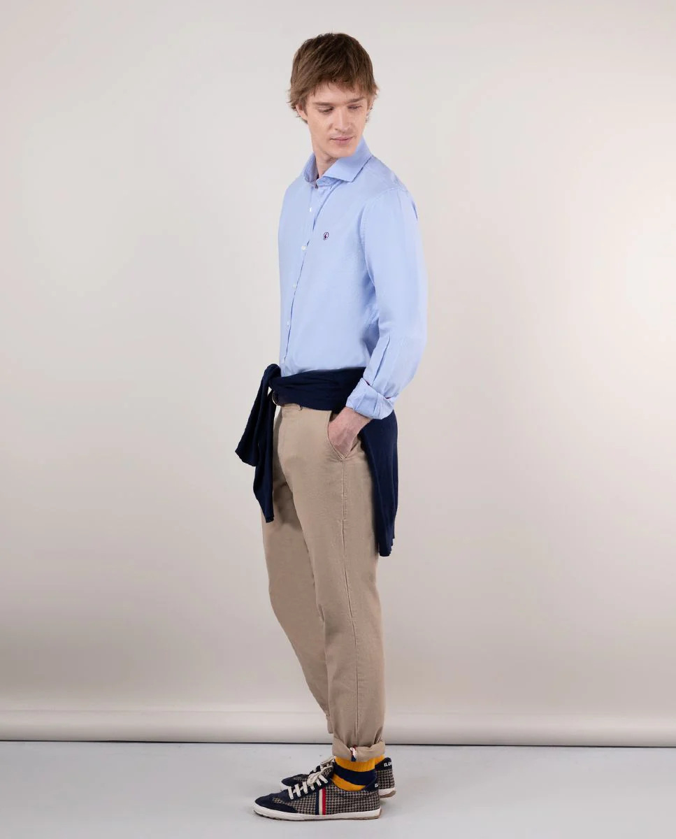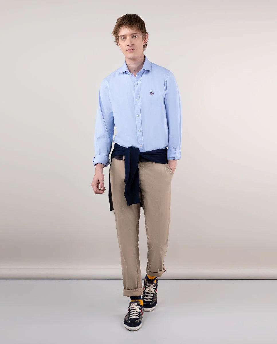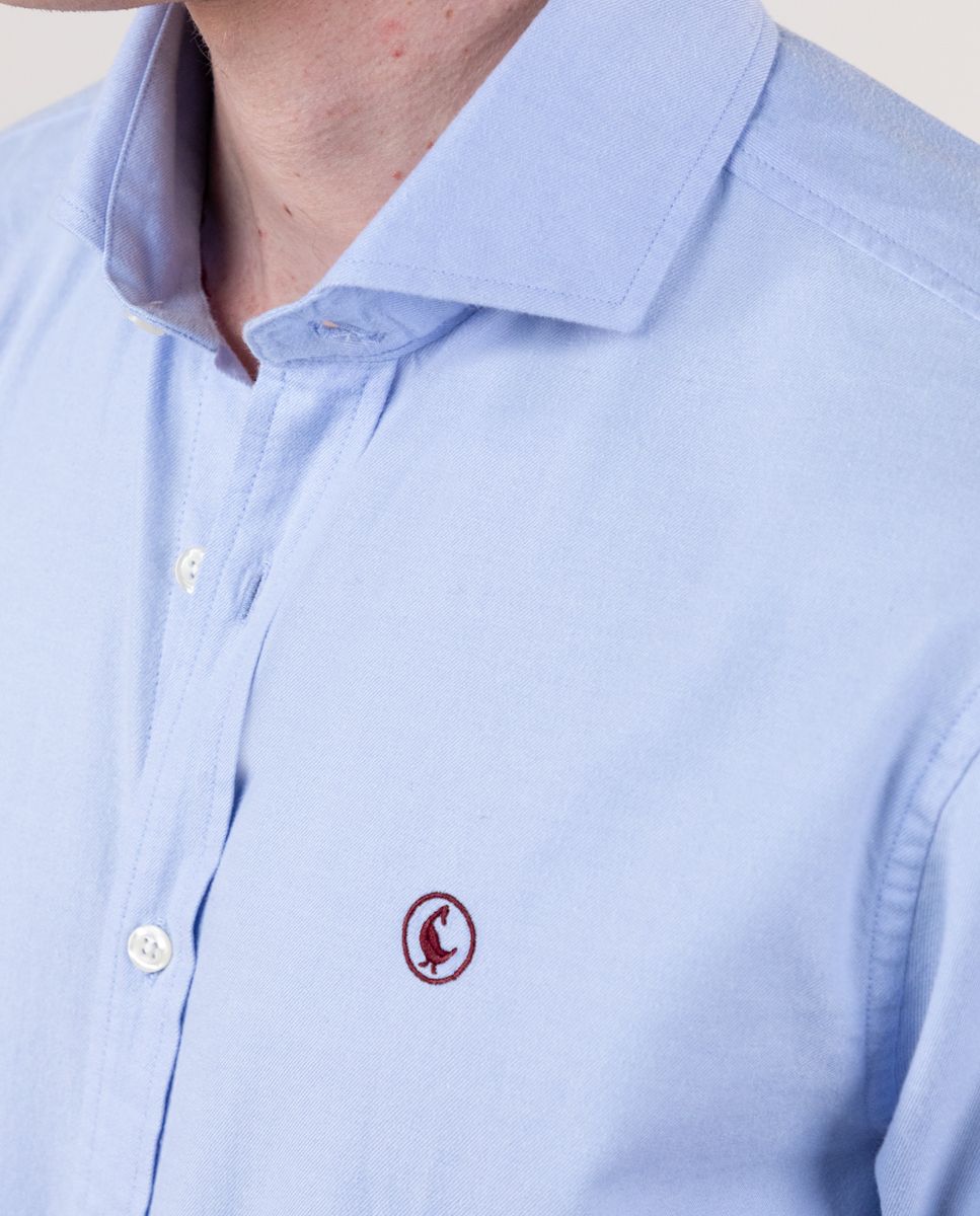 Camisa lisa de hombre confeccionada en 100% algodón con acabado peach. Corte Regular Fit, cuello spread y cierre con botones. Manga larga terminada en puño simple y logo en el pecho bordado.