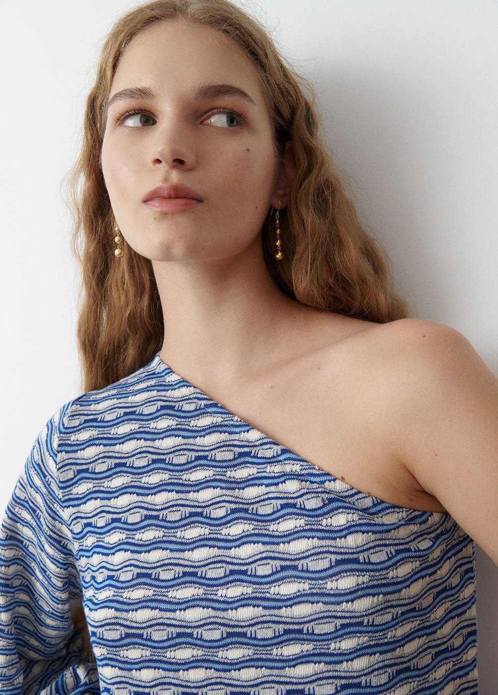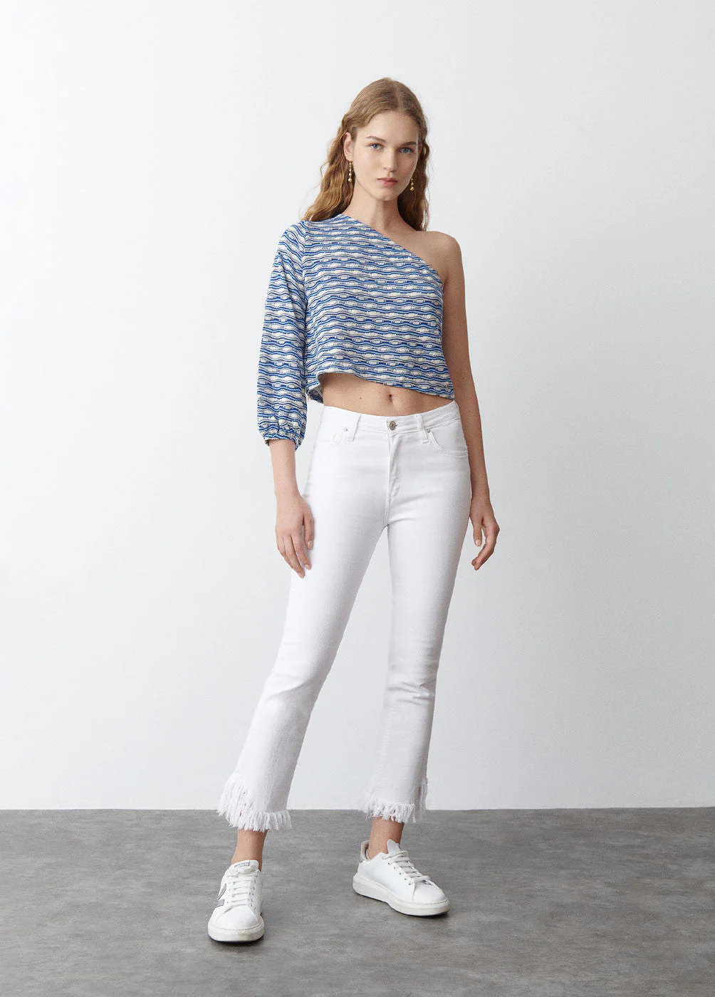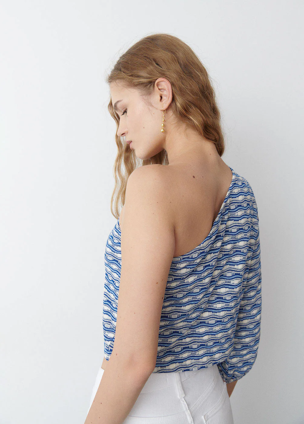 Camiseta asimétrica estampada con una manga larga abullonada.