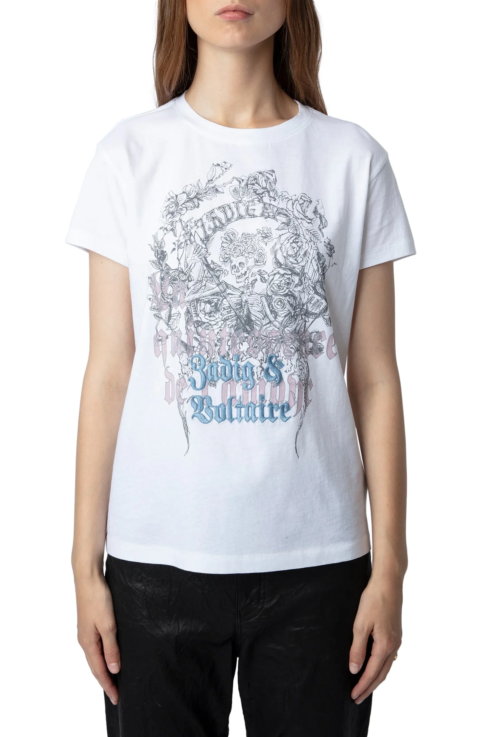 Prenda favorita de esta temporada, esta camiseta boxy presenta un cuello joya con strass de color rosa, amarillo y blanco. Combínela con una falda y unas bailarinas para un look elegante y natural.