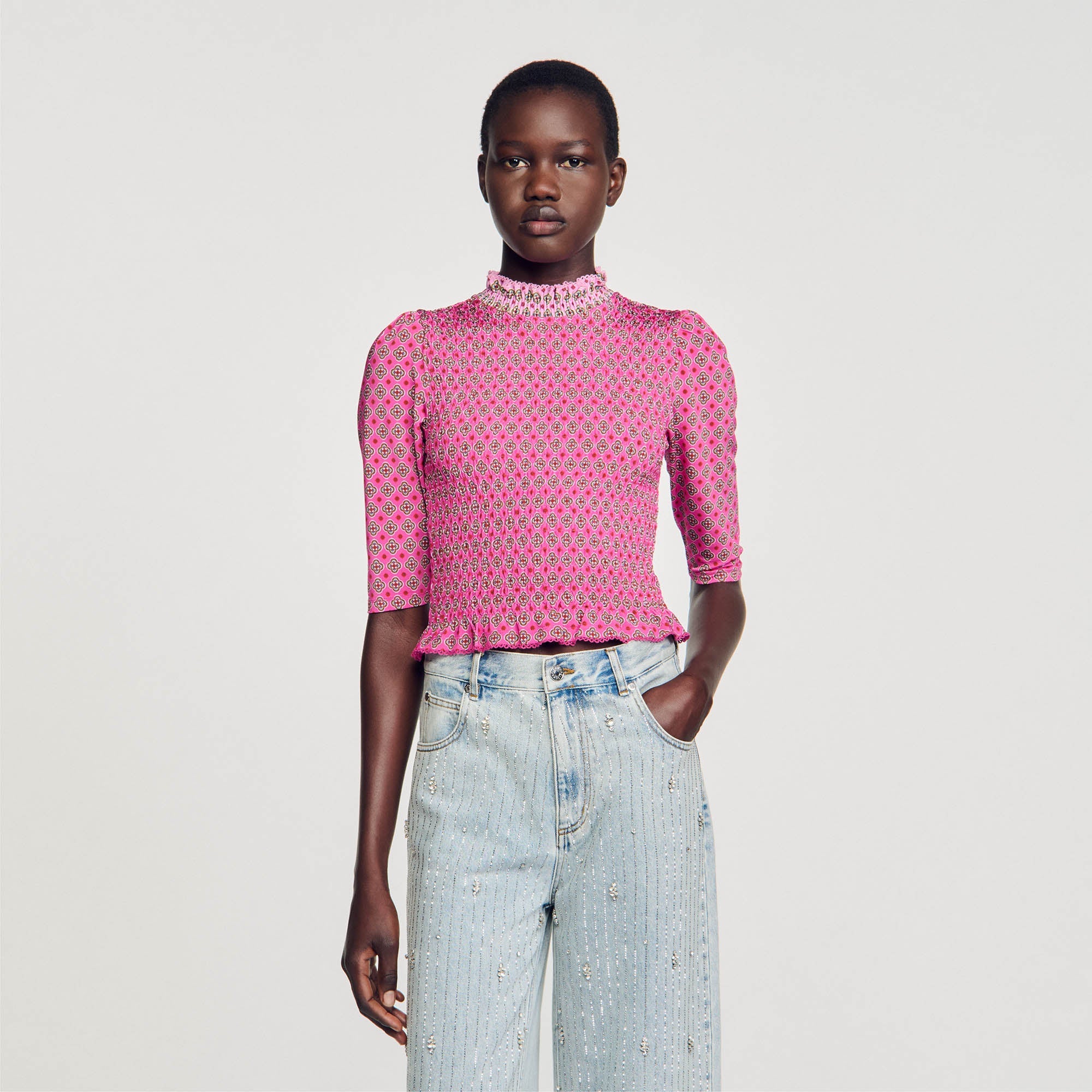 Camiseta fruncida con cuello redondo subido, manga tres cuartos y estampados en contraste.