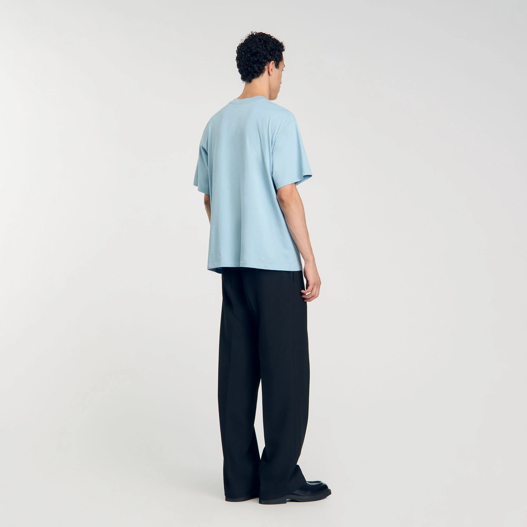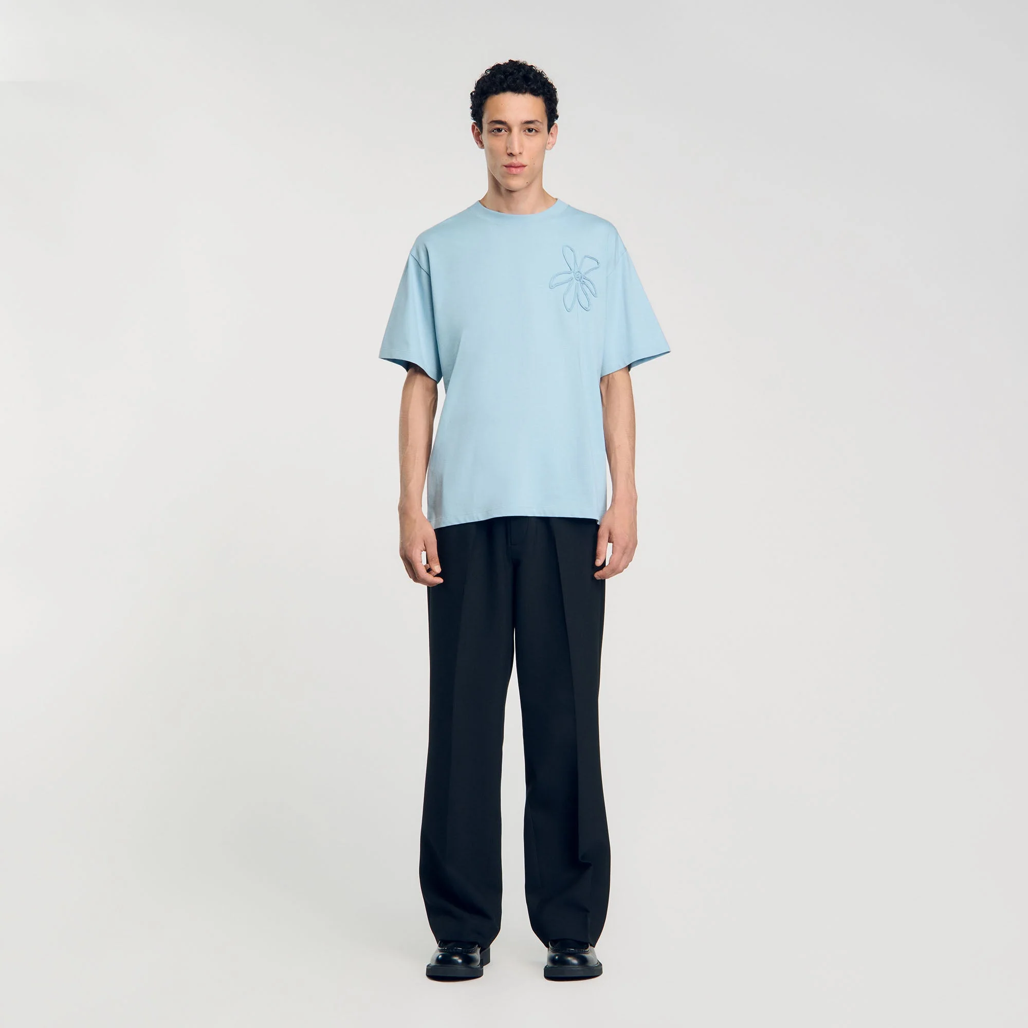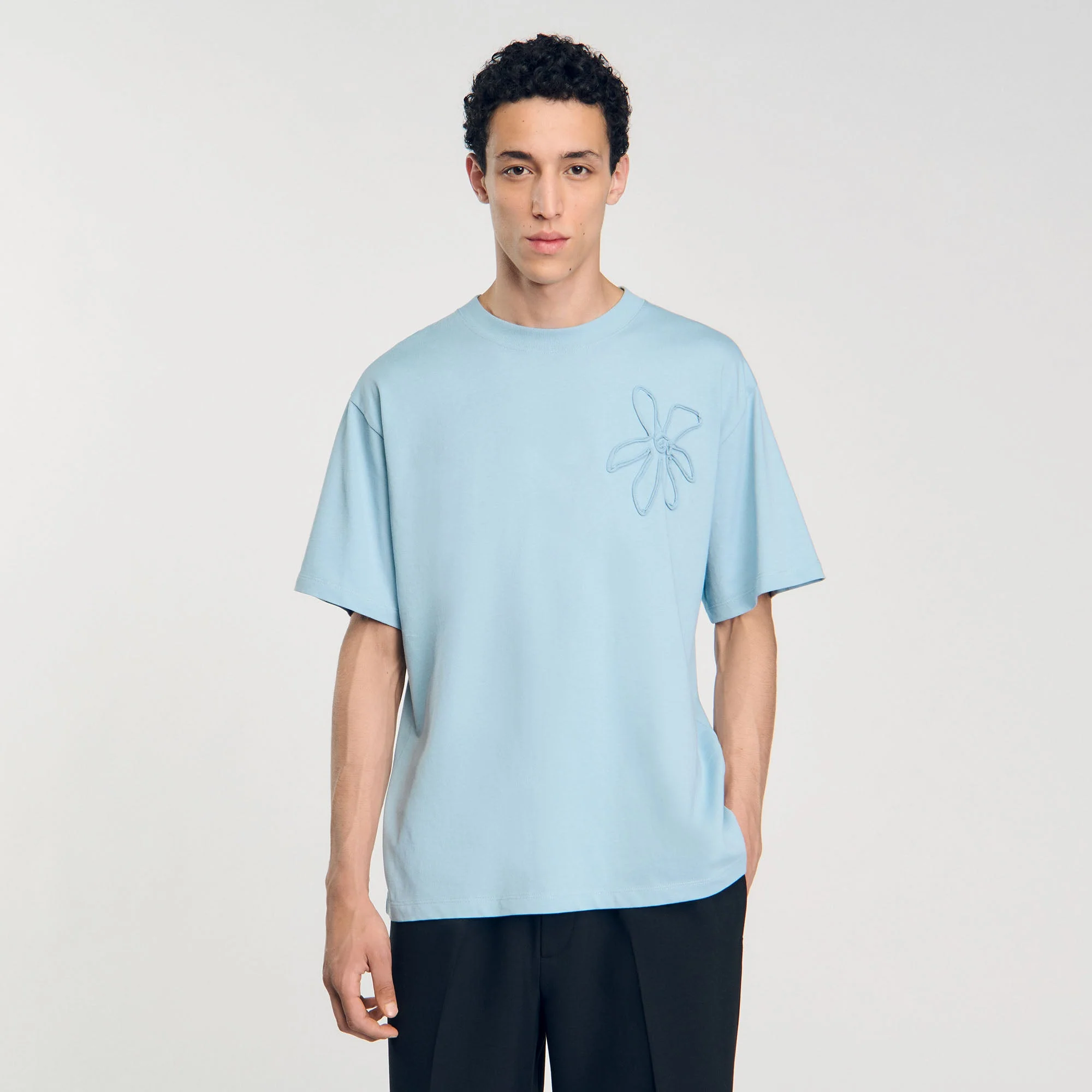 Camiseta oversize con cuello redondo, manga corta y aplique de flor al bies en el pecho.