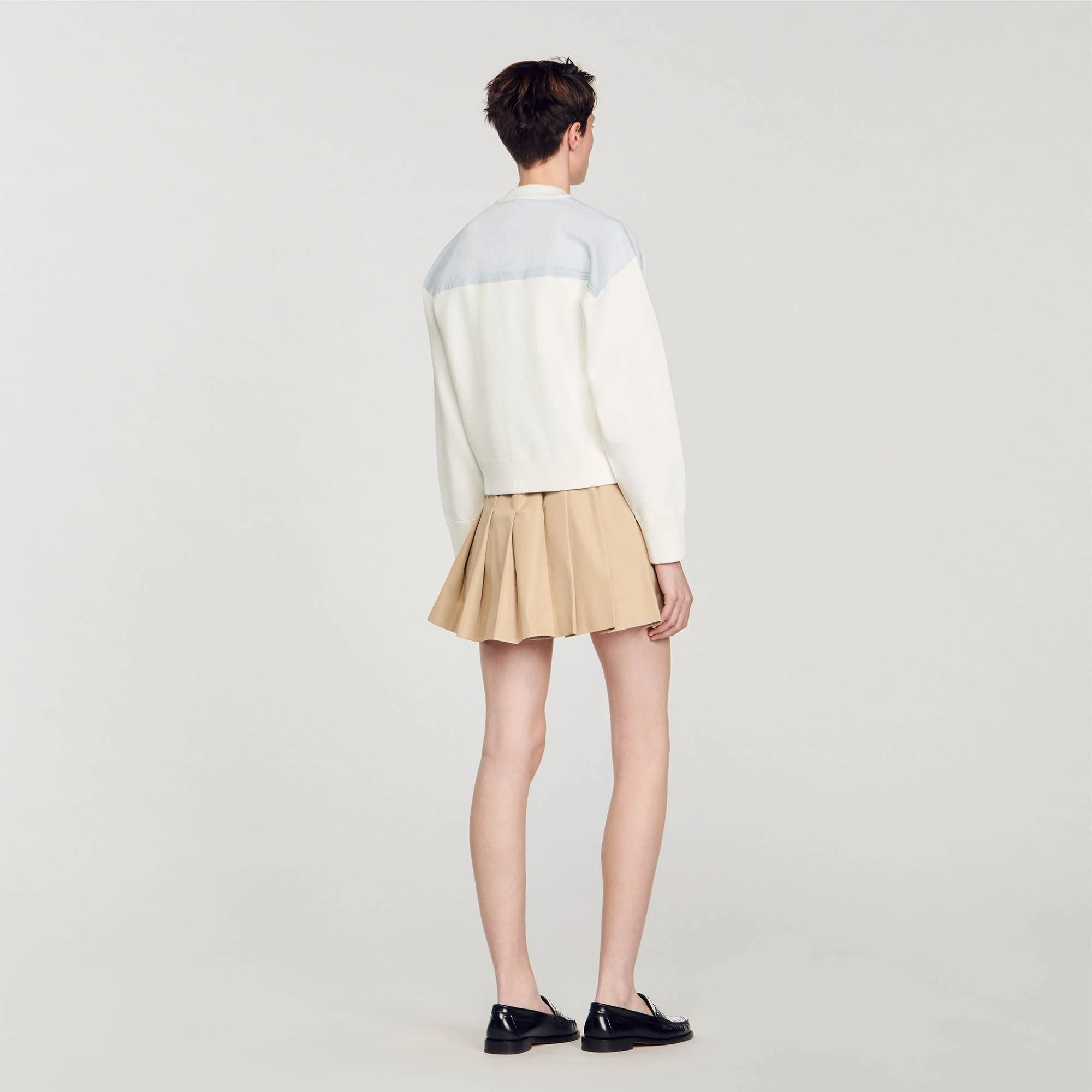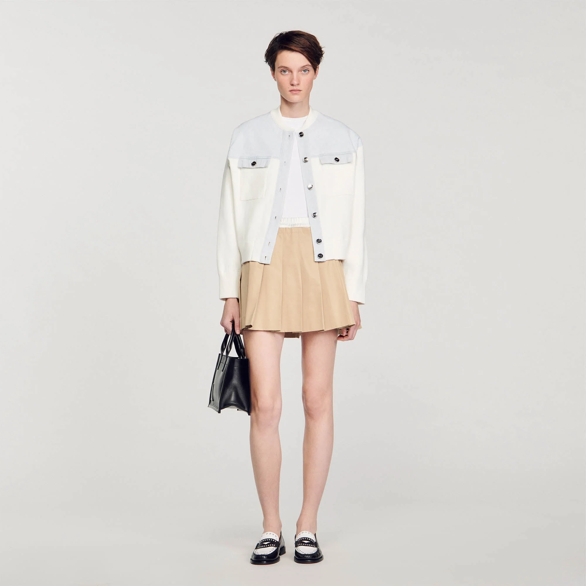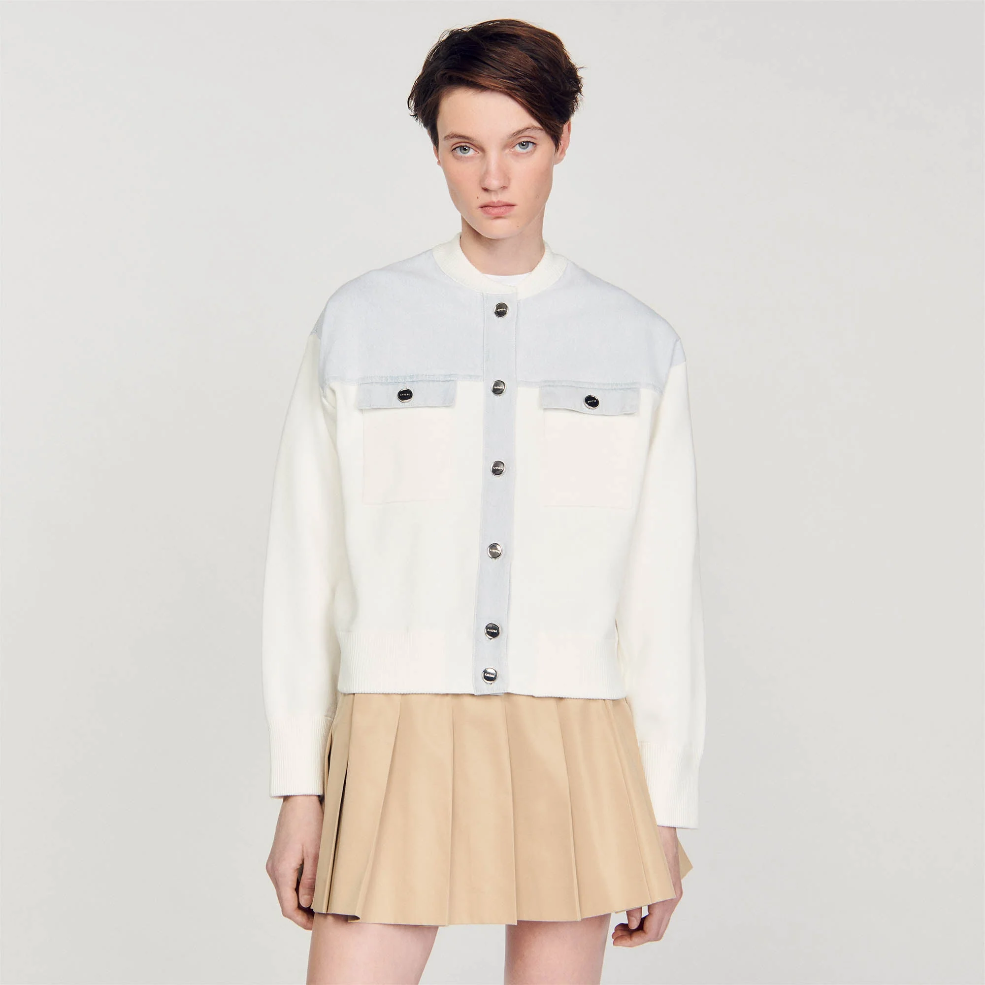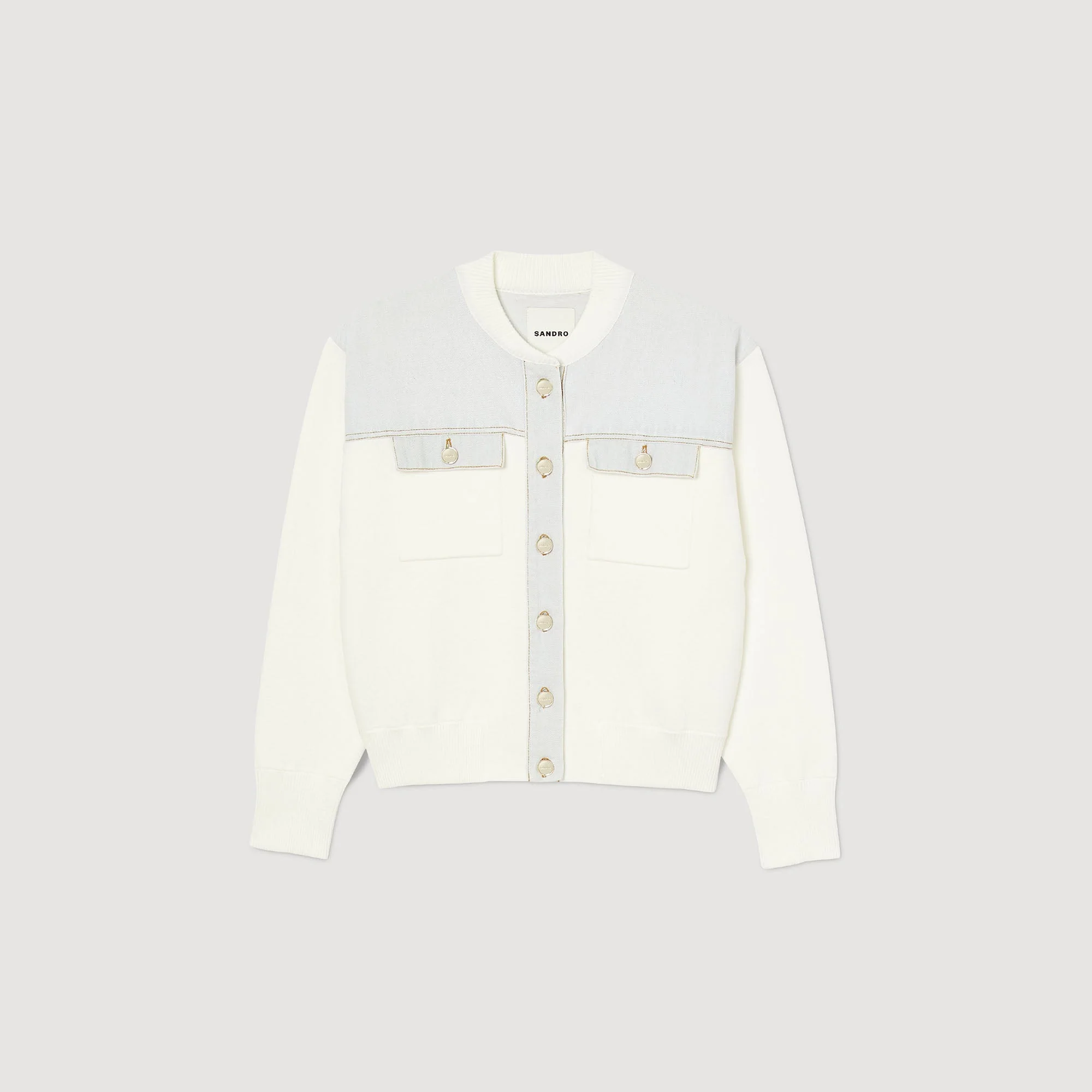 Cardicoat bimaterial estilo chaqueta de béisbol con cuello redondo, mangas largas, cierre de botones, bolsillos de parche con solapa en el pecho y decorado con insertos de tejido vaquero en los hombros con pespuntes en contraste.