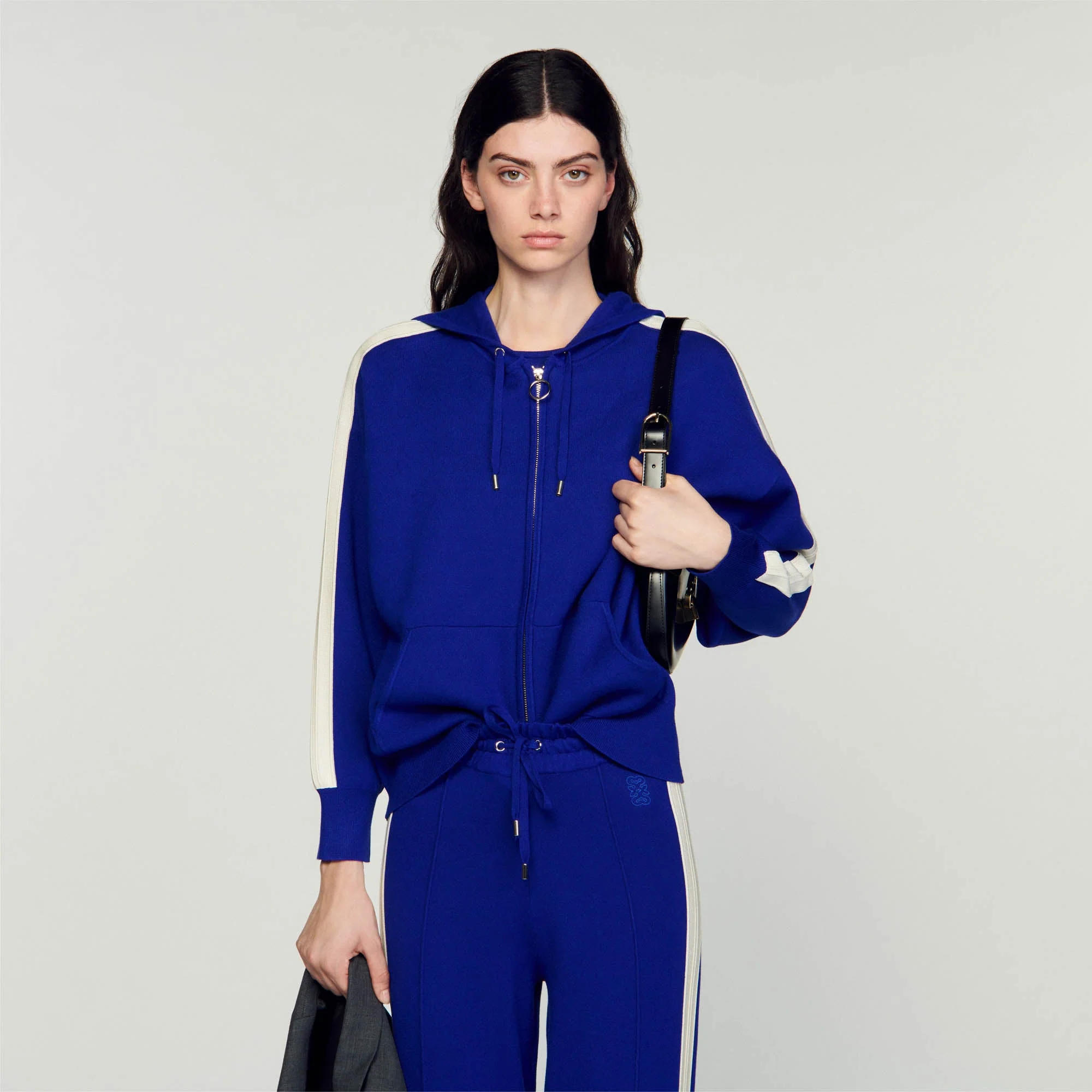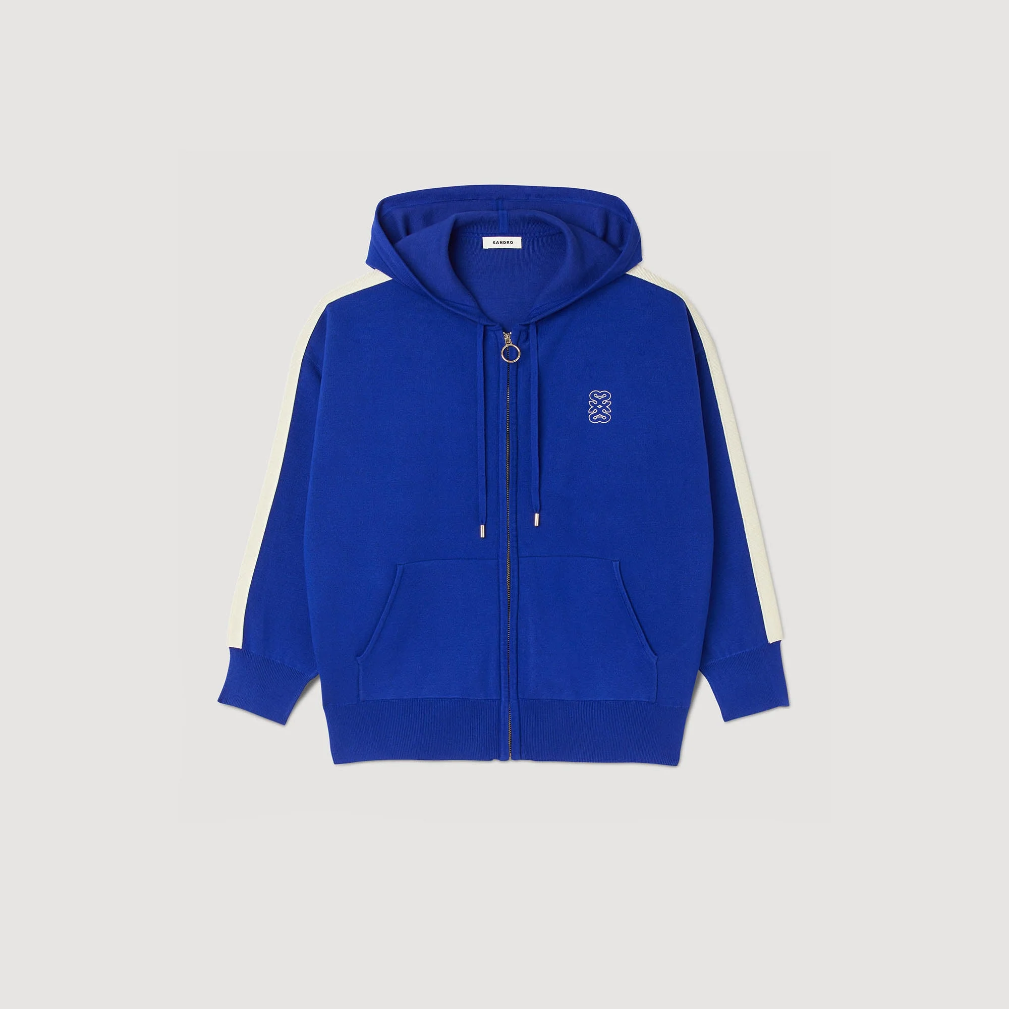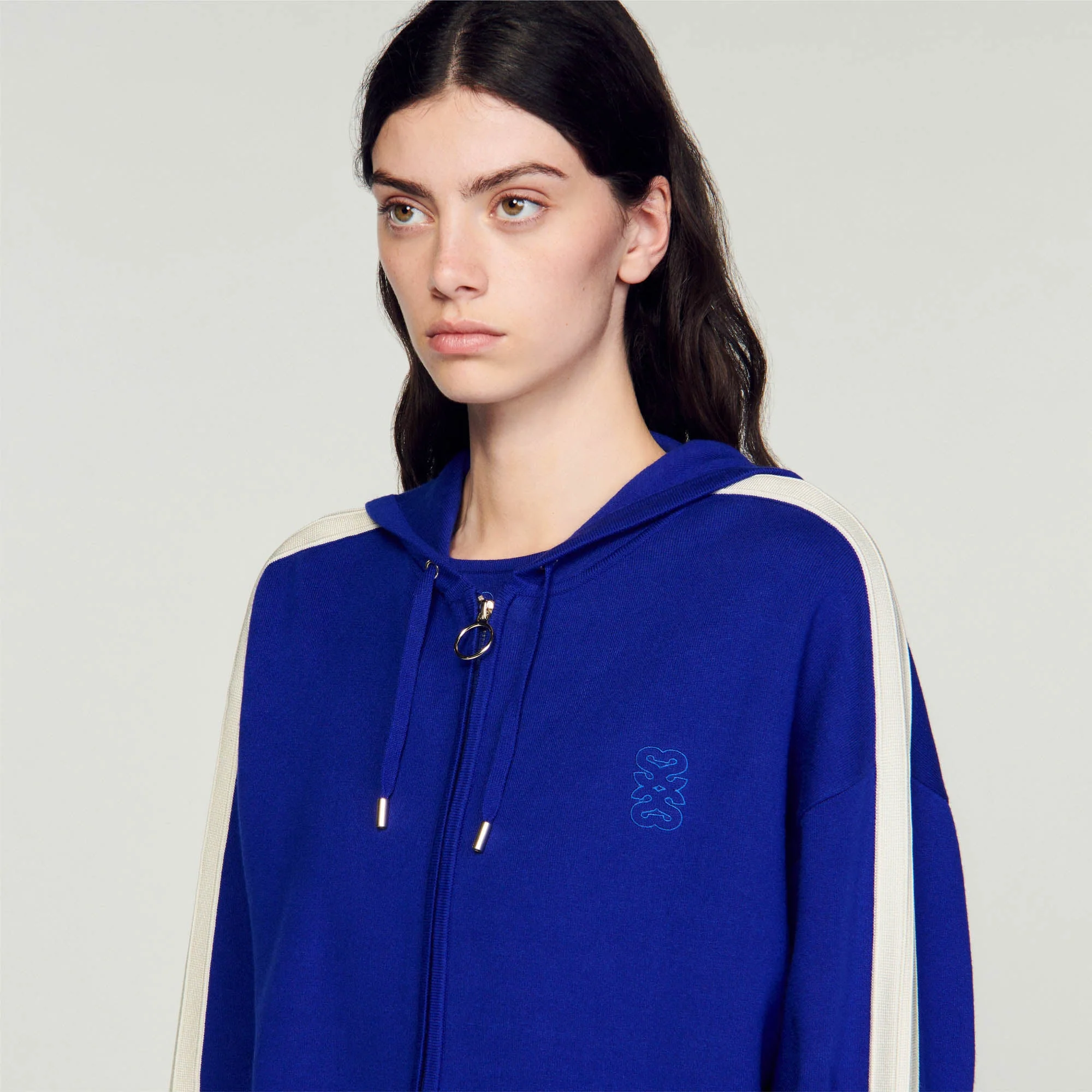 Cárdigan de punto con cremallera, capucha y mangas largas, decorado con bandas en contraste en los hombros y un bordado de doble S en la parte delantera.