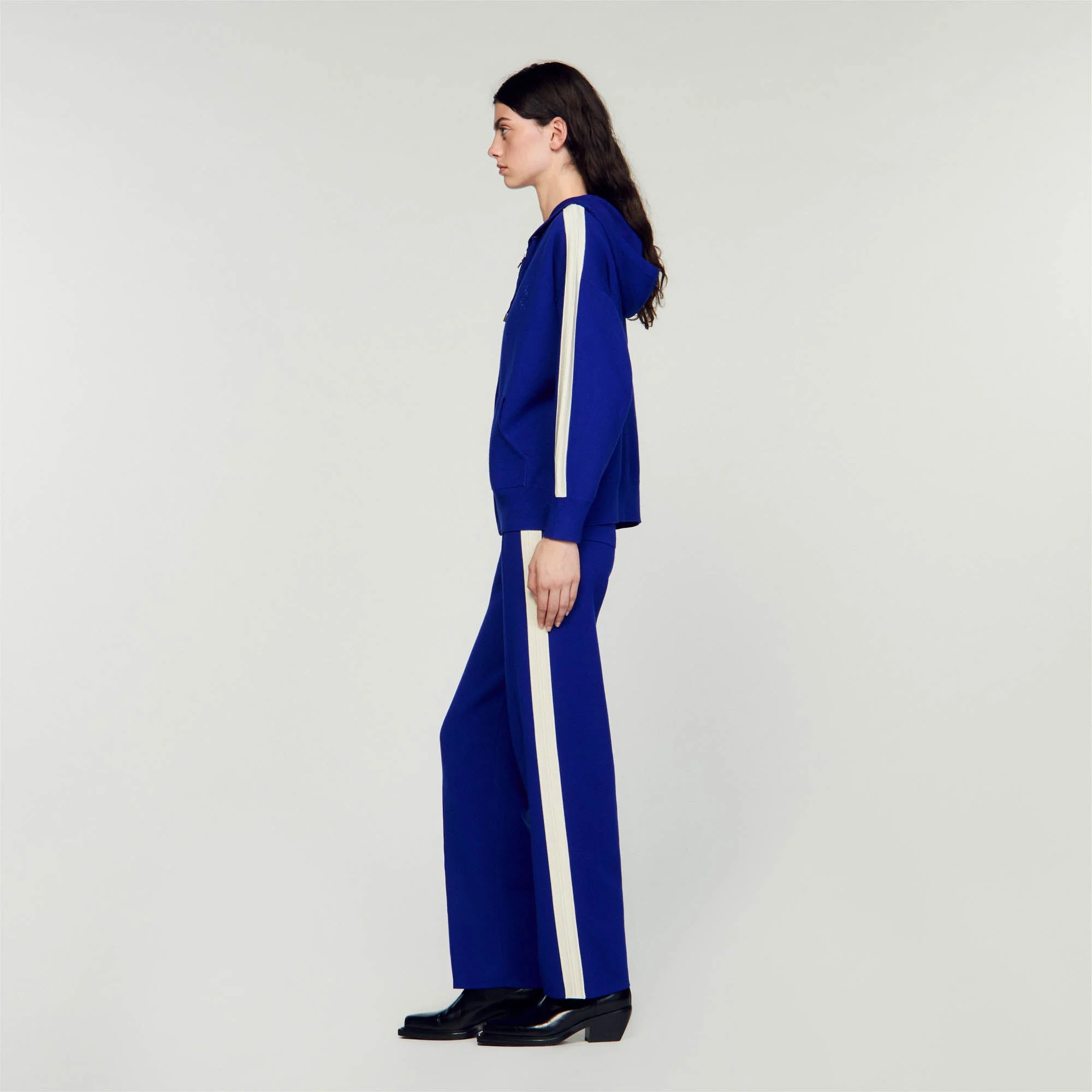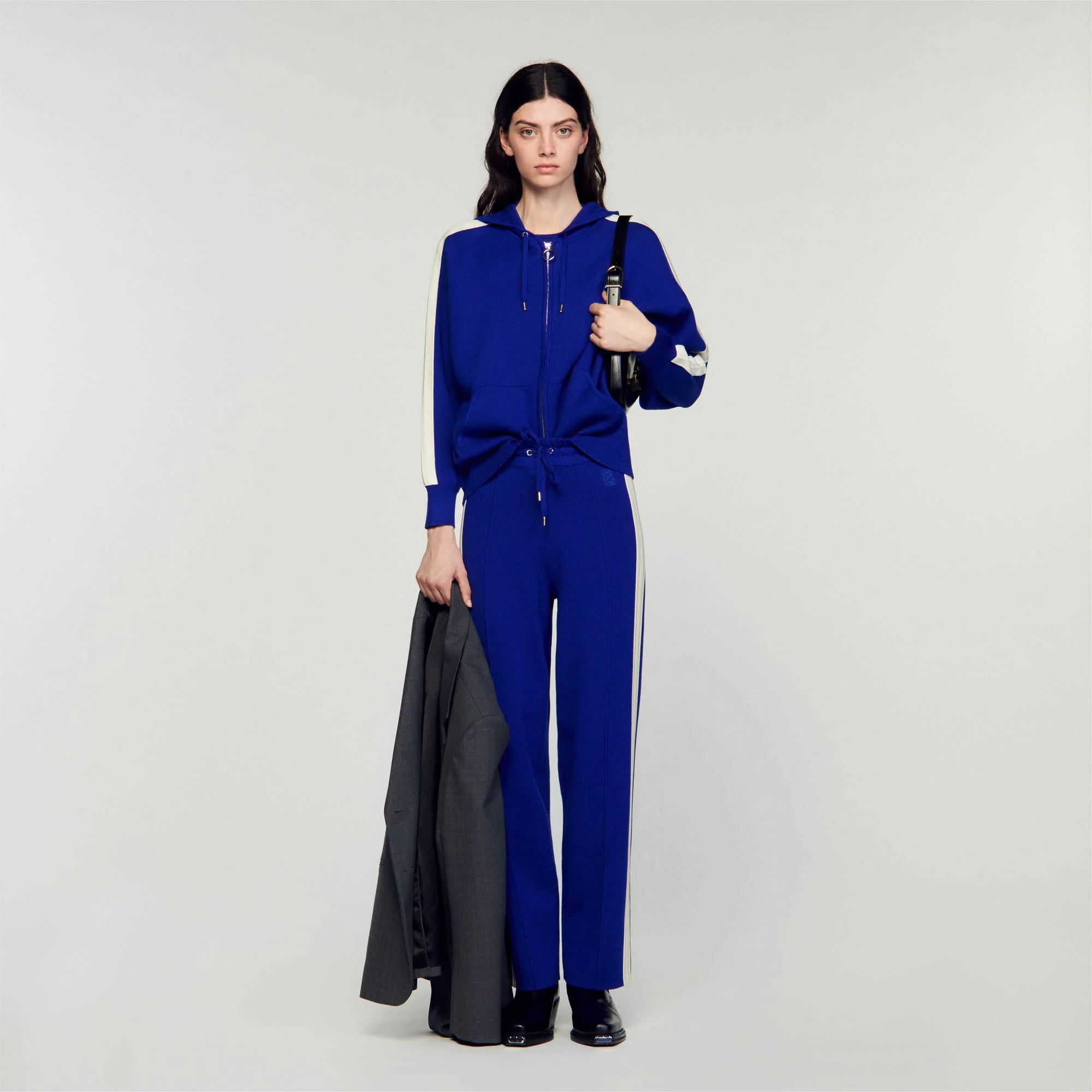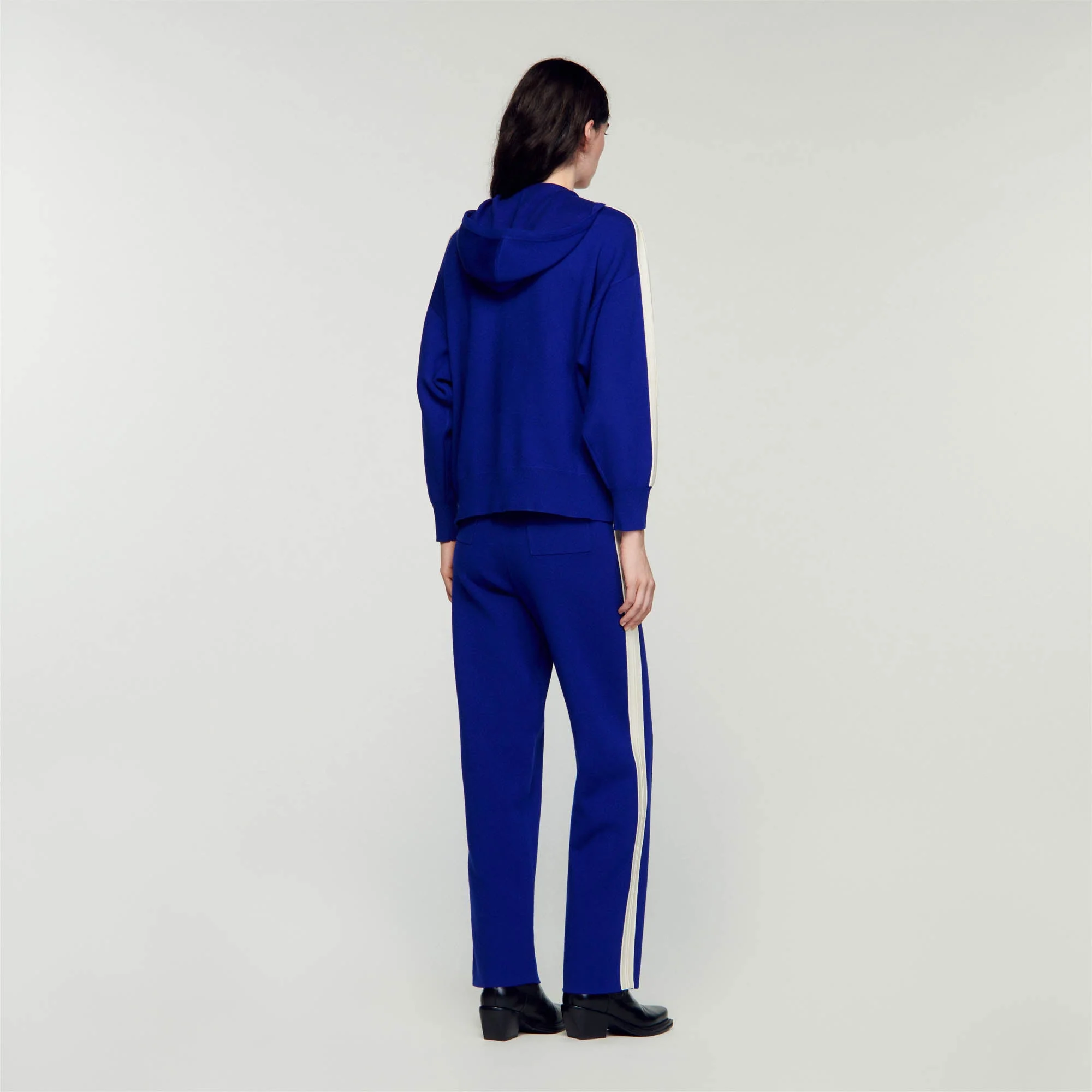 Cárdigan de punto con cremallera, capucha y mangas largas, decorado con bandas en contraste en los hombros y un bordado de doble S en la parte delantera.