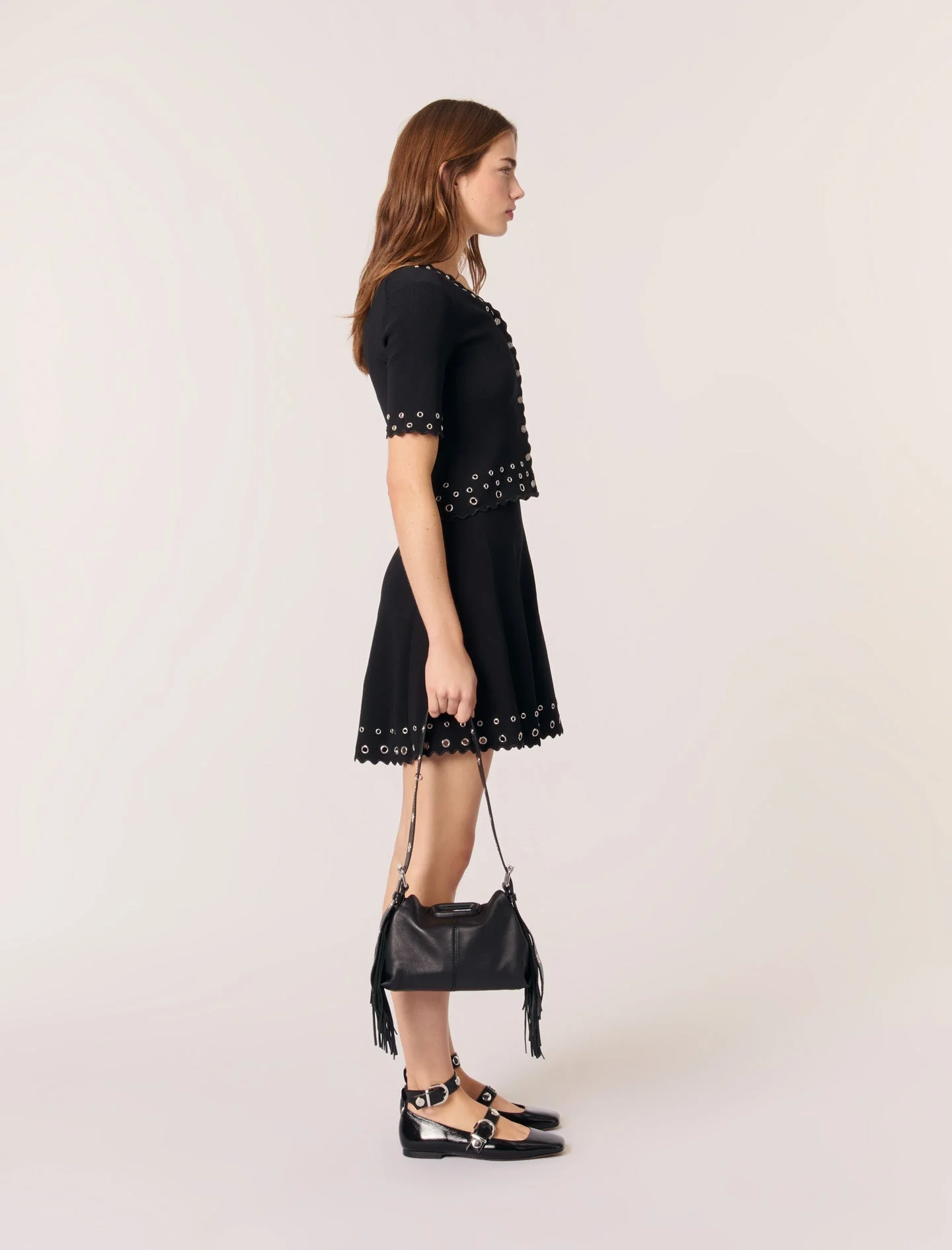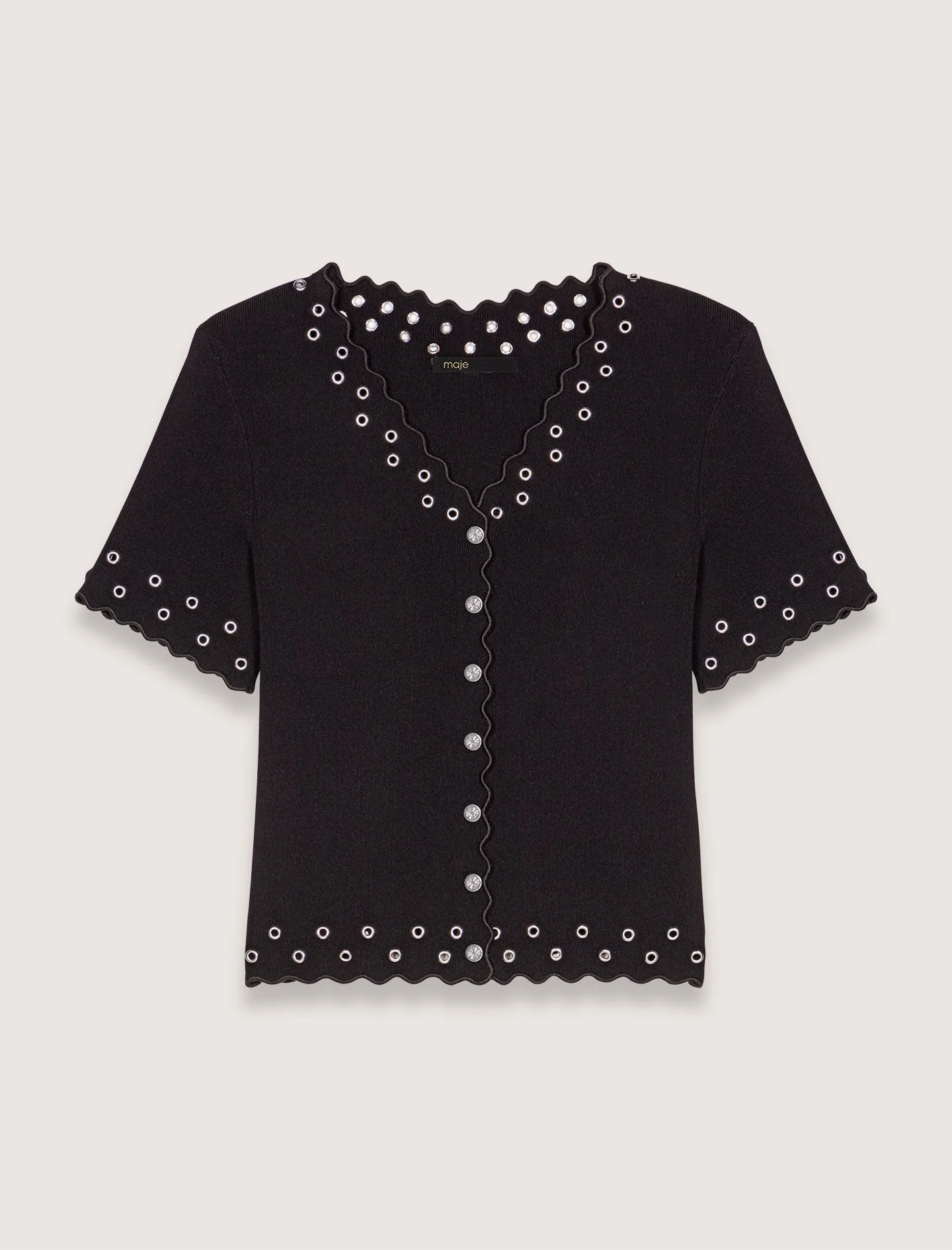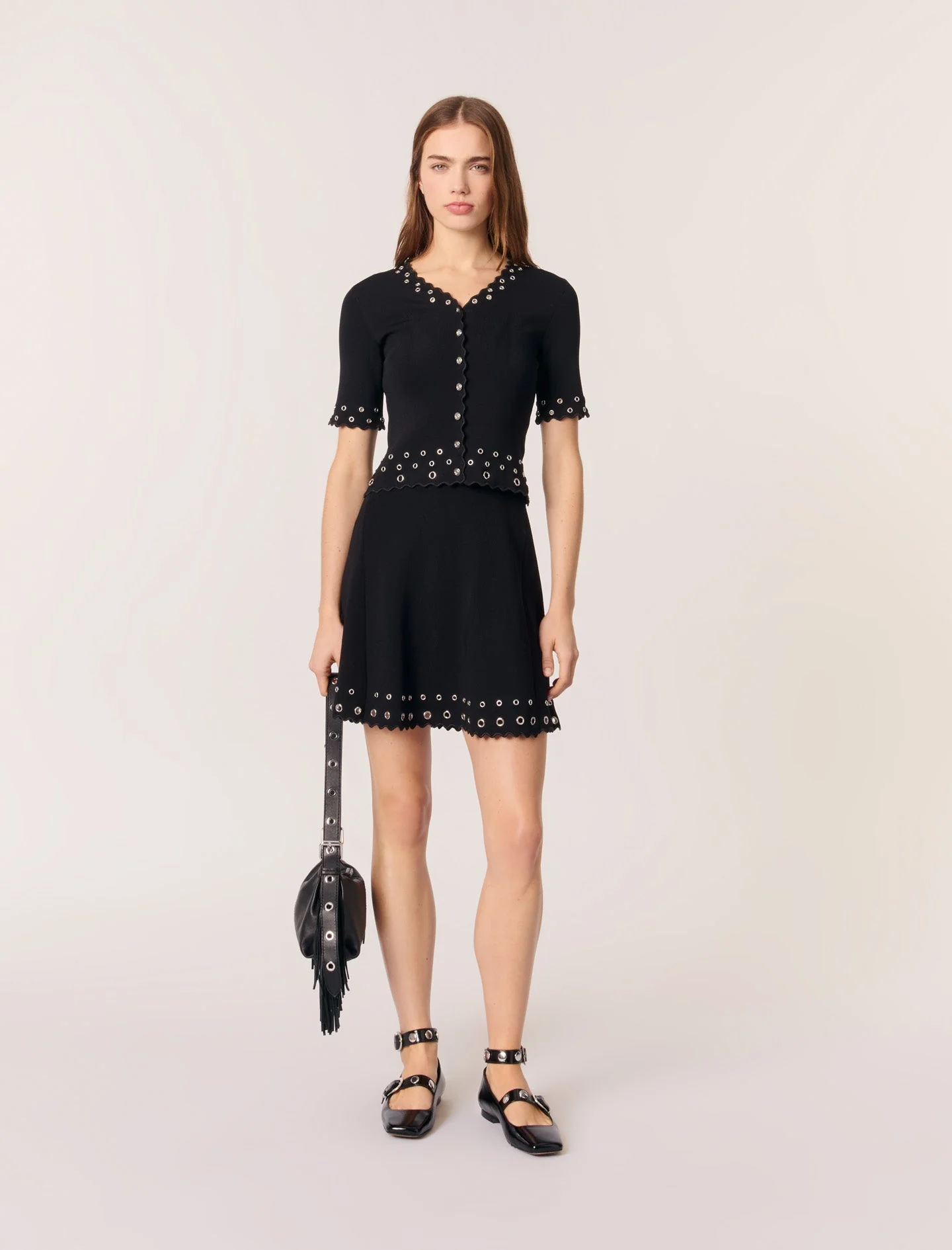 Confeccionado en punto elástico, este cárdigan corto crea un llamativo contraste con sus bordes festoneados, remaches plateados y detalles calados.