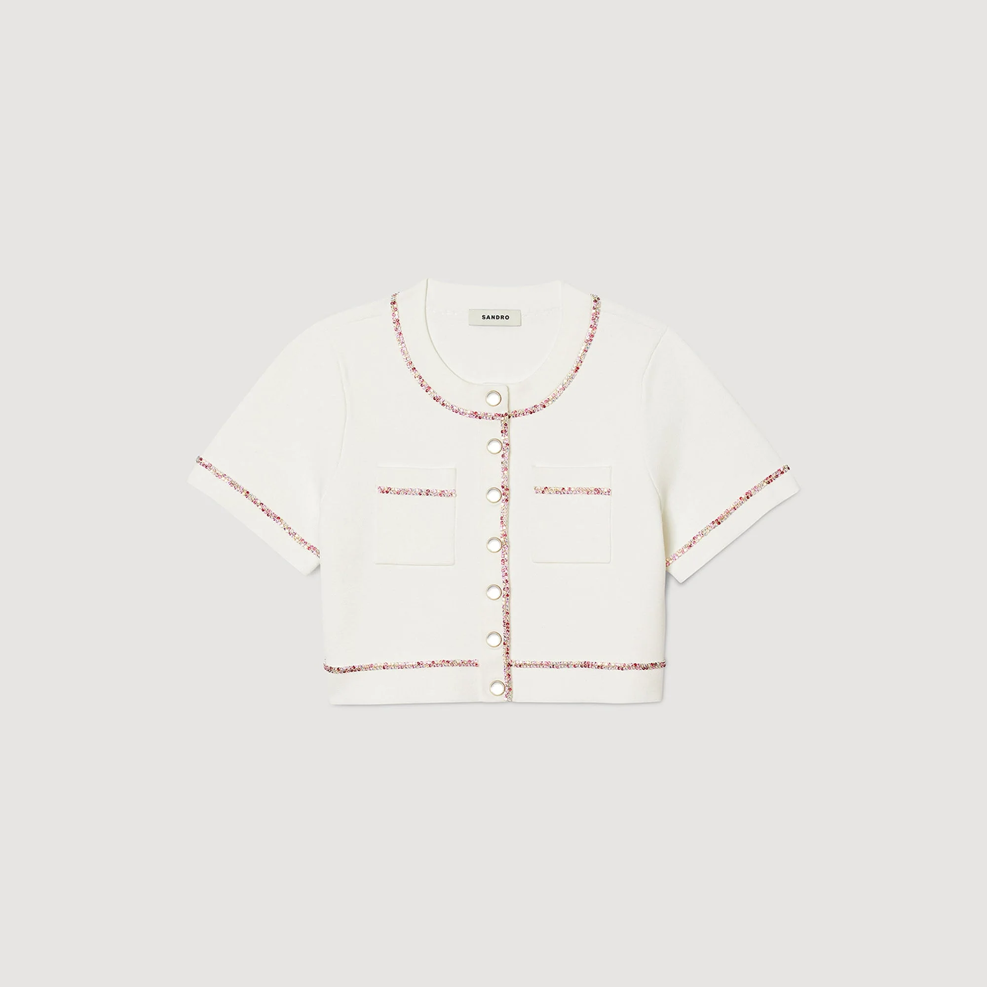 Cárdigan corto con cuello redondo y manga corta con estrás multicolor y con bolsillos tipo parche en el pecho.