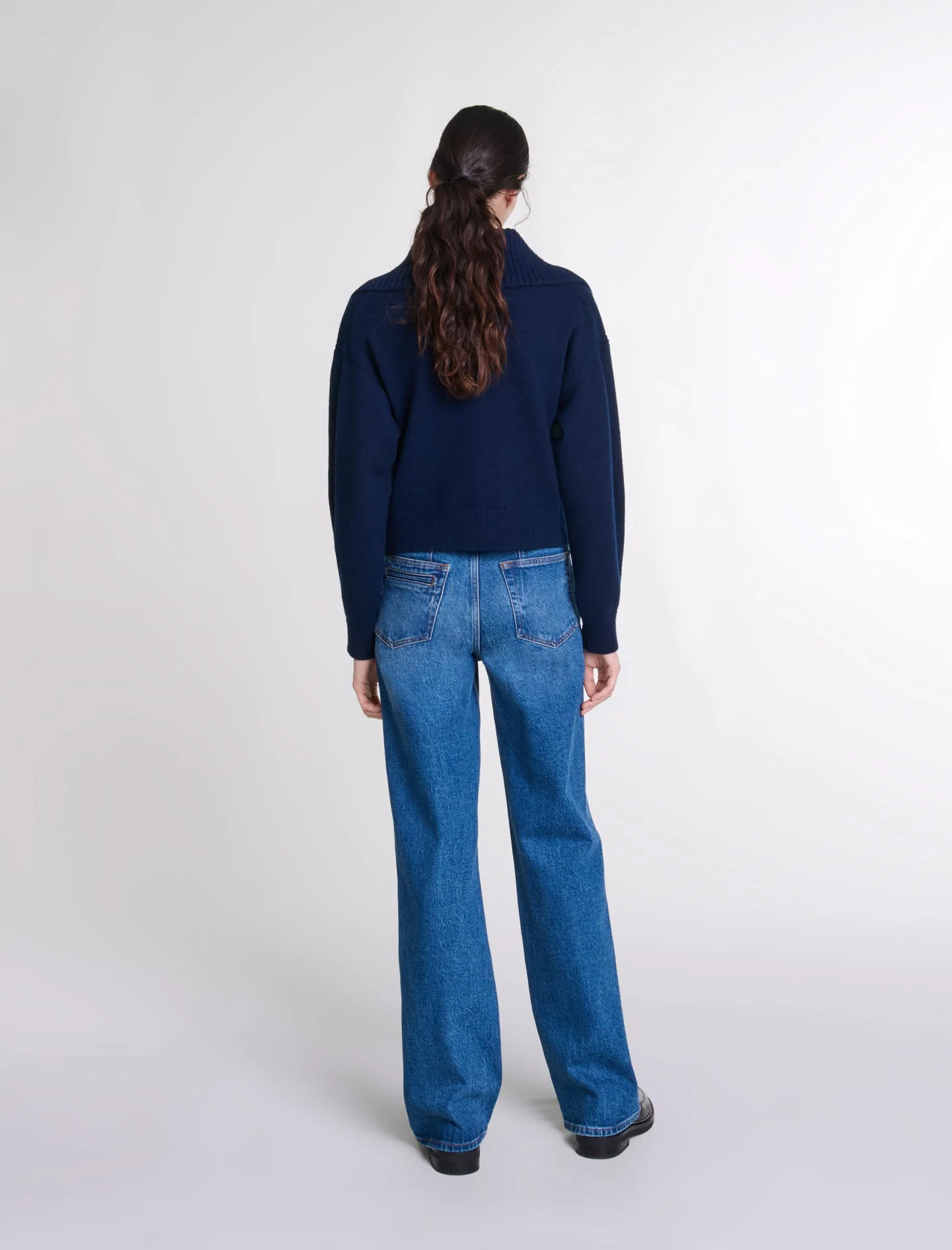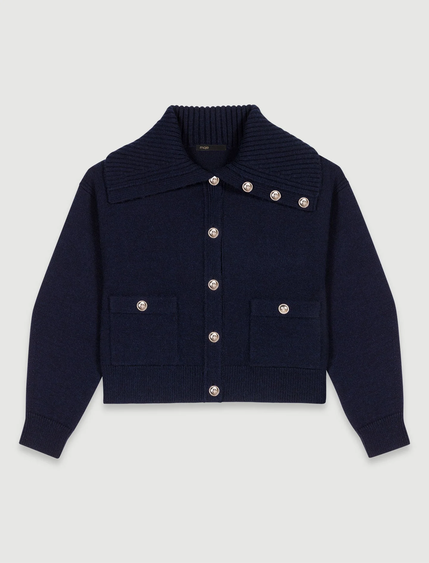 Confeccionado en mezcla de lana, este cárdigan de punto suave presenta un amplio cuello de canalé, manga larga y cierre de botones dorados grabados.