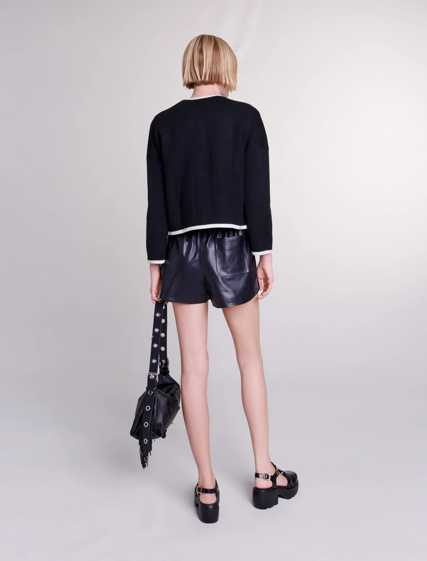 Esta temporada, el estudio Maje se inspira en la esencia misma de sus creaciones para crear prendas atemporales con detalles femeninos y formas atrevidas.De lana, este cárdigan de efecto chaqueta de punto bloqueado viene con un cuello redondo y mangas largas. Subrayado con ribetes contrastados en los bordes, viene con una cremallera, dos bolsillos con solapa resaltados con botones de presión plateados y un bolsillo en el pecho decorado con un parche bordado Clover.Ref.: MFPCA00488