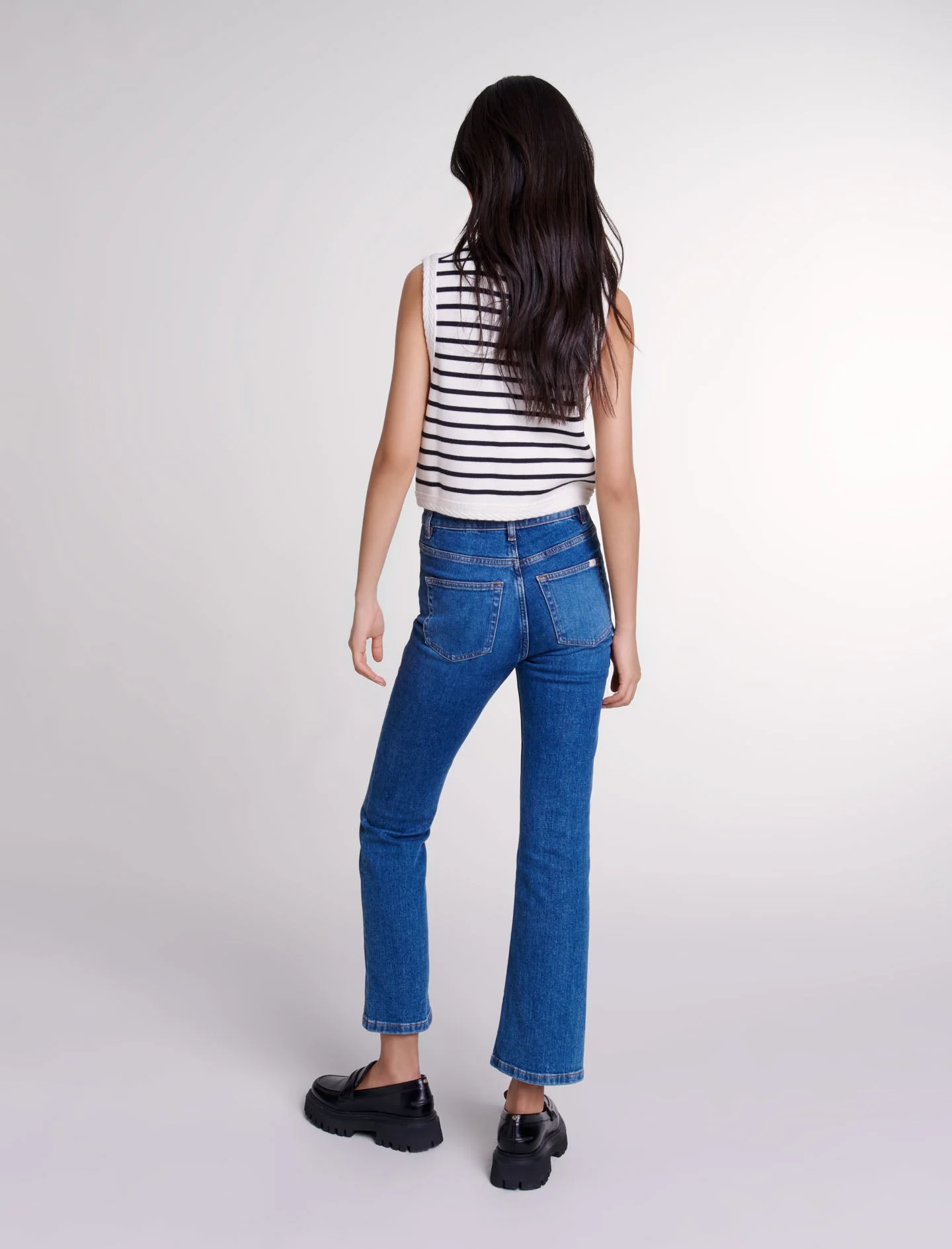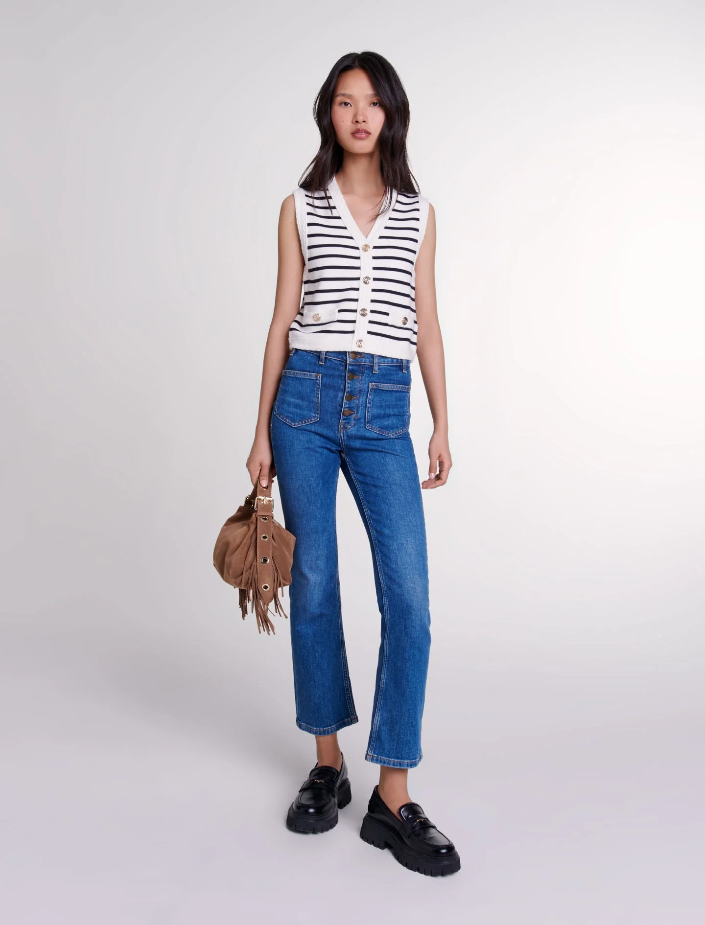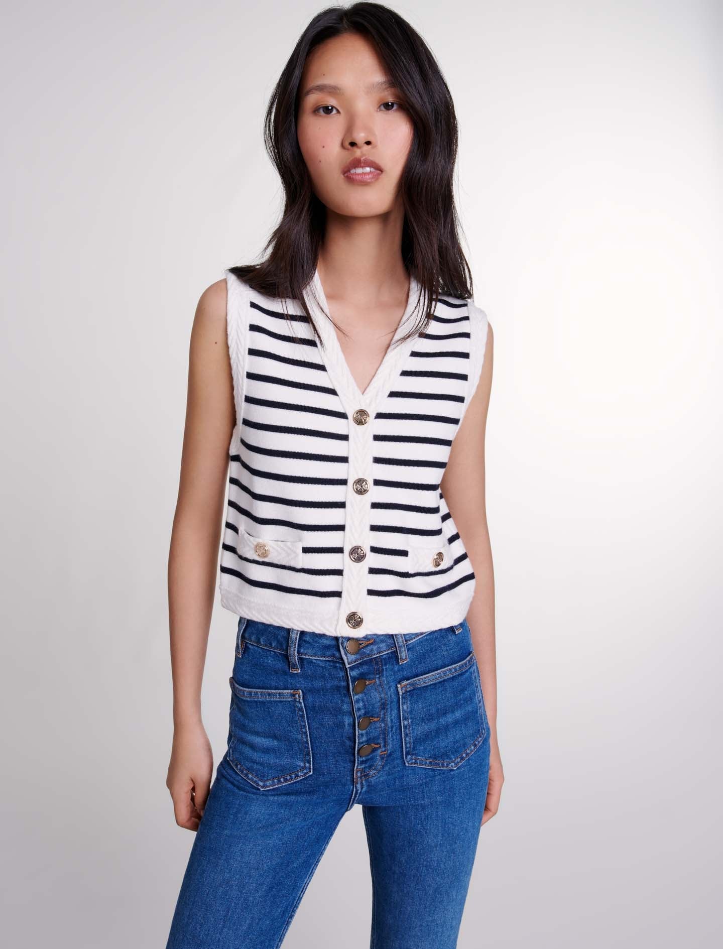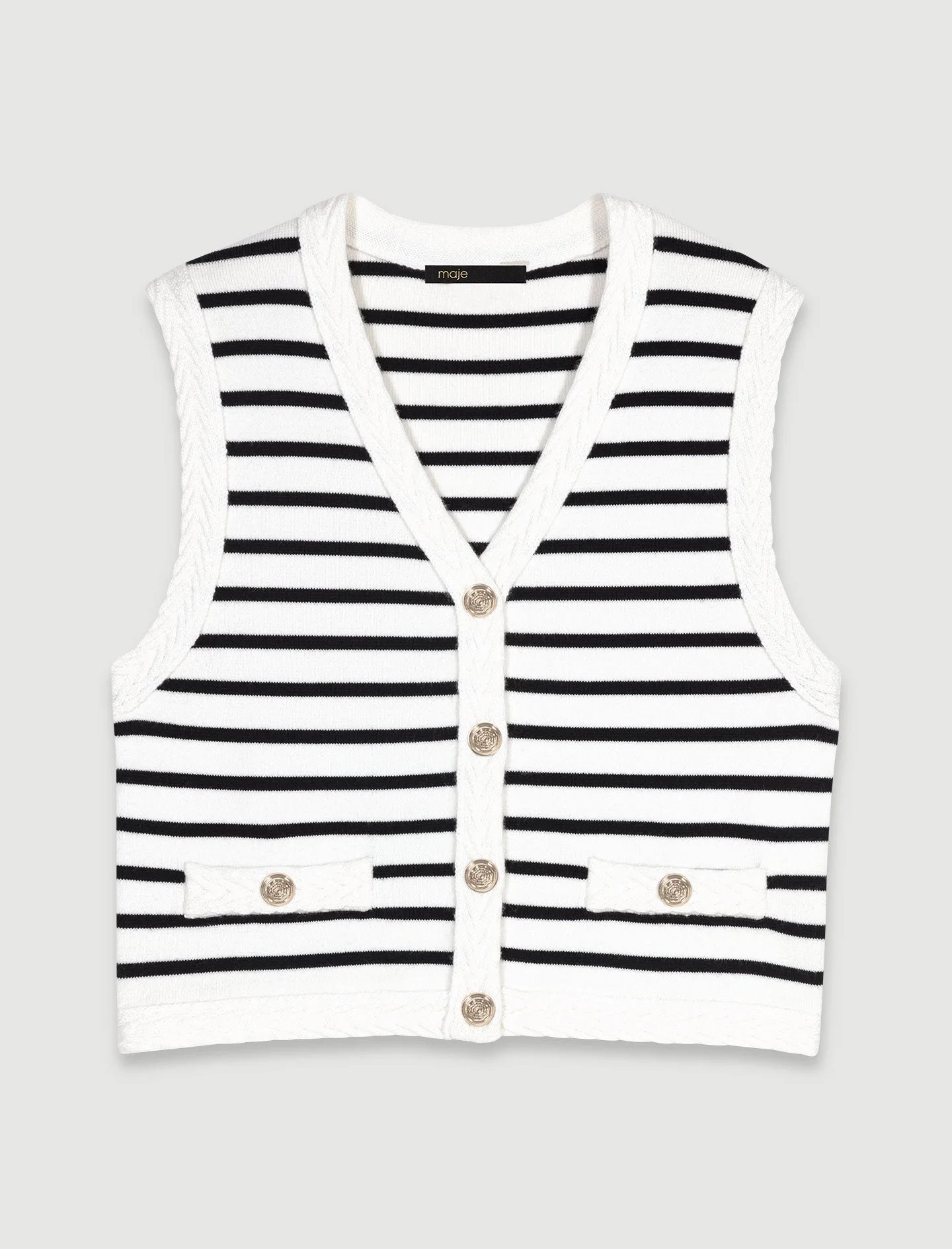Este jersey corto sin mangas, inspirado en la chaqueta de traje, cuenta con rayas tricotadas y bordes trenzados. Dispone de cuello de pico, dos bolsillos ribeteados y botones dorados que añaden un toque brillante a su look de temporada.