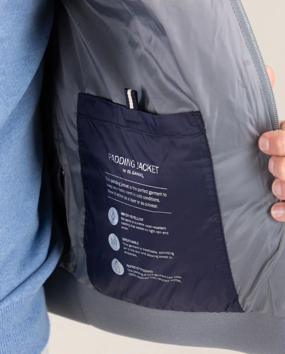 Chaqueta acolchada de hombre confeccionada en tejido de nylon y punto haciendo que sea un producto sostenible y respetuoso con el medio ambiente. Corte Slim Fit, cuello subido y cierre con cremallera. Lleva manga larga y bolsillos delanteros inclinados con corchete y bolsillo interior. Detalle de logo metálico en pecho. En nuestro camino hacia ser una marca 100% sostenible hemos tomado la decisión de eliminar la pluma de los chalecos y sustituirla por REPREVE . Material que en su proceso productivo reduce un 60% las emisiones de gases de efecto invernadero. Éste se compone de botellas recicladas