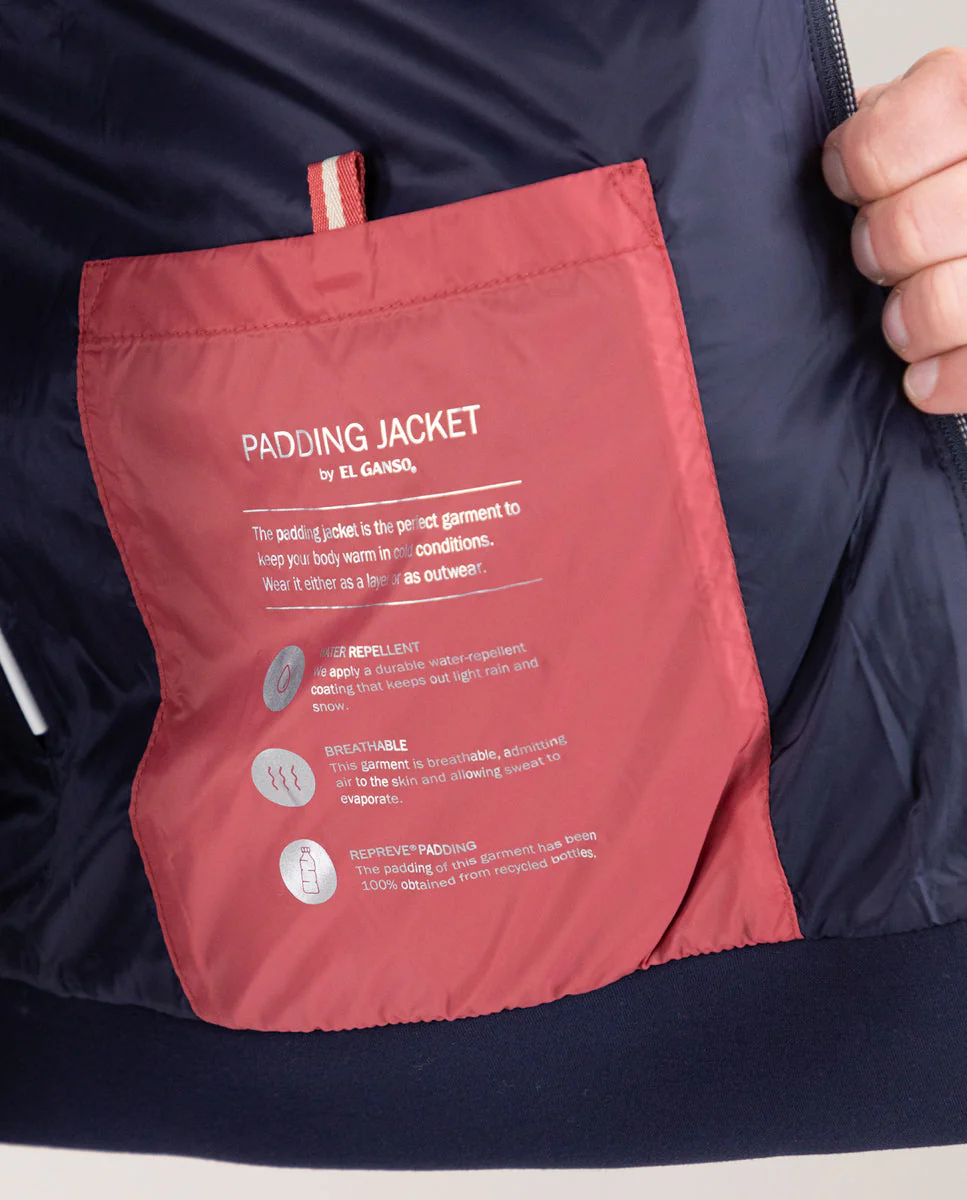 Chaqueta acolchada de hombre confeccionada en tejido de nylon y punto haciendo que sea un producto sostenible y respetuoso con el medio ambiente. Corte Slim Fit, cuello subido y cierre con cremallera. Lleva manga larga y bolsillos delanteros inclinados con corchete y bolsillo interior. Detalle de logo metálico en pecho. En nuestro camino hacia ser una marca 100% sostenible hemos tomado la decisión de eliminar la pluma de los chalecos y sustituirla por REPREVE . Material que en su proceso productivo reduce un 60% las emisiones de gases de efecto invernadero. Éste se compone de botellas recicladas