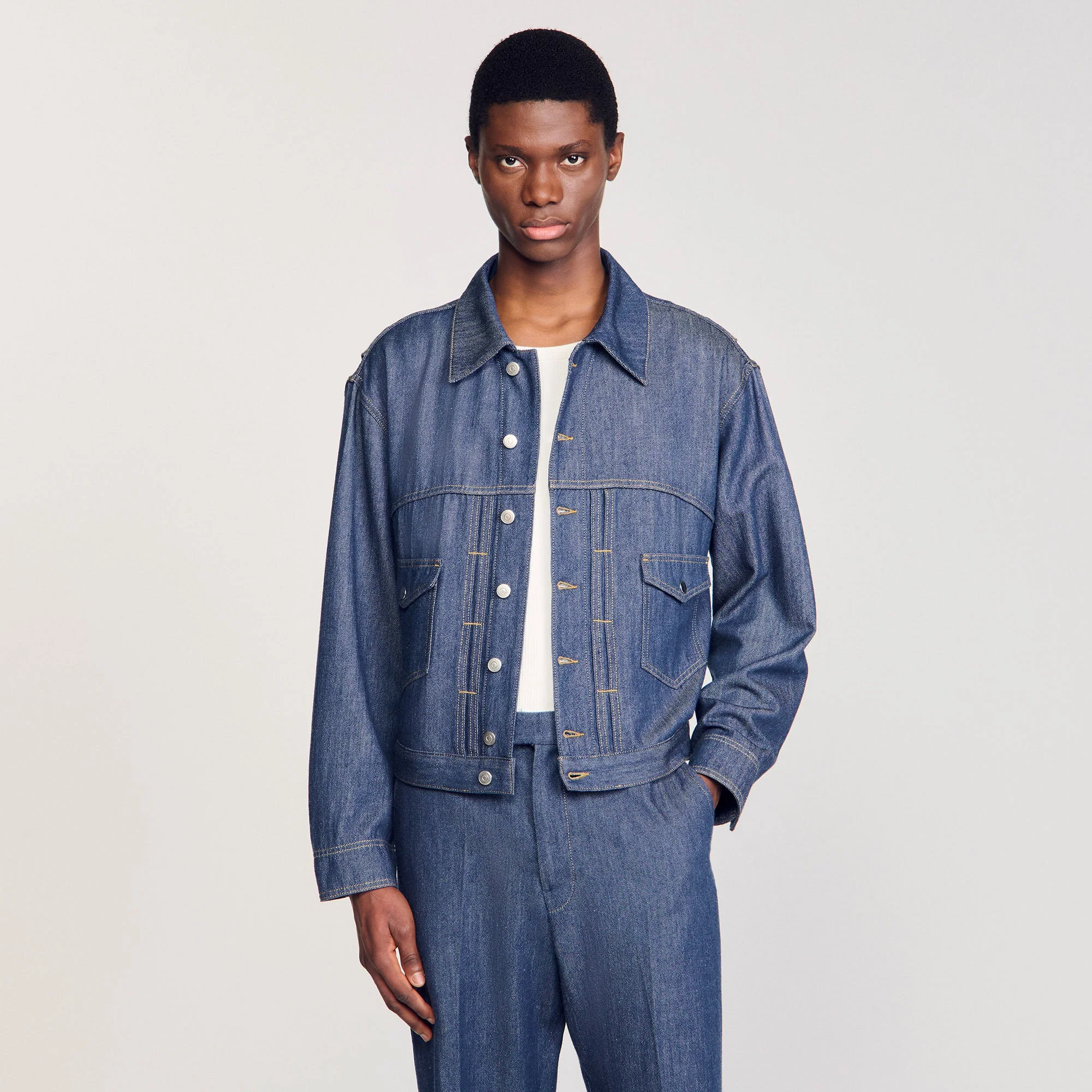 Cazadora oversize de cambray con pespuntes en contraste, manga larga y cierre de botones