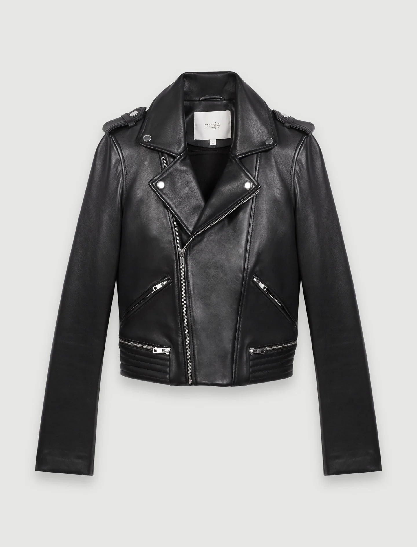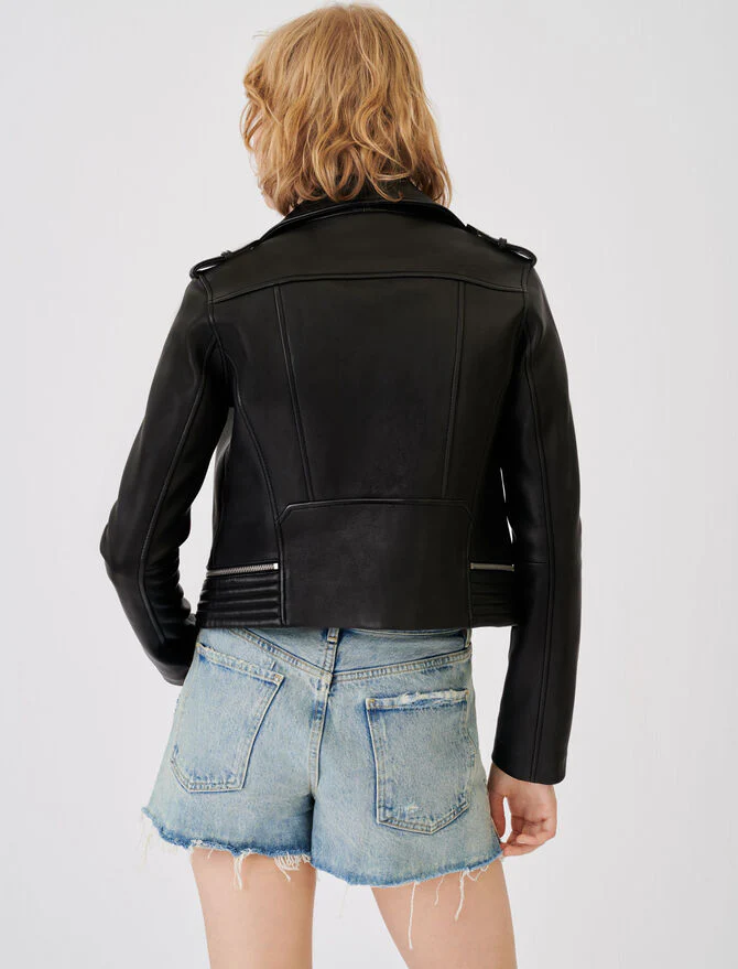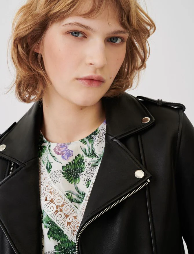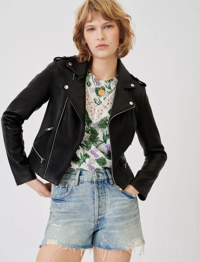 Cazadora de cuero tipo biker con cuello solapa y botones a presión. Mangas largas, trabillas en los hombros abotonadas y multi bolsillos con cremalleras a los lados. Modelo de corte ajustado, acabado con cierre asimétrico con cremallera y doblado abajo.La piel de esta prenda procede de una curtiduría con certificado LWG Gold. Esta certificación garantiza el reciclaje de los productos químicos y una gestión adecuada de los residuos y la energía.En Maje, imaginamos el futuro. Compartimos el objetivo de reducir, un poquito más cada temporada, el impacto en el medio ambiente de las prendas que diseñamos.• Cazadora de cuero
