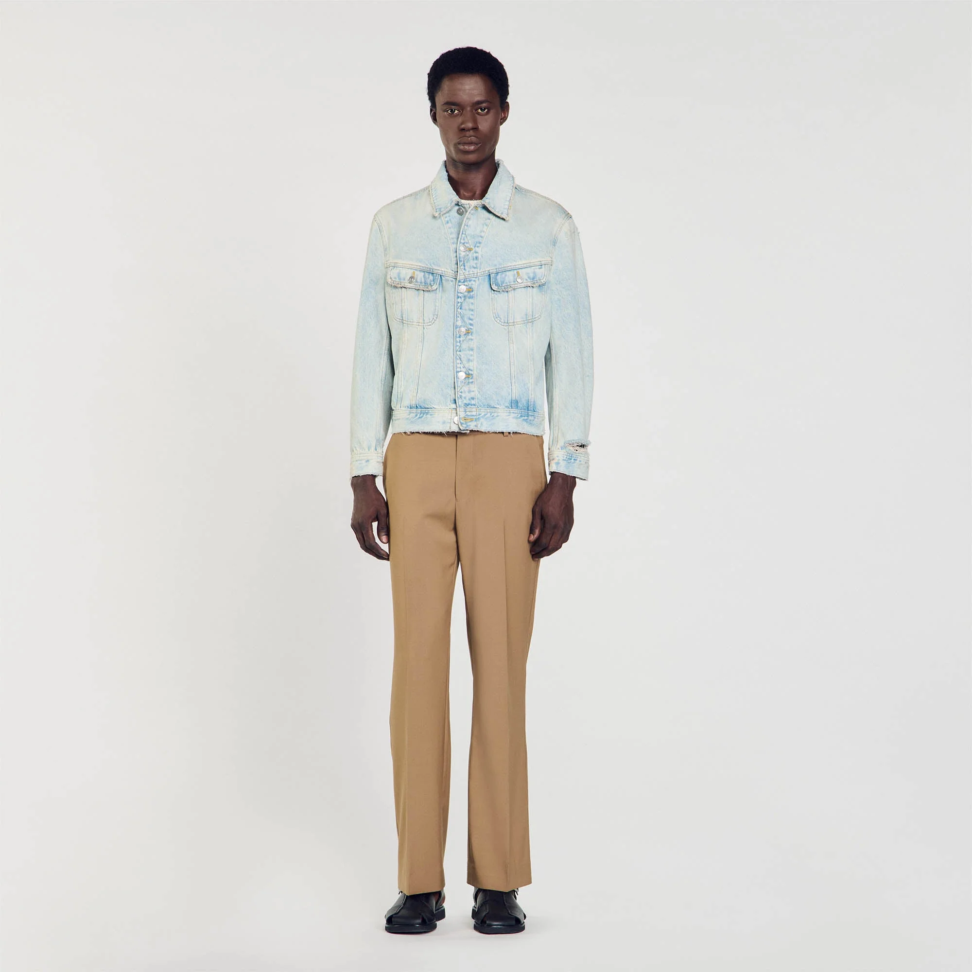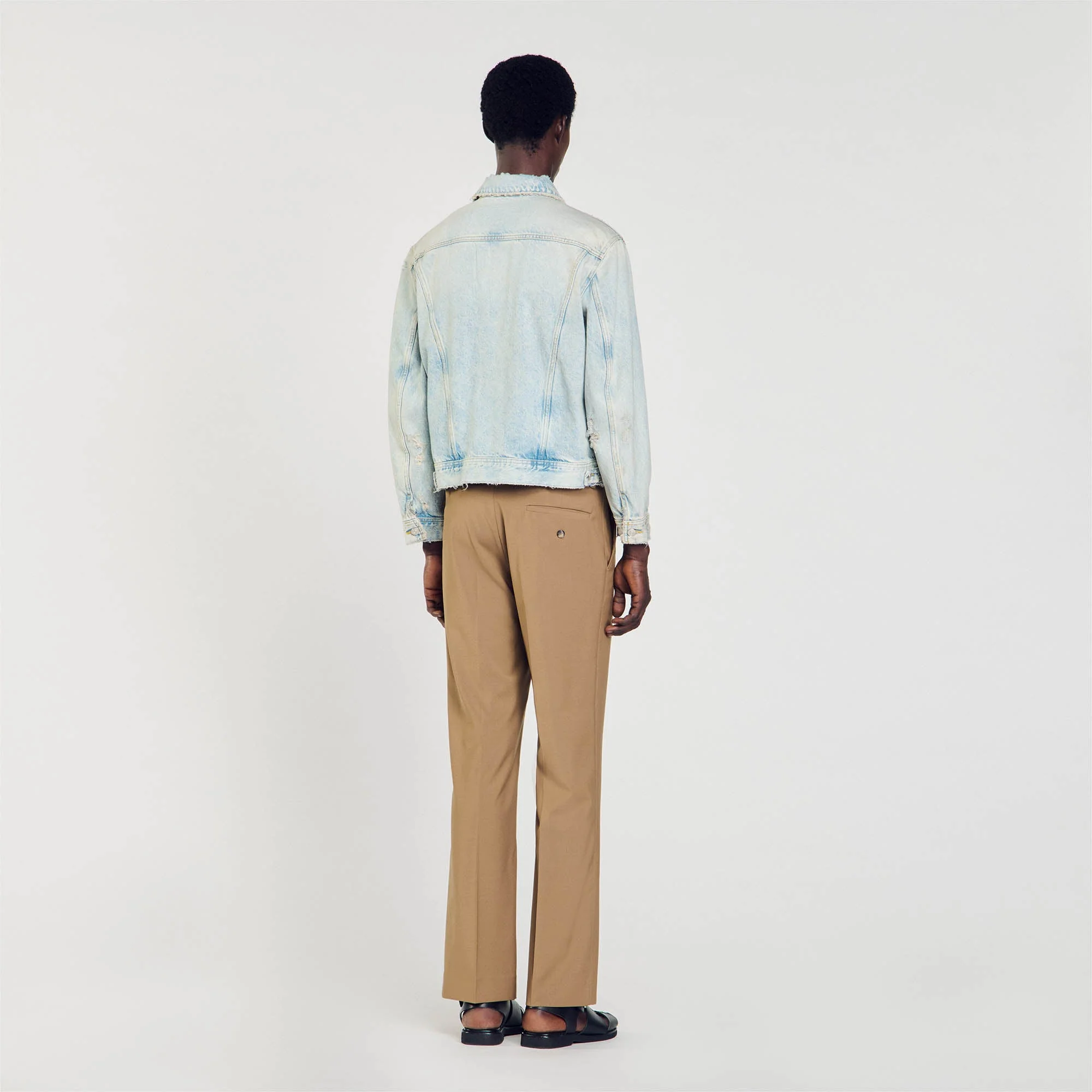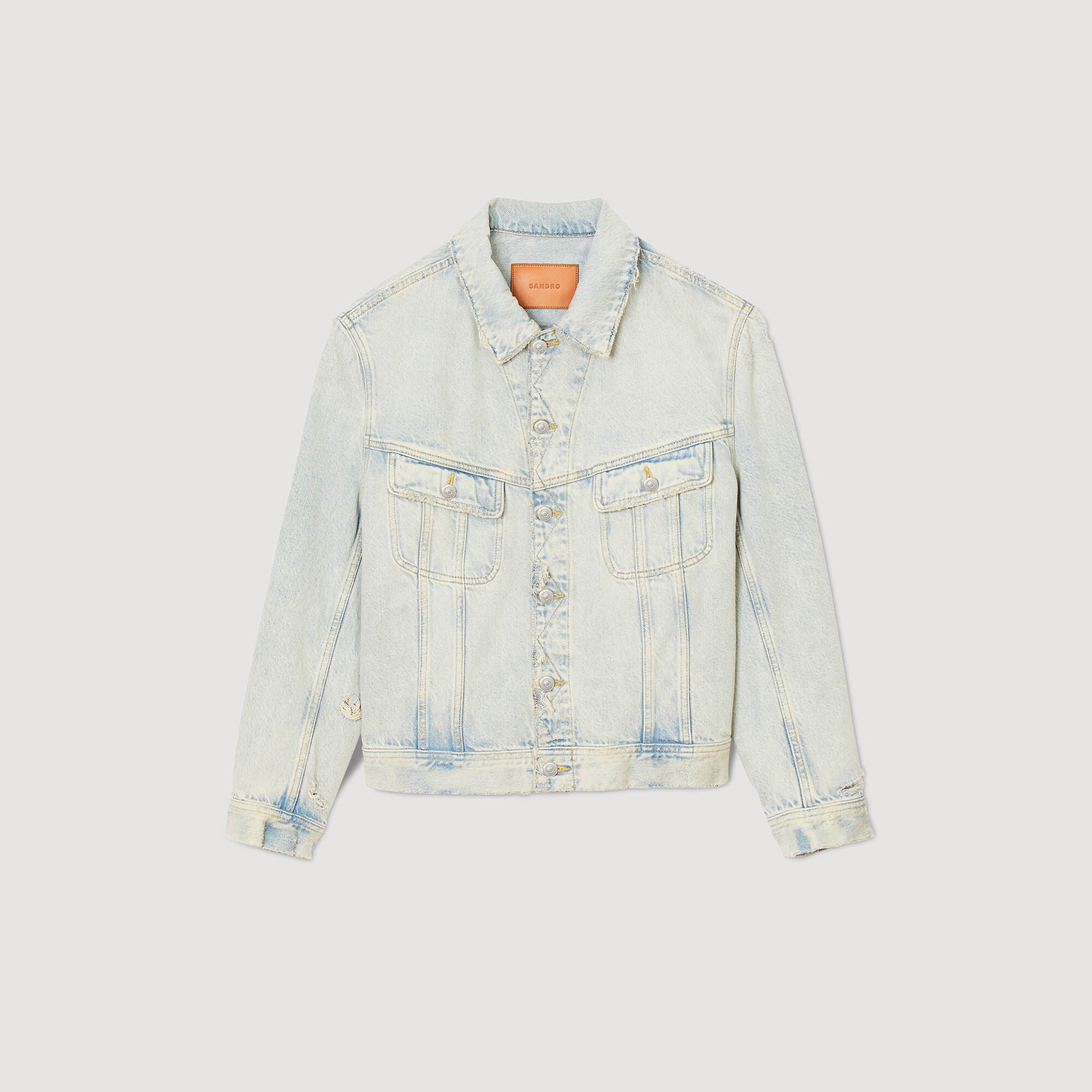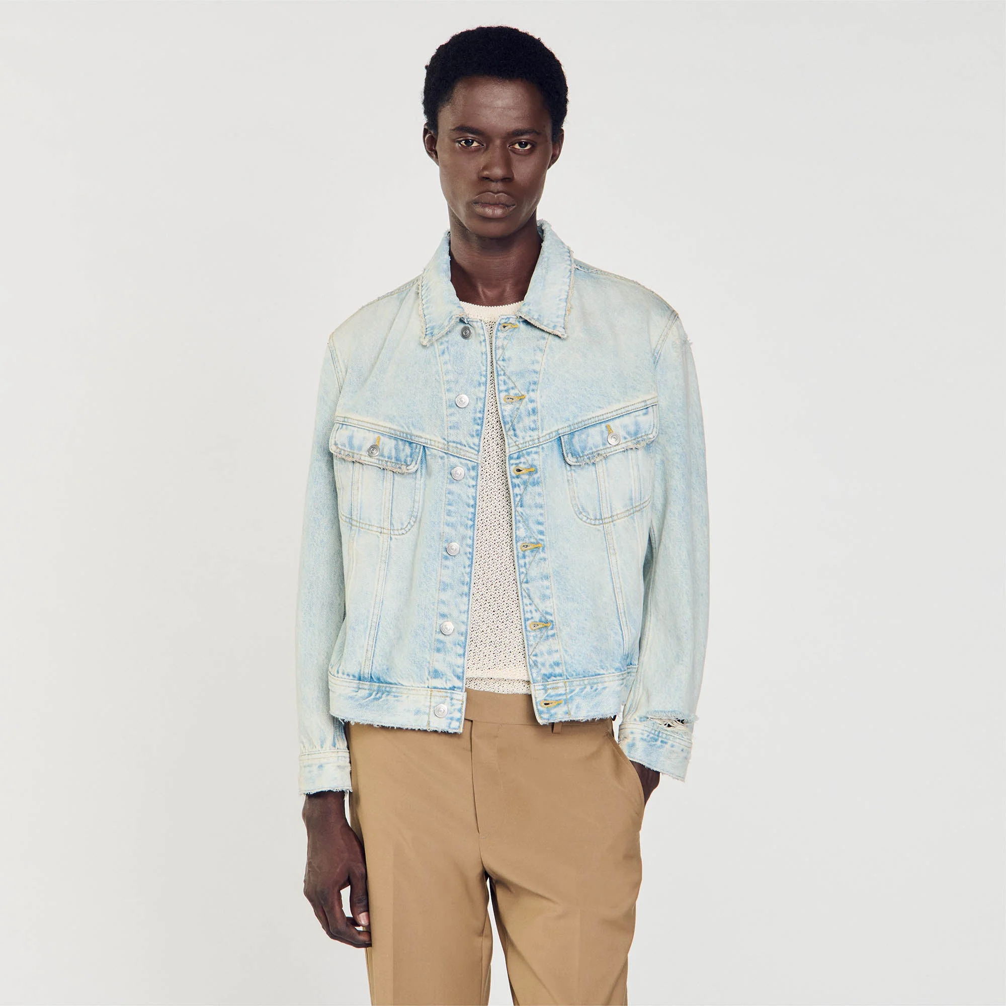 Cazadora vaquera descolorida con manga larga con puño abotonado, cierre de botones, bolsillos con solapa en el pecho y detalle de bordes sin rematar deshilachados en el bajo.