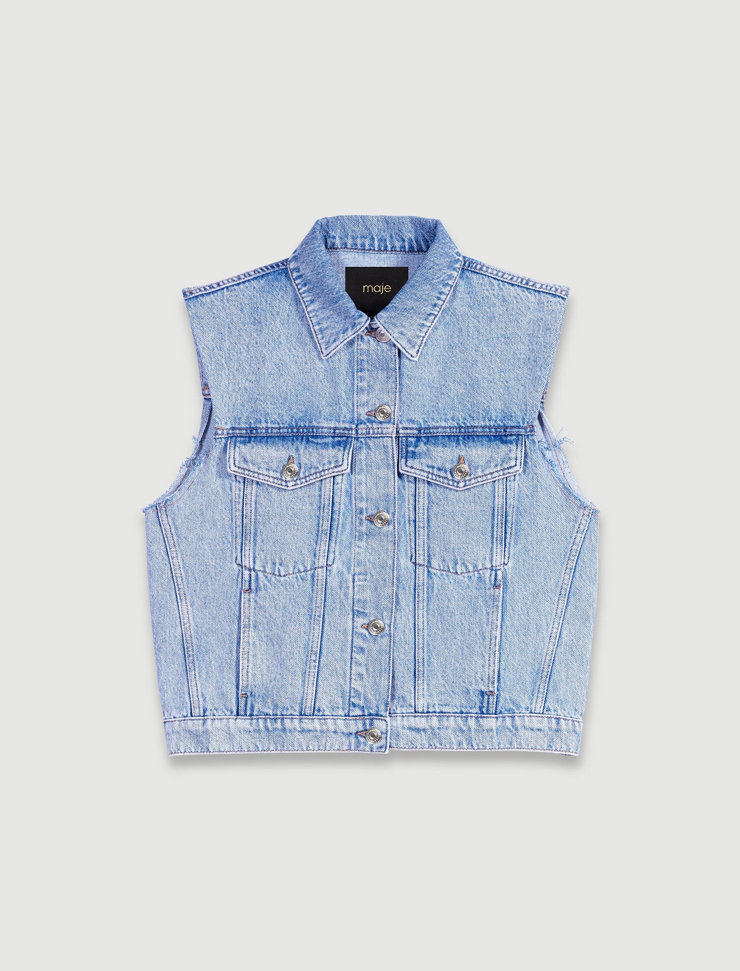 Esta temporada, el estudio ha diseñado un fondo de armario de diario con acentos desenfadados, en el que las piezas intemporales se reinventan con cortes superfemeninos.De tela vaquera desteñida, esta chaqueta sin mangas seduce por sus líneas fuertes y bordes sin coser en las sisas, que dan a su silueta estructura y estilo. Con un cuello clásico y tapetas en la cintura, revela un cierre y dos bolsillos con solapa con botones.Puede llevarla sola o superpuesta, por ejemplo, sobre un vestido, completando su «look» con un bolso y sandalias de plataforma.Ref.: MFPBL00721El tejido principal de esta prenda está fabricado íntegramente con algodón procedente de la agricultura ecológica. Un modelo agrícola virtuoso que combina el mantenimiento de la biodiversidad, la preservación de los recursos naturales y el respeto de las condiciones de trabajo de los agricultores.En Maje, imaginamos el futuro. Compartimos el objetivo de reducir, un poquito más cada temporada, el impacto en el medio ambiente de las prendas que diseñamos.