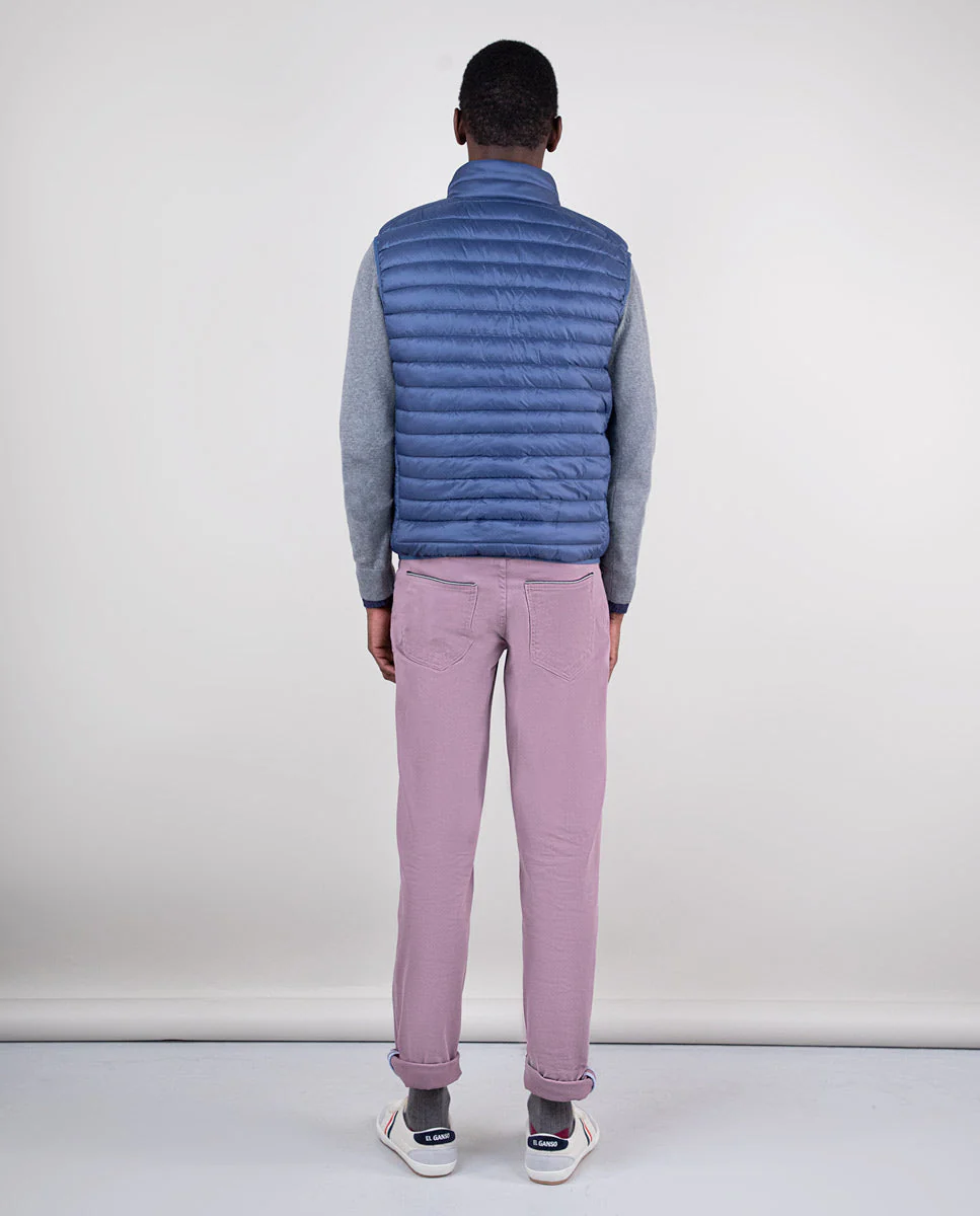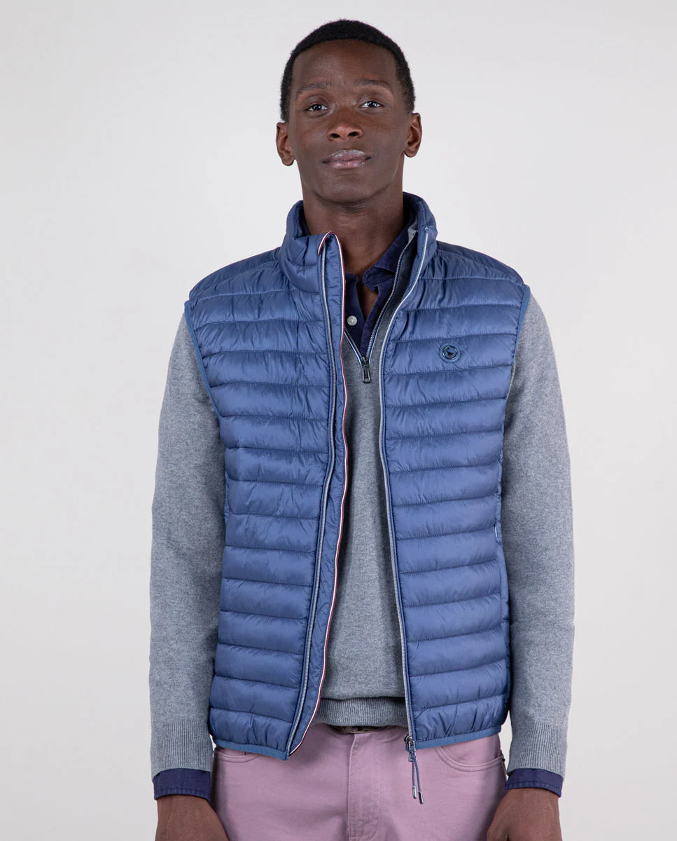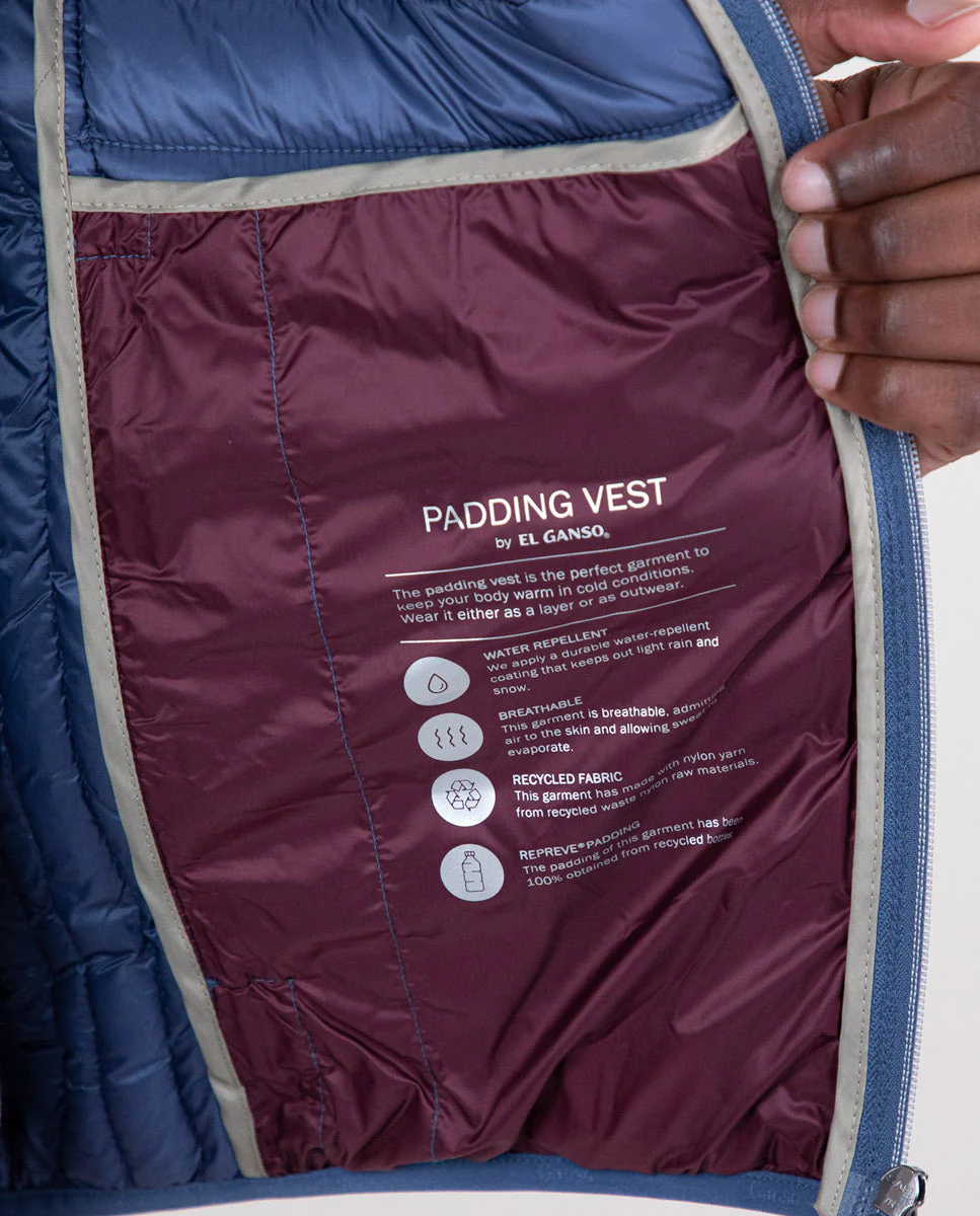 Chaleco de hombre acolchado de nylon reciclado repelente al agua. El patrón es Slim Fit, tiene una cremallera con un detalle de cinta de 3mm en el interior y una sisa elástica. Bolsillos con cremallera en la parte frontal y bolsillo interior. Logo metálico en el pecho. | REPREVE. En nuestro camino hacia ser una marca 100% sostenible hemos querido usar para el tejido interior, una fibra de alto rendimiento y de última generación, fabricada con todo tipo de materiales reciclados, incluidas las botellas de plástico. Hasta ahora, la empresa ha conseguido reciclar más de 31.000 millones de botellas de plástico y el contador sigue subiendo cada segundo.