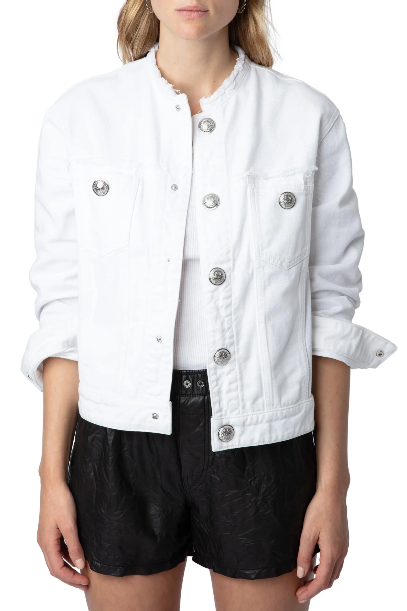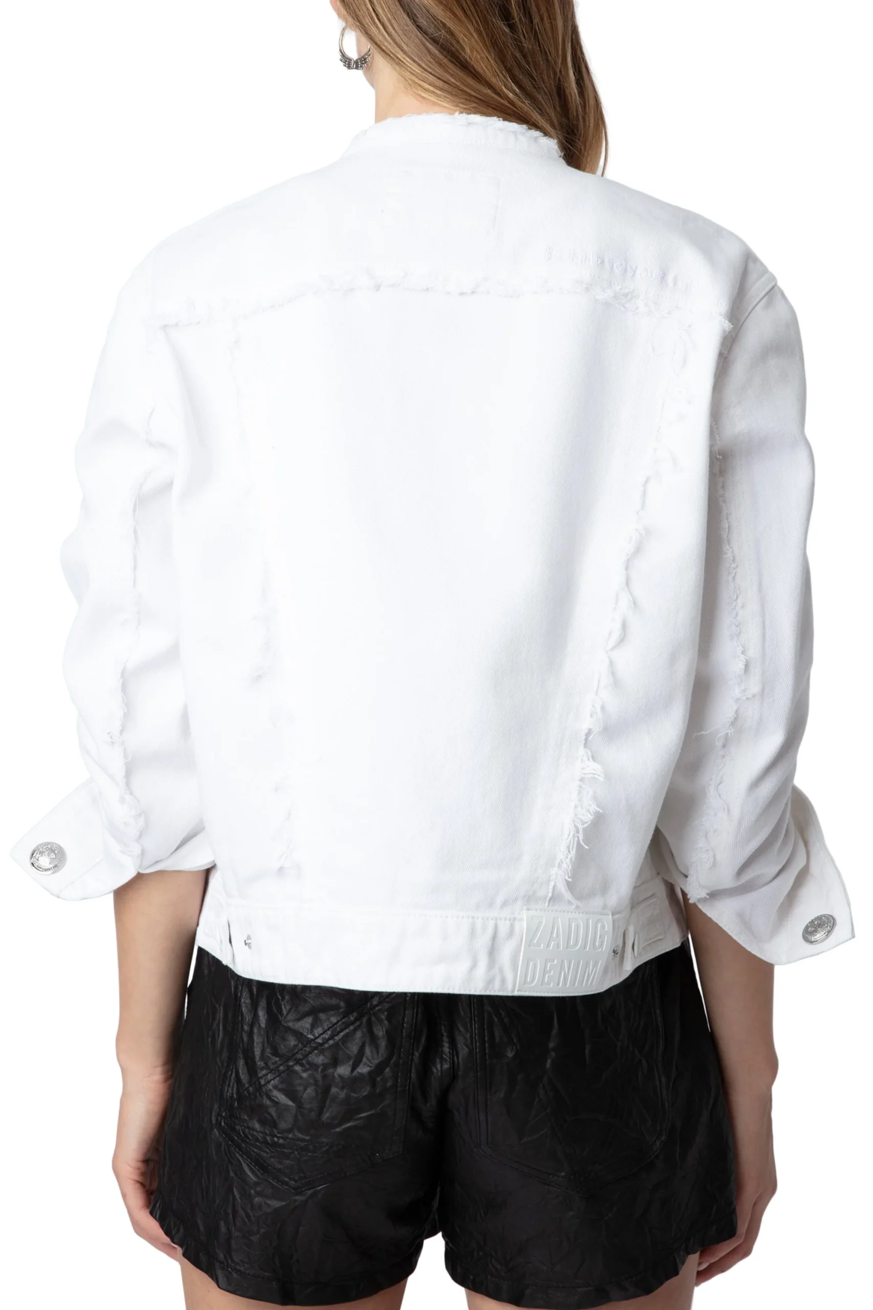 Chamarra Kaely Destroy Denim Eco Blanco marca Zadig & Voltaire. COMPOSICIÓN. Material principal: Algodón. Consultar instrucciones de lavado en etiqueta interna.