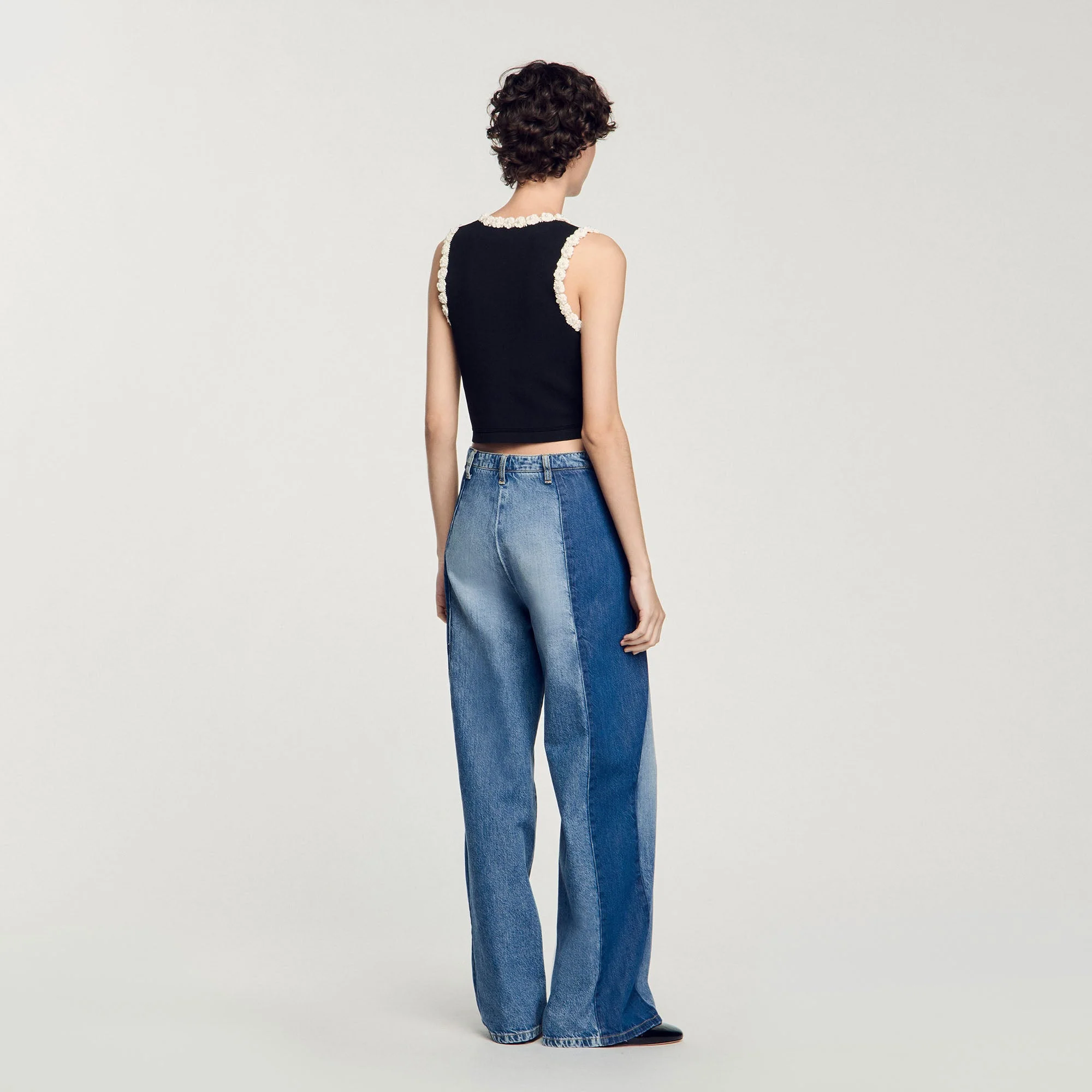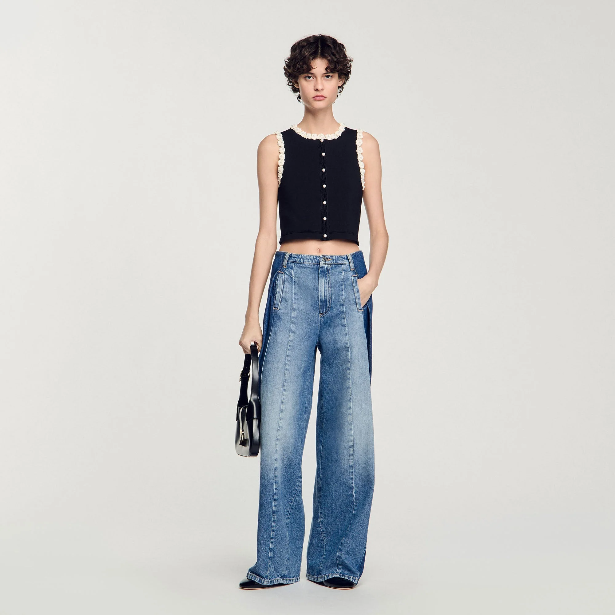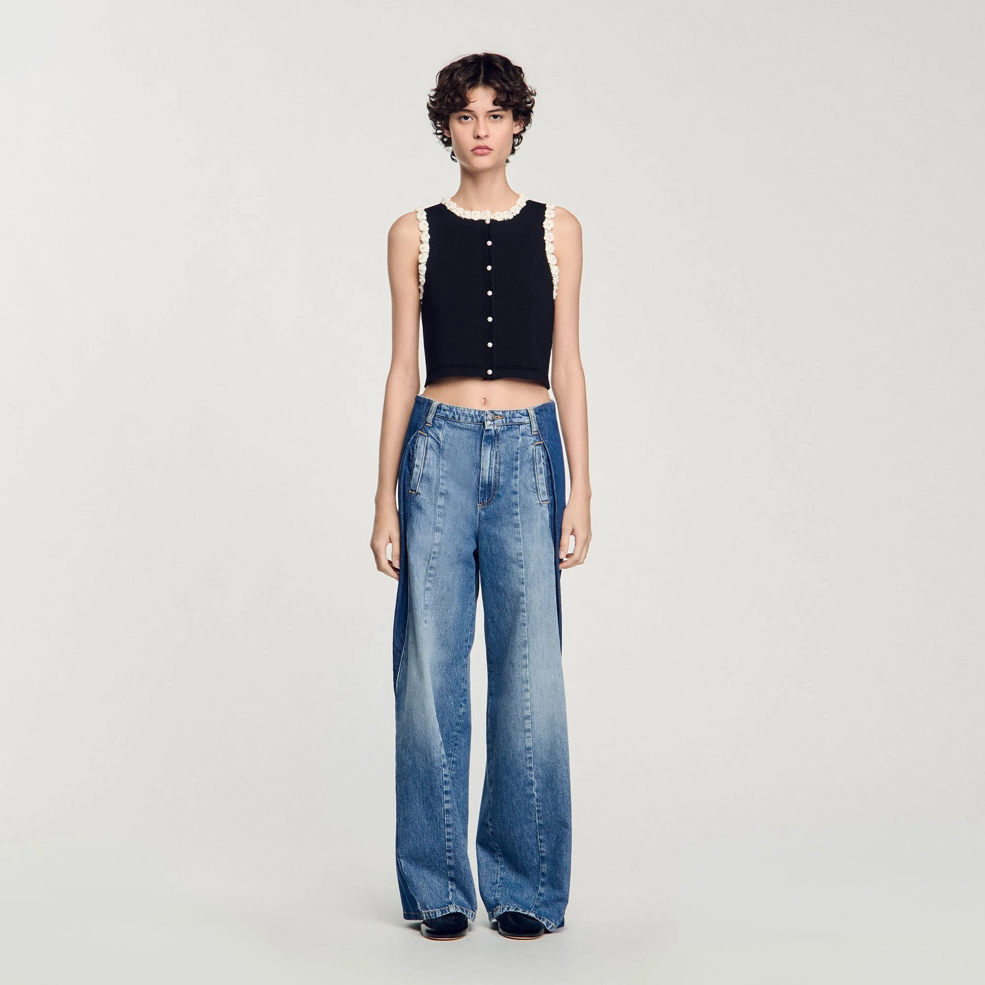 La modelo mide 179 cm y lleva la talla 1 – corte cropped