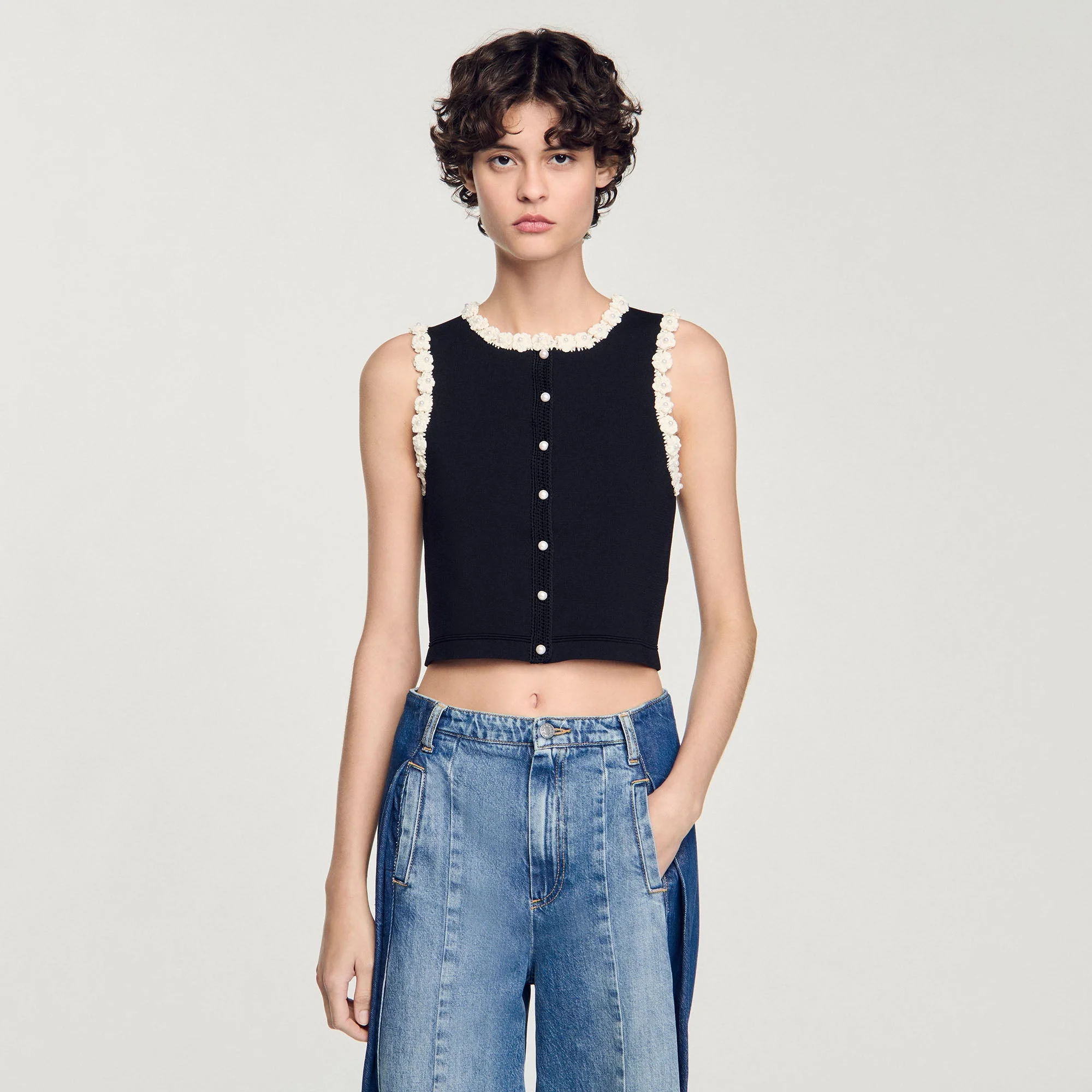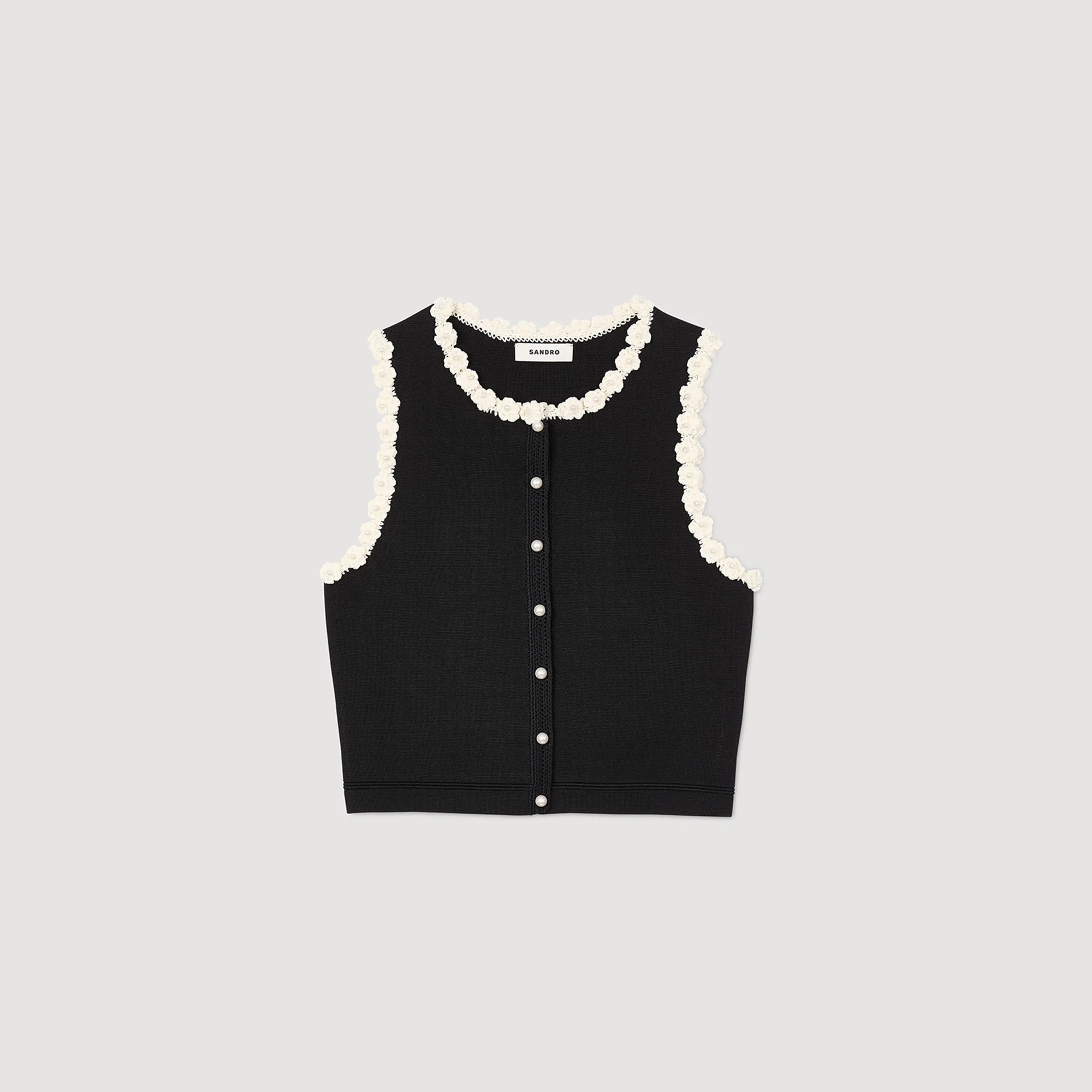 Chaqueta sin mangas con cuello redondo, detalle de flores de ganchillo y pedrería y tapeta con botones de pedrería.