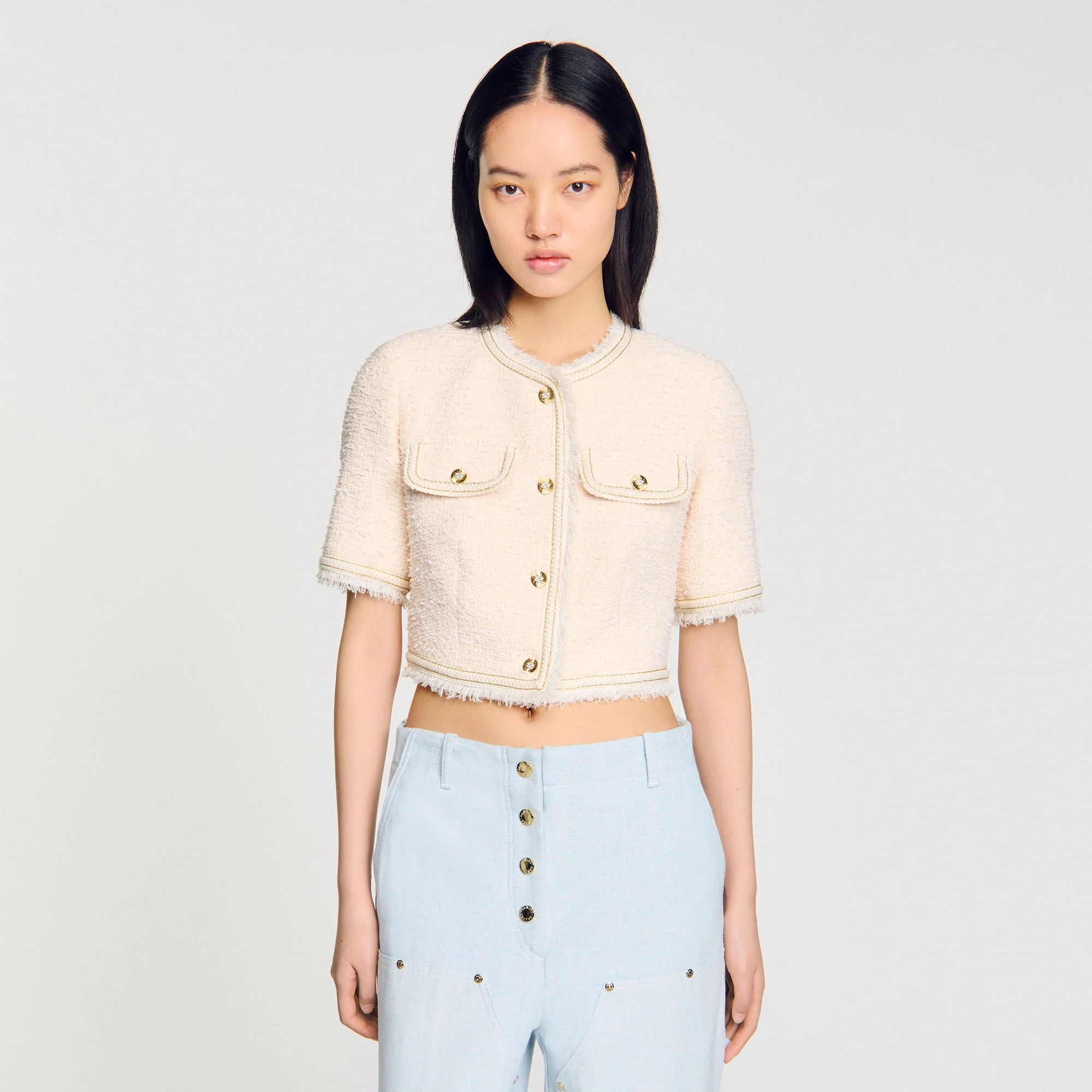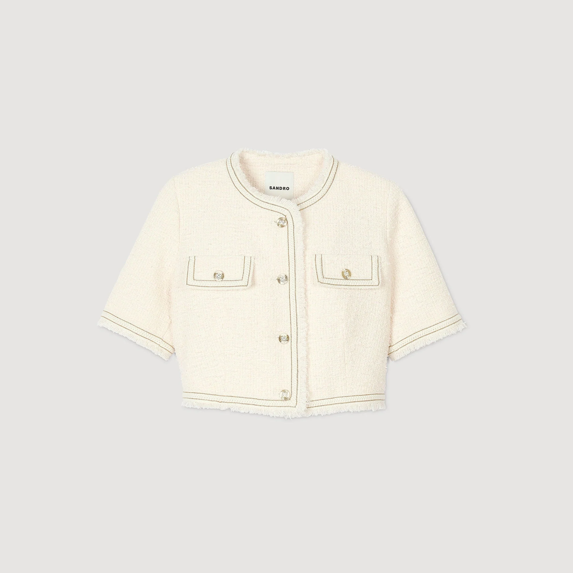 Chaqueta corta de tweed de fantasía con ribetes con flecos, manga corta, cuello redondo, tapeta de botones y bolsillos con solapa en el pecho.