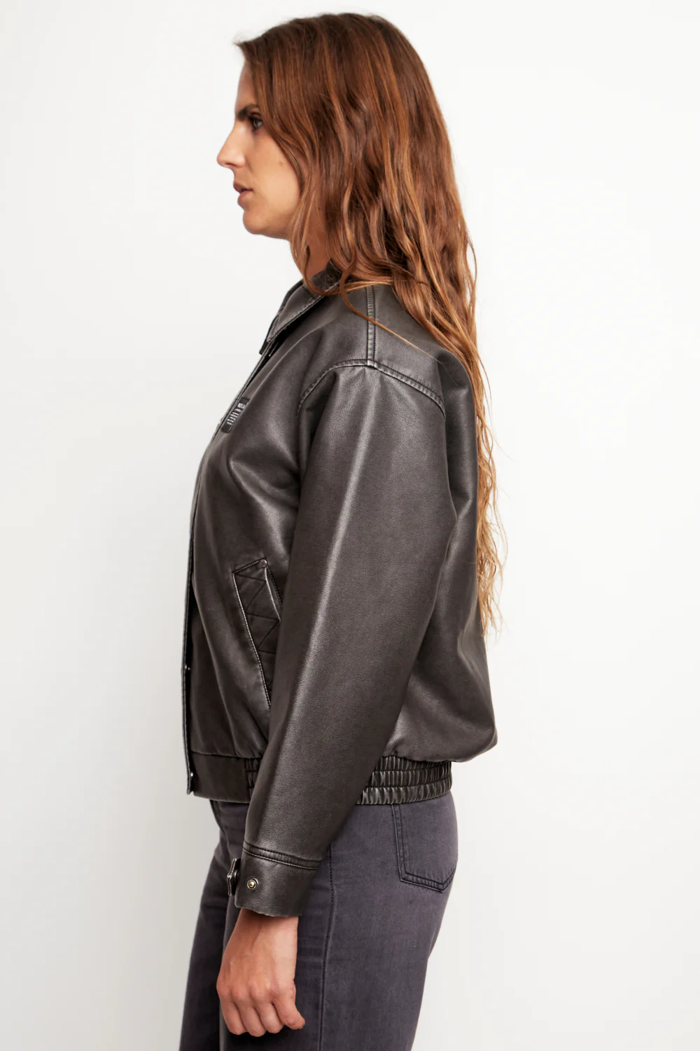 Chaqueta estilo motoquera hecha de PU, diseñada para darle un aire rockero a tu look diario. Con bolsillos laterales con broche y cierre frontal metálico, combina estilo y funcionalidad. Su pretina elasticada aporta comodidad, para que la uses todo el día sin perder actitud.