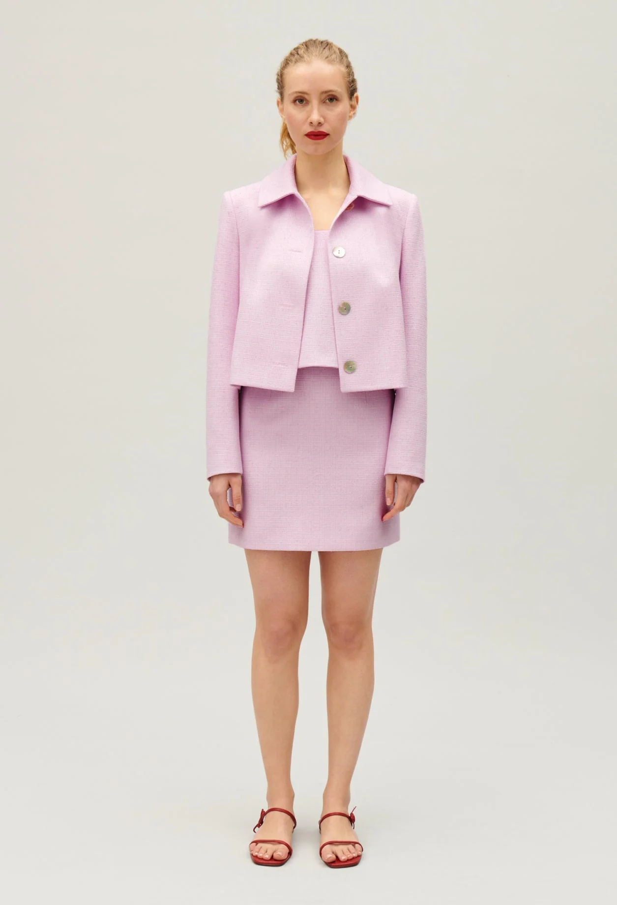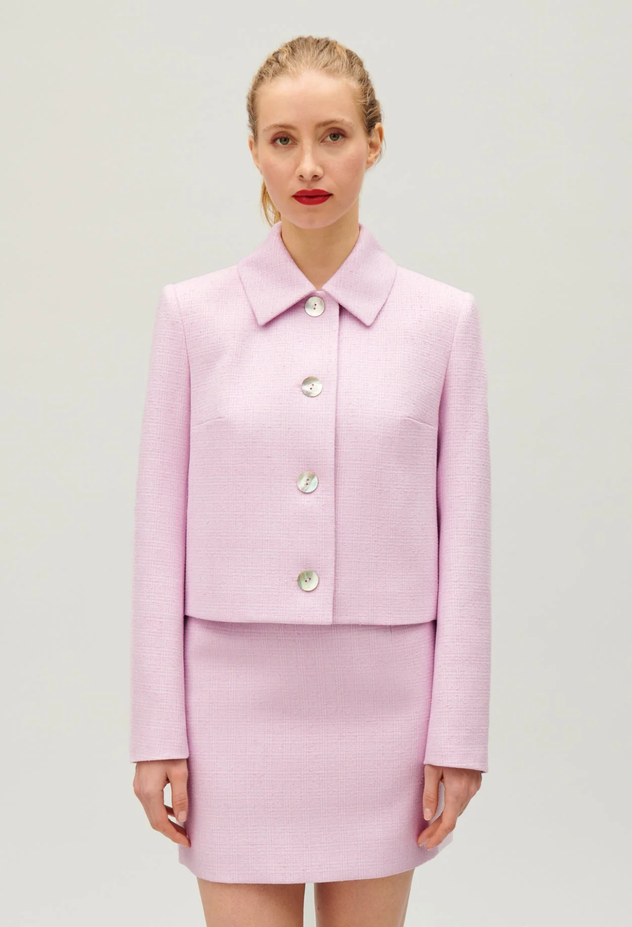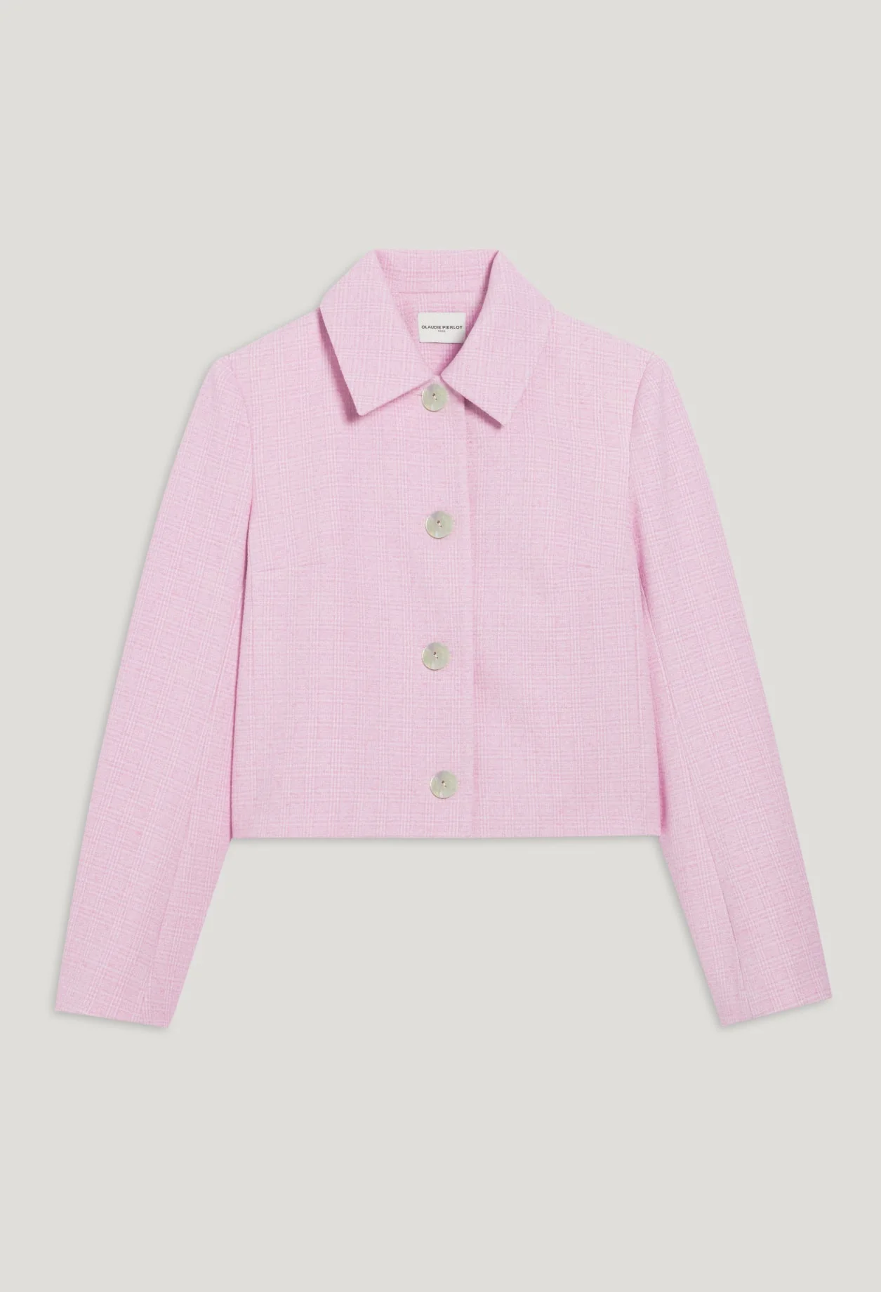 Corte de caja, cuello ancho de sastre, manga larga, cierre abotonado con botones nacarados