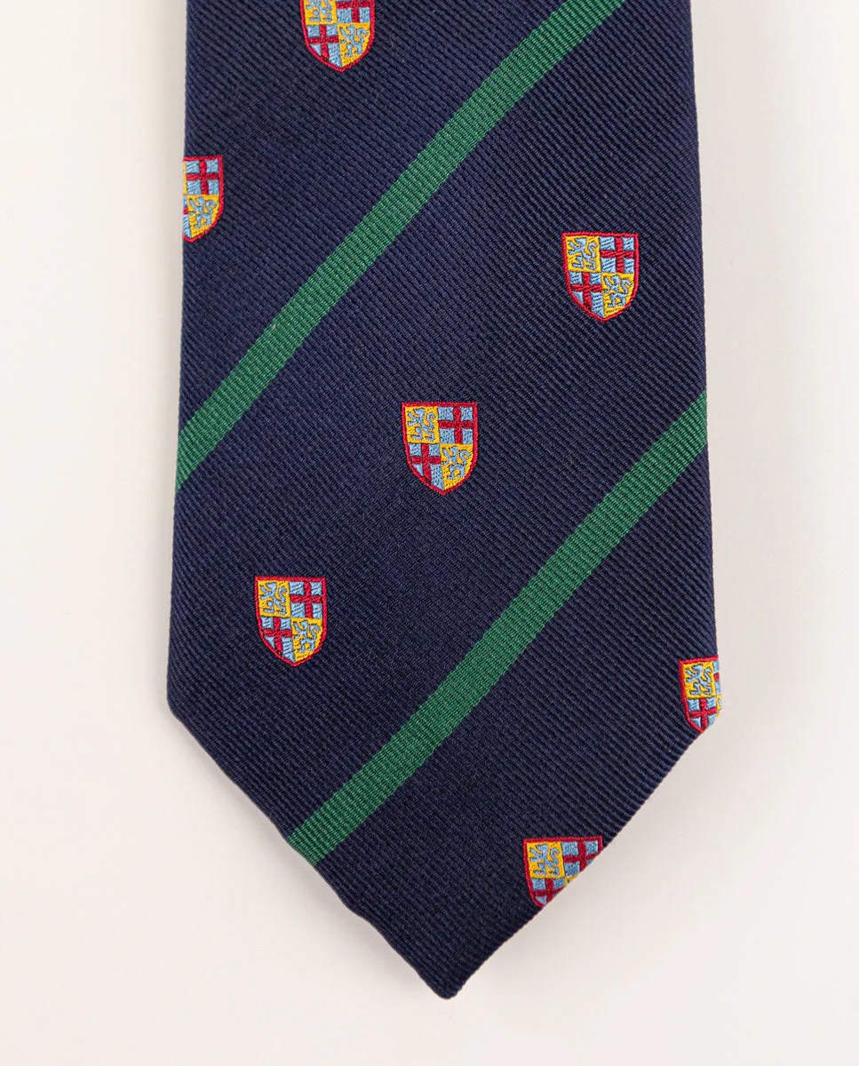Corbata de rayas oblicuas con dibujo de escudos confeccionada en algodón. Lleva tres pespuntes con nuestros colores en la pala trasera y forro jacquard con logo. Ancho de pala: 8 cm.