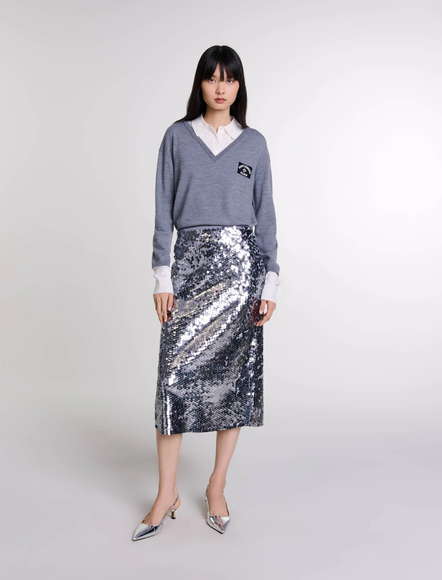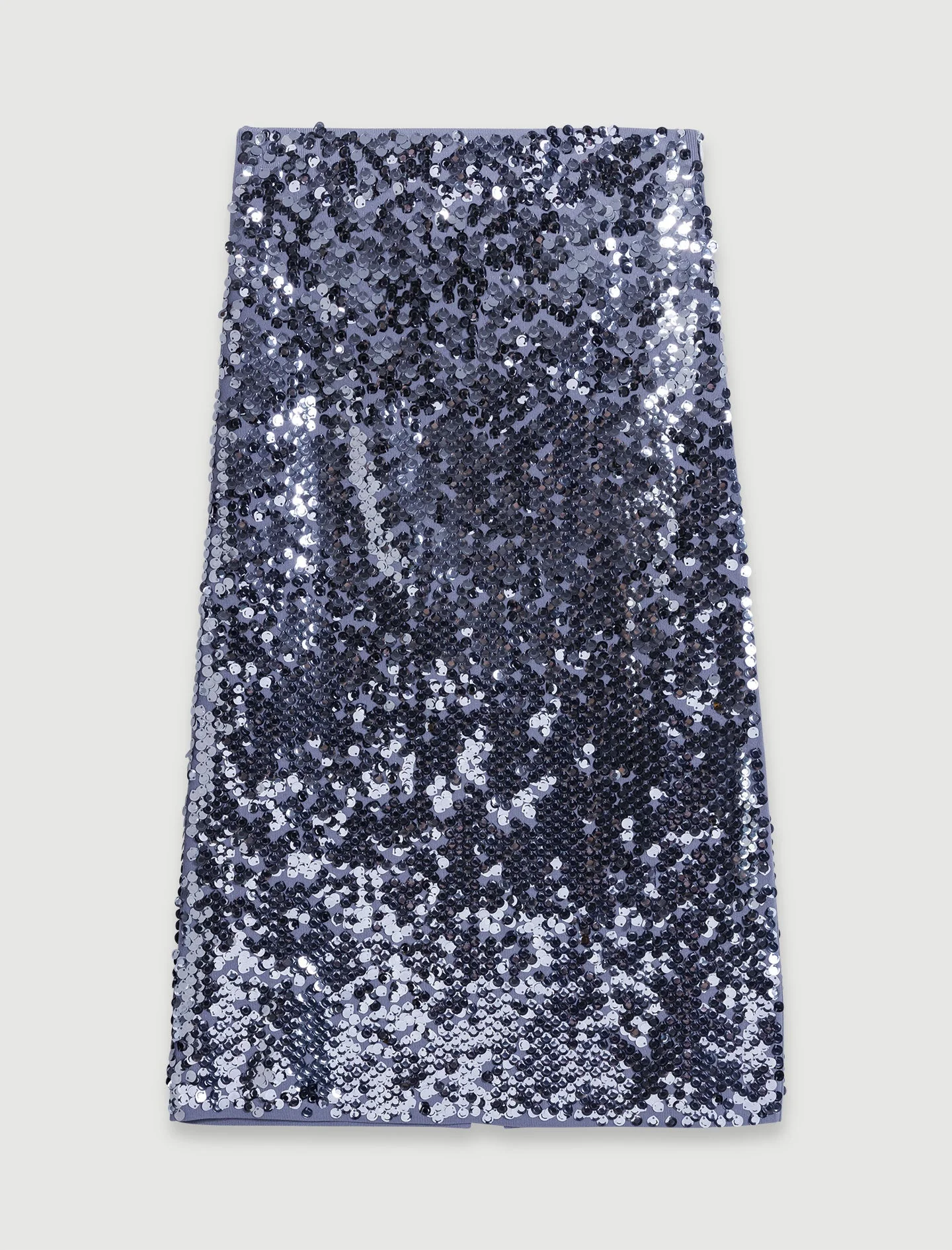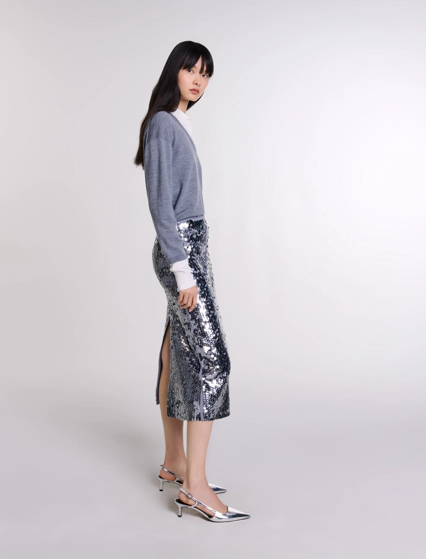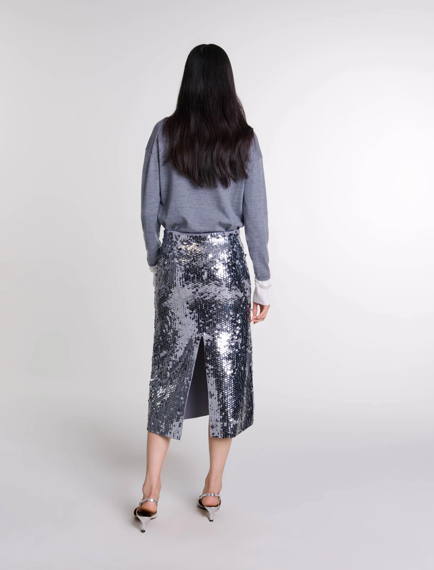 Esta falda midi recta, confeccionada en un tejido elástico, está adornada con lentejuelas plateadas all over que iluminarán su look a cada paso. Con un cierre de cremallera lateral, resulta muy favorecedora y cuenta con una audaz abertura en la parte trasera.
