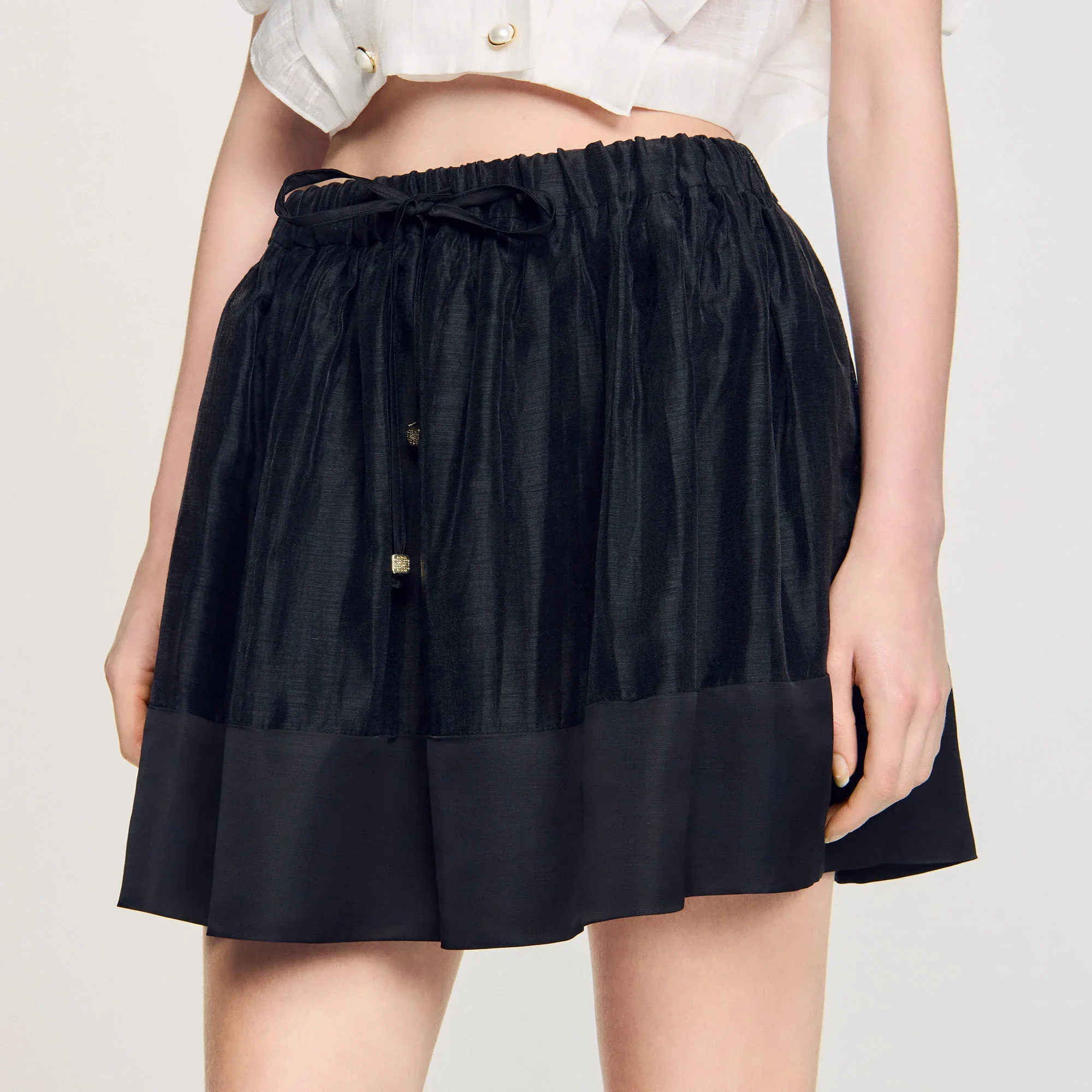Falda corta bimaterial con cintura elástica con cintas ajustables y franja en el bajo.