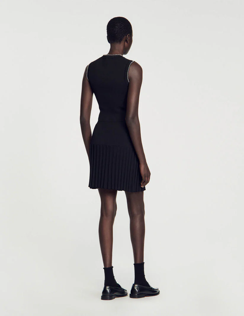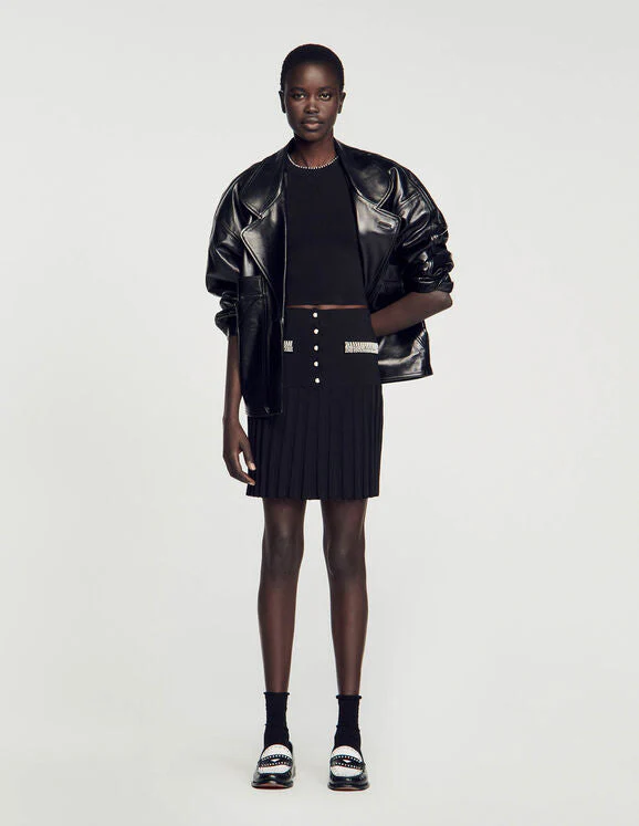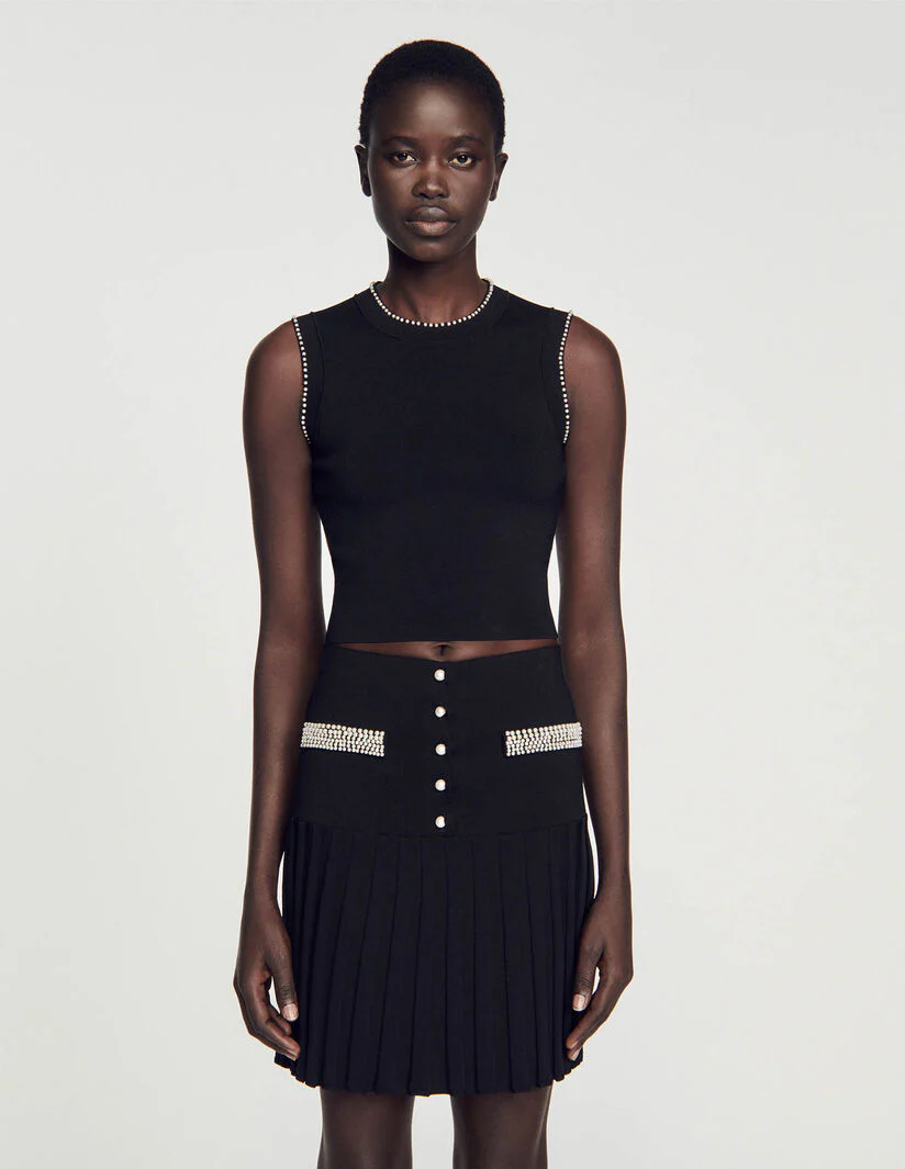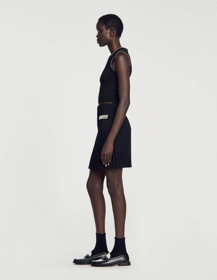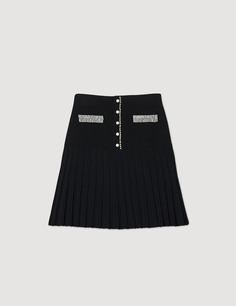 Falda corta de punto con falsos botones de piedras en la parte superior y con pliegues en la parte inferior, adornado con piedras en los bolsillos.
