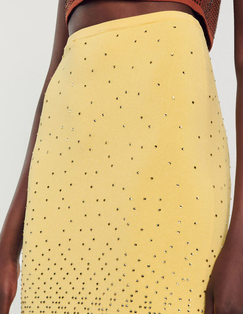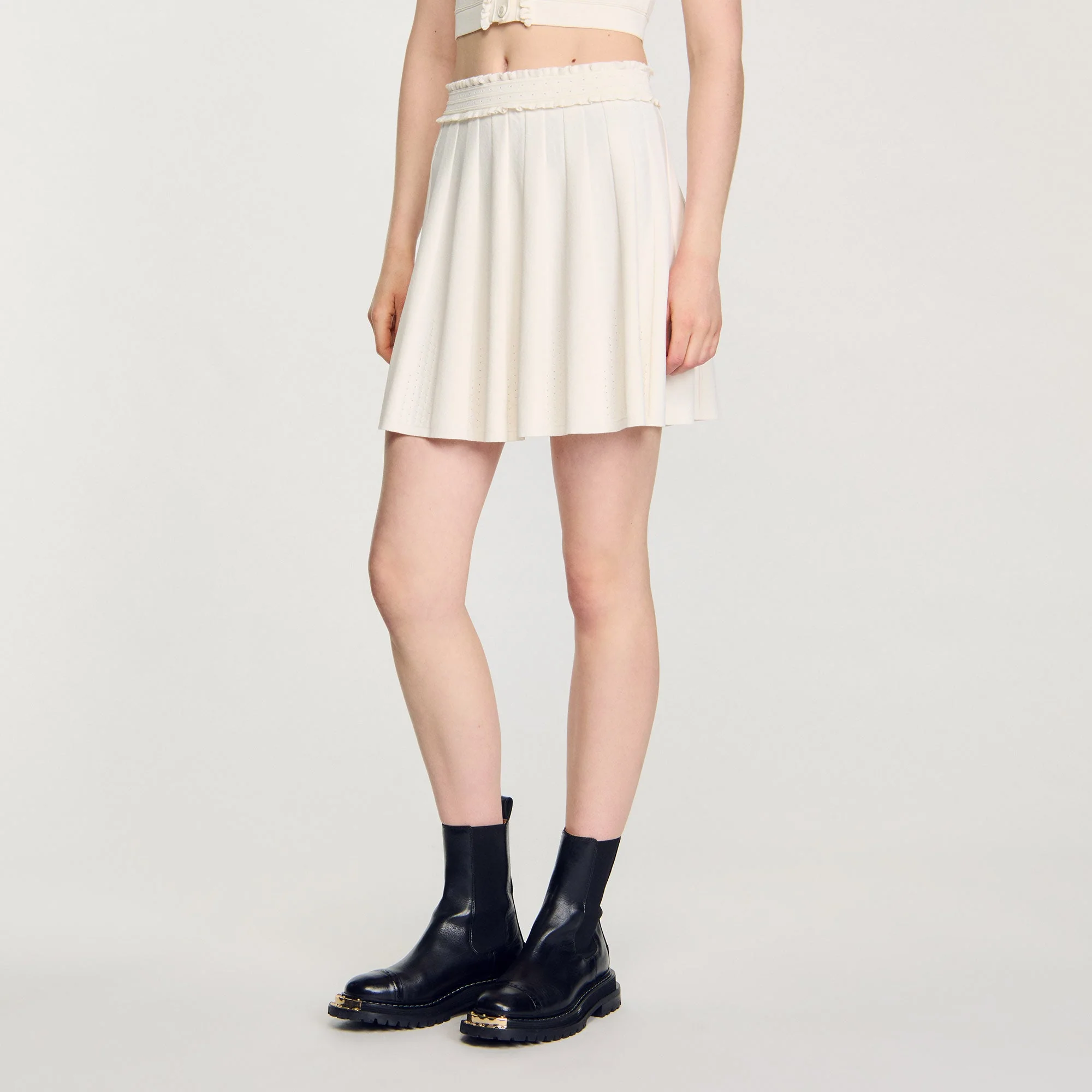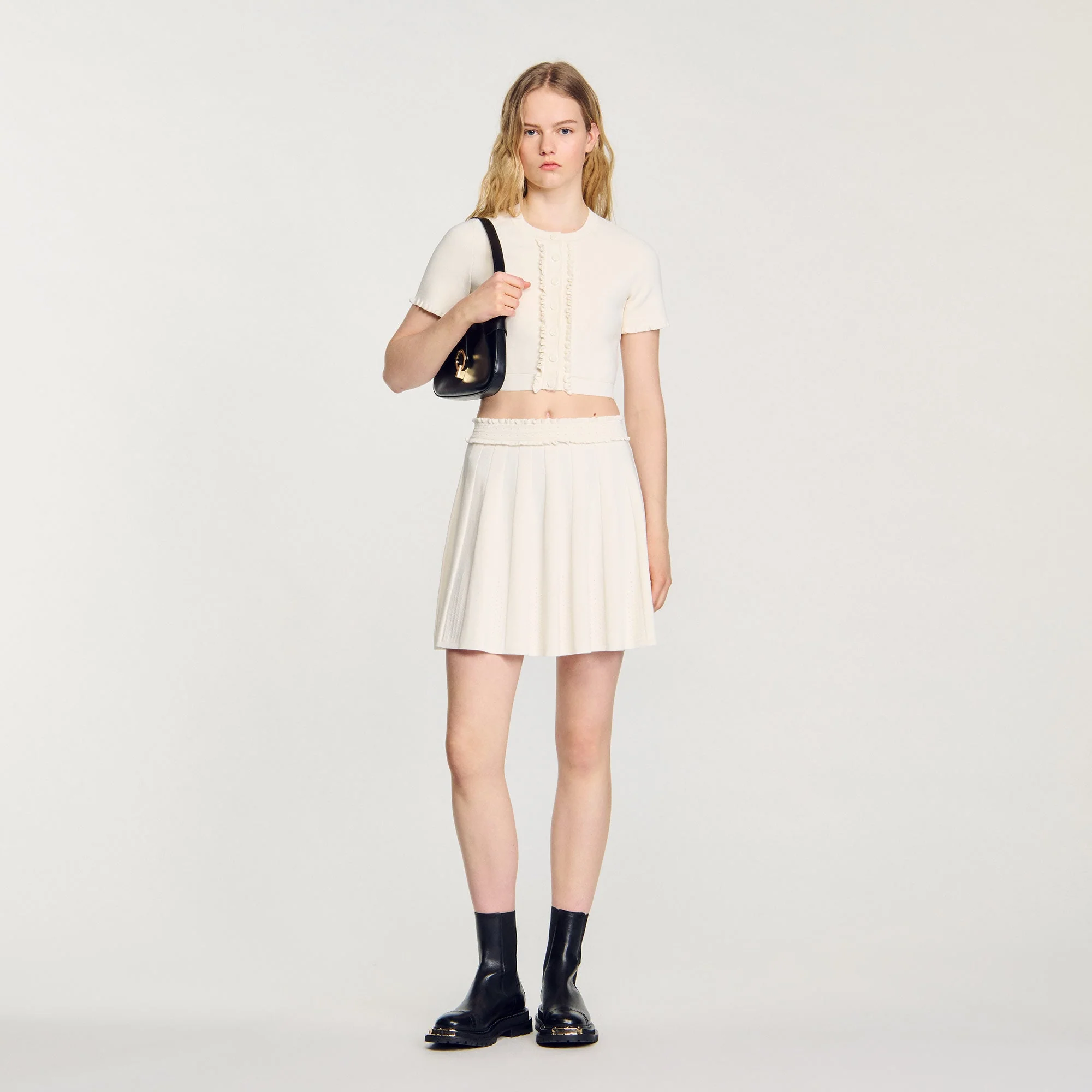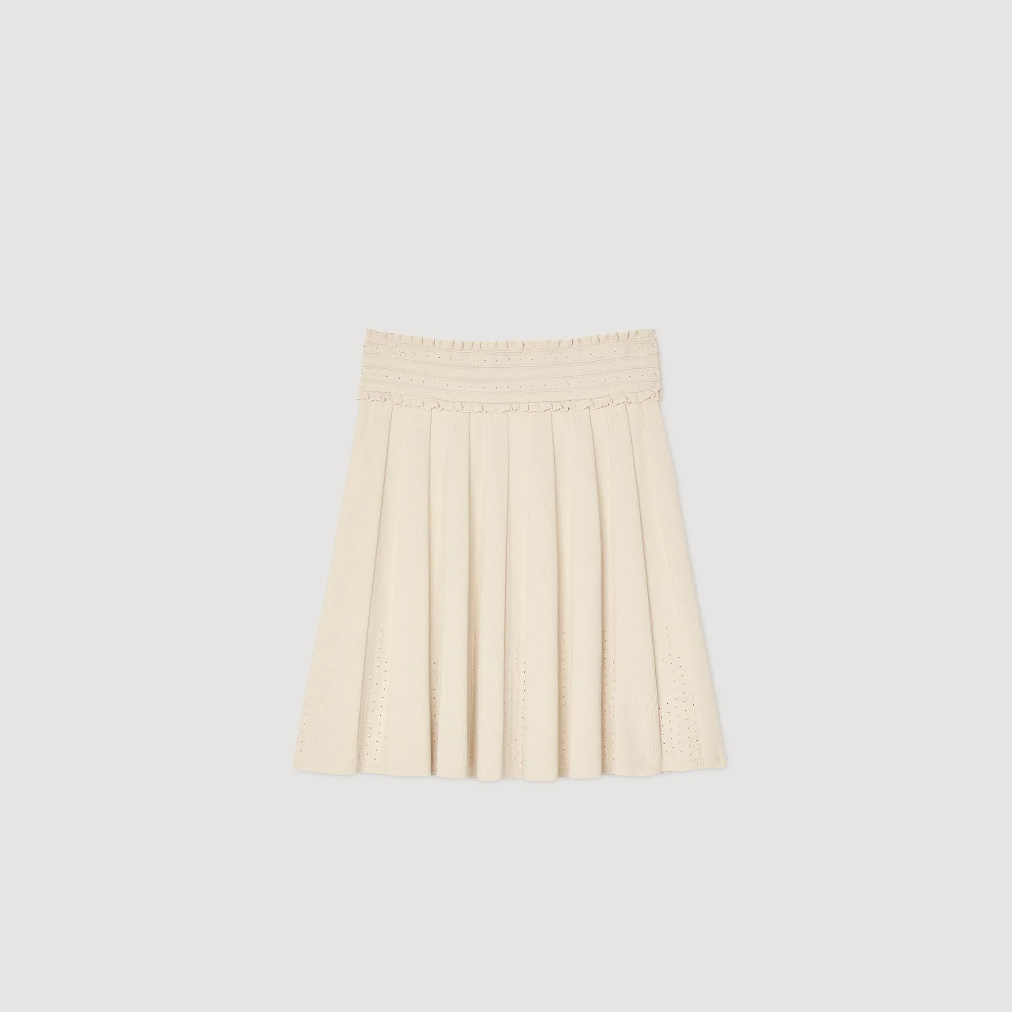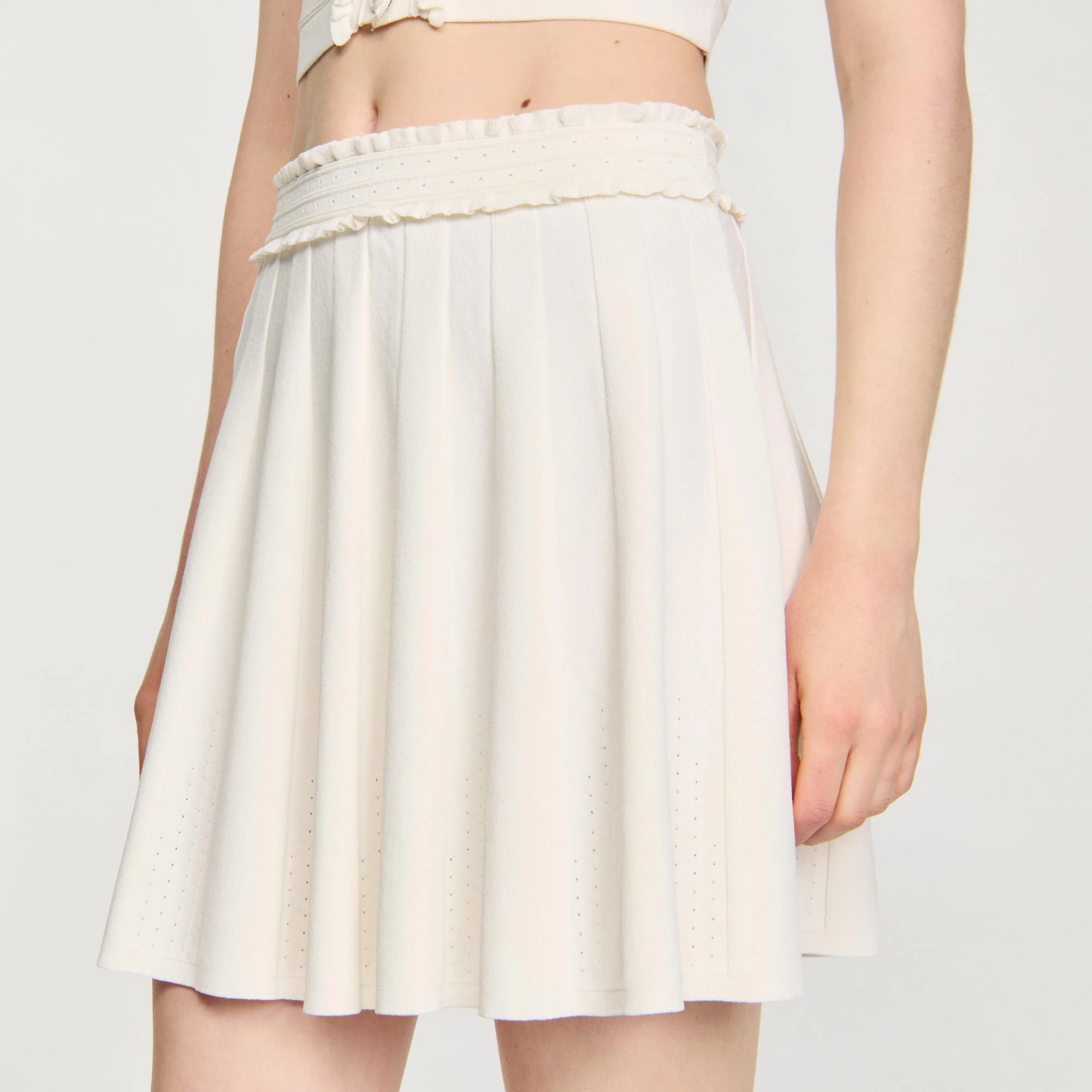 Falda corta de punto pointelle con cintura elástica y volantes.