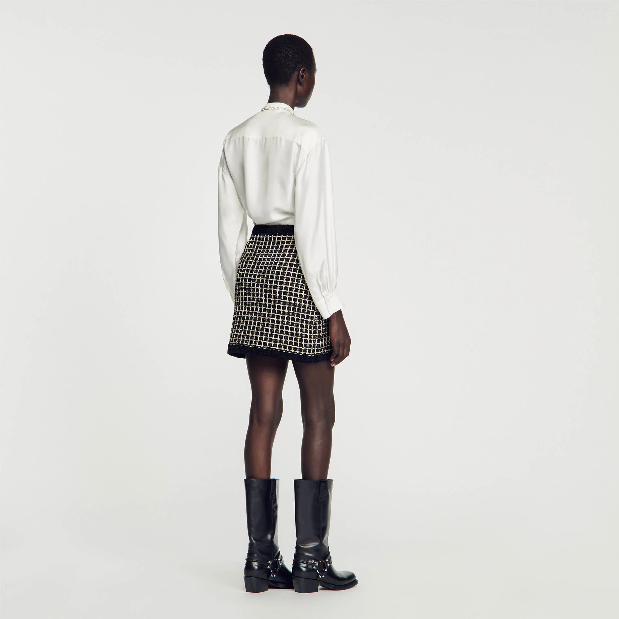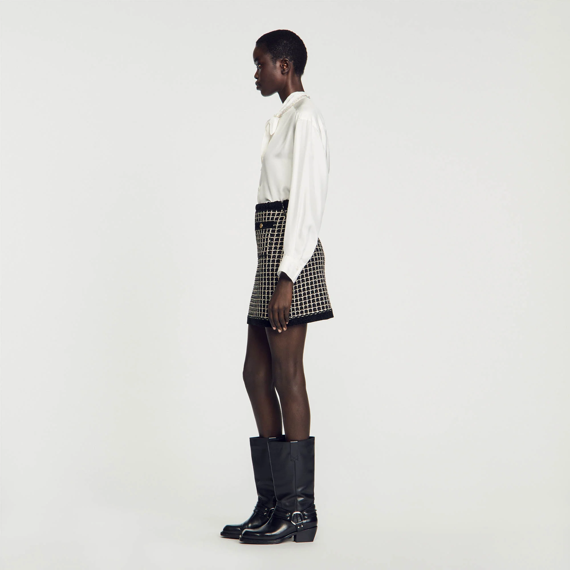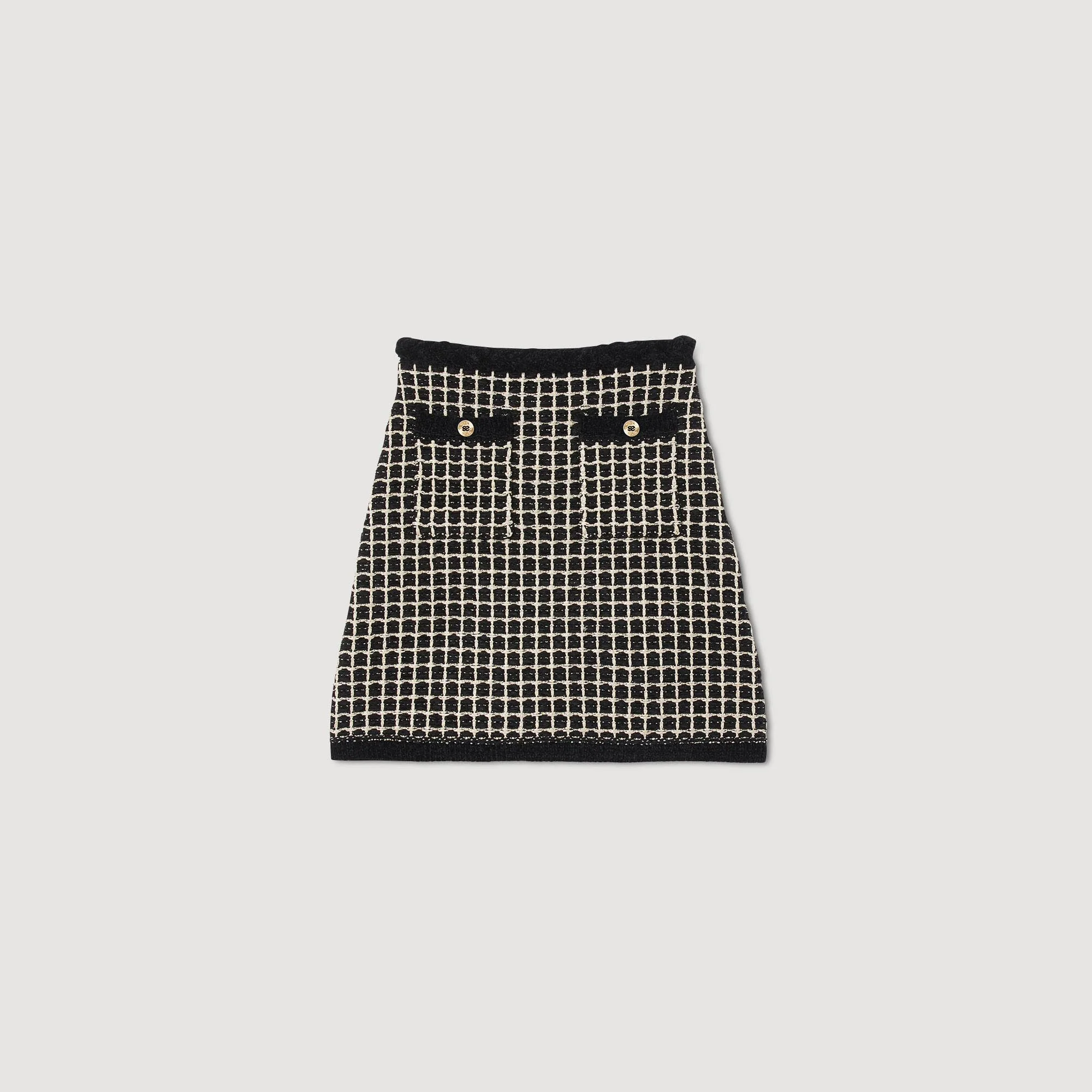 Falda corta de punto texturizado de efecto tweed brillante decorada con un cinturón trenzado de efecto terciopelo en la cintura y bolsillos ribeteados con botones de fantasía.