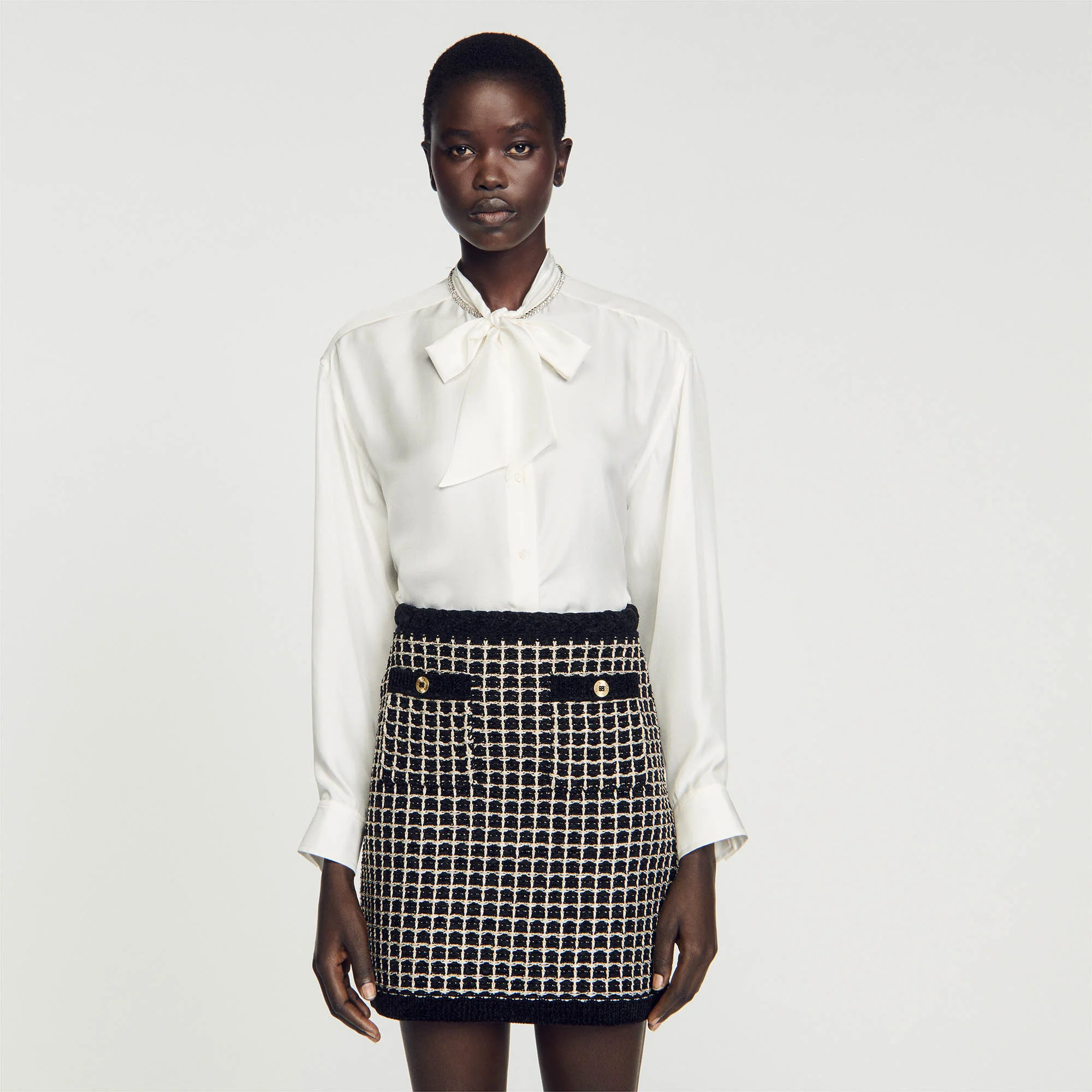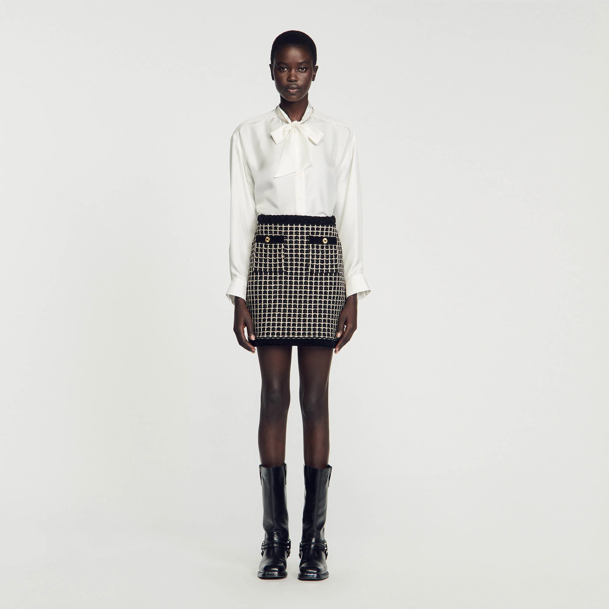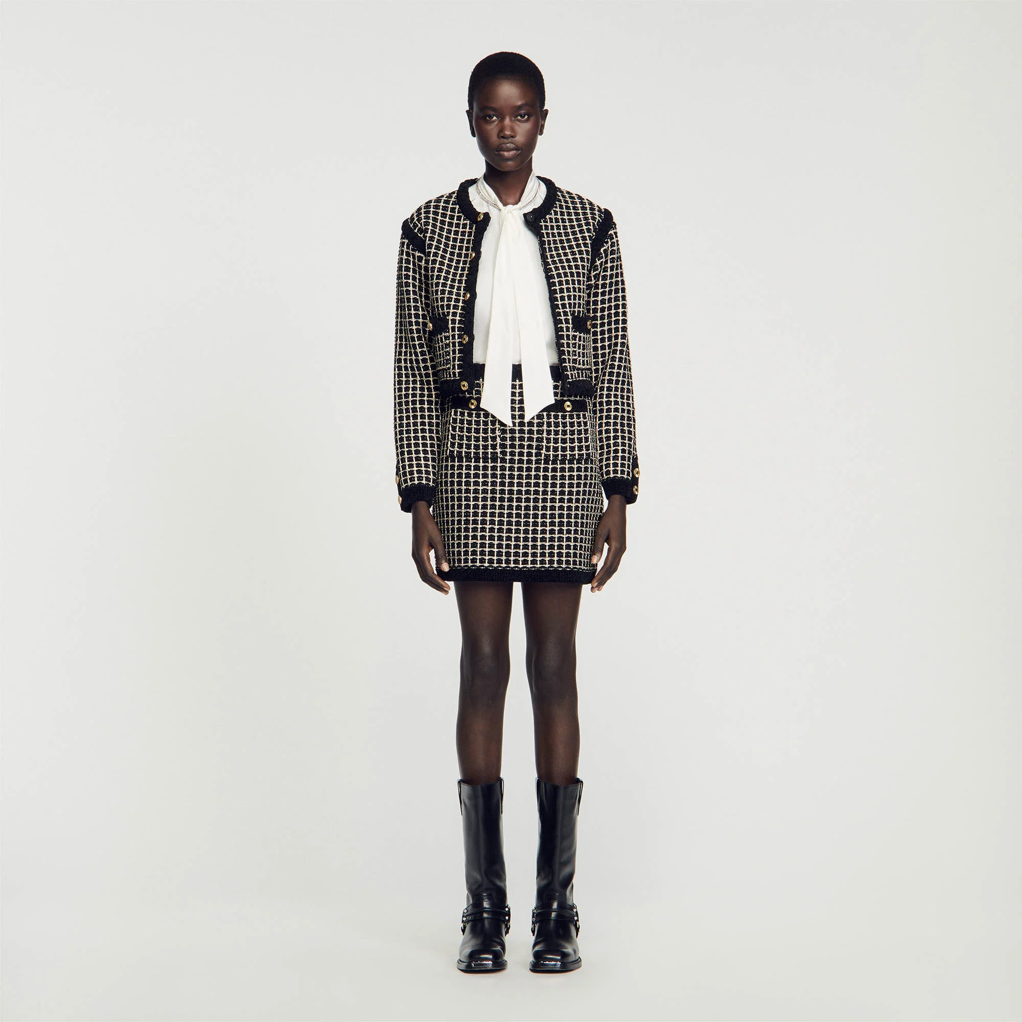 Falda corta de punto texturizado de efecto tweed brillante decorada con un cinturón trenzado de efecto terciopelo en la cintura y bolsillos ribeteados con botones de fantasía.