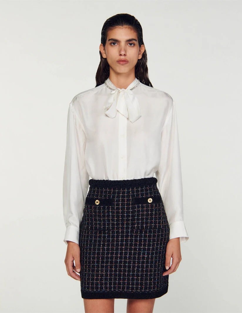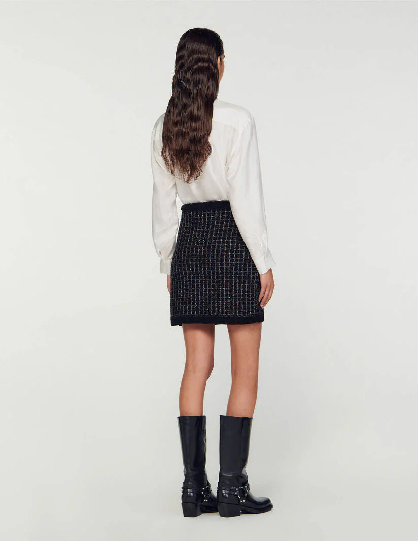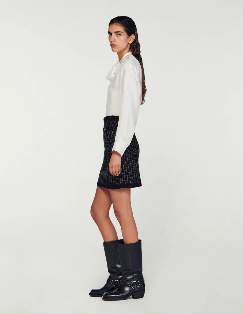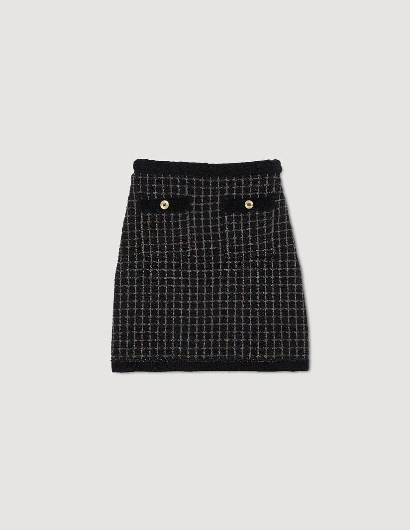 Falda corta de punto texturizado de efecto tweed brillante decorada con un cinturón trenzado de efecto terciopelo en la cintura y bolsillos ribeteados con botones de fantasía.