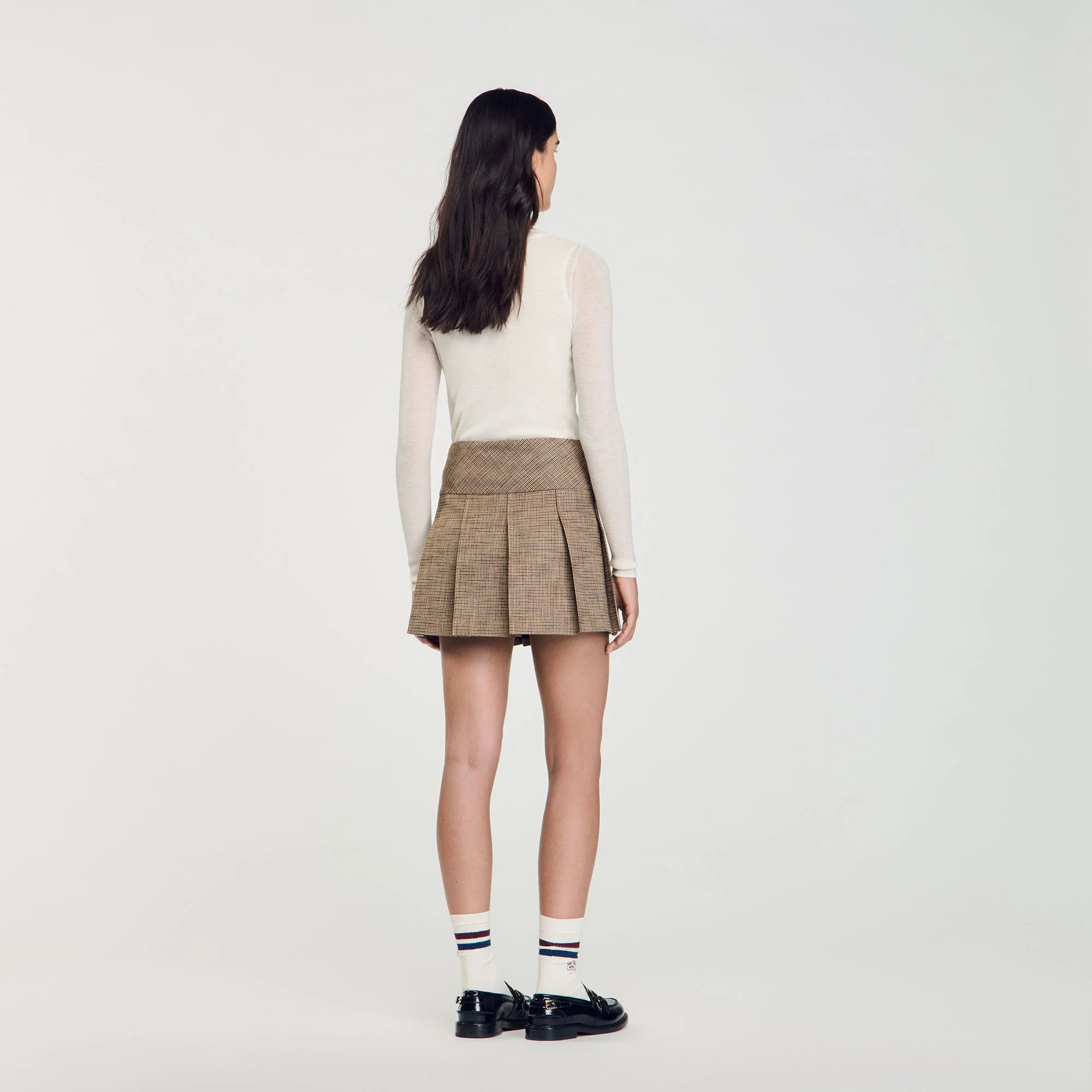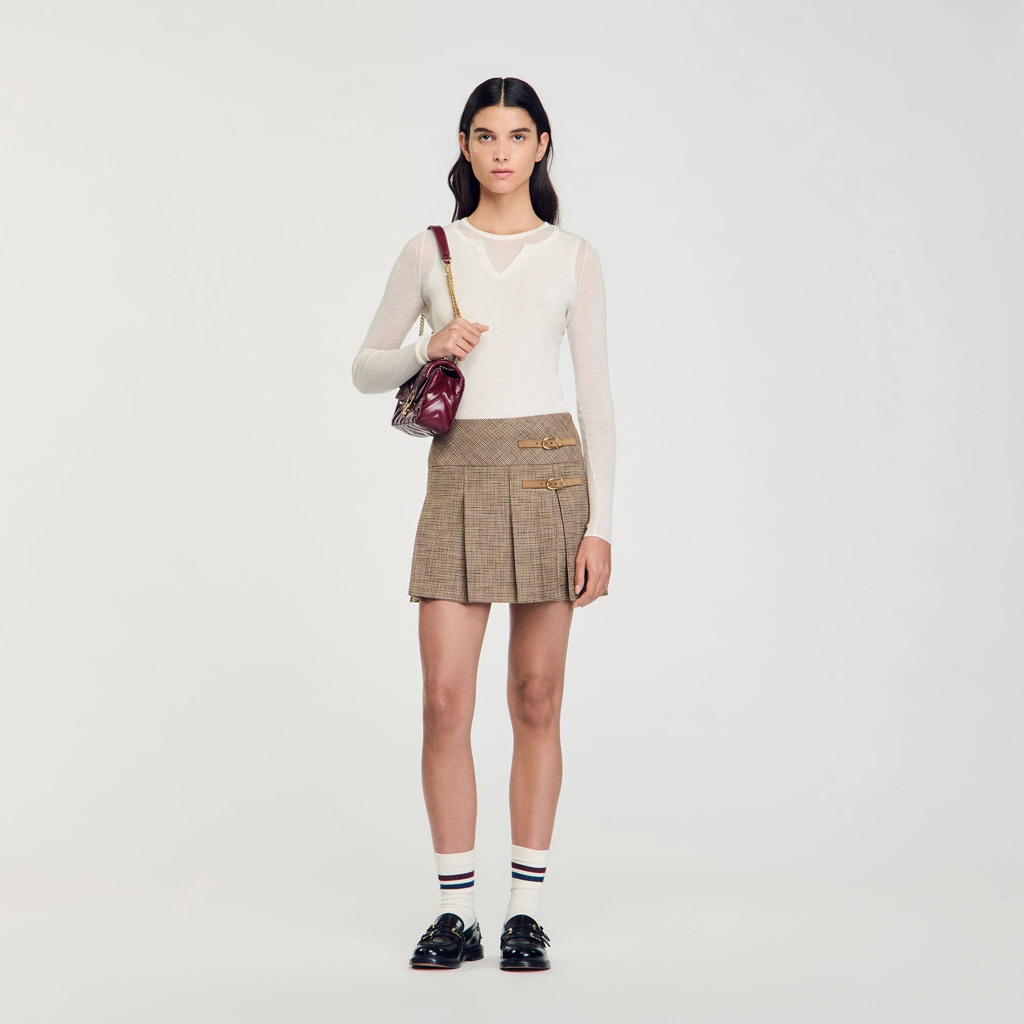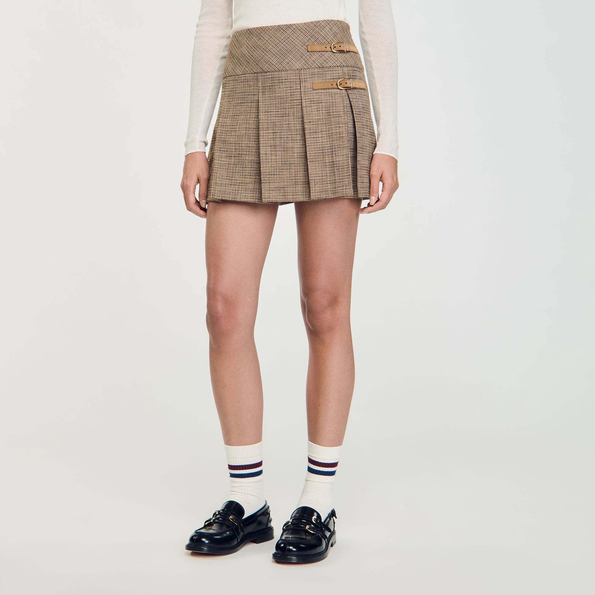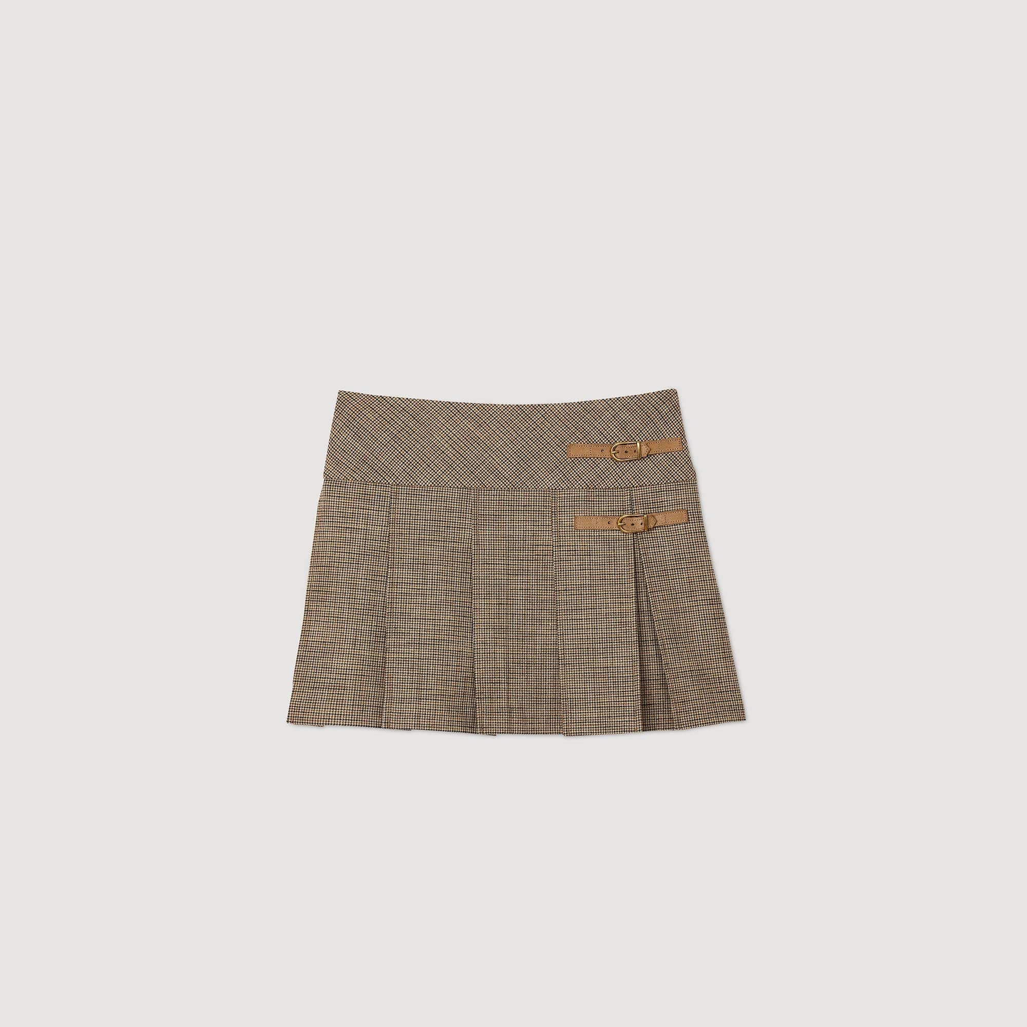 Falda de tablas con motivo de pata de gallo y hebillas.