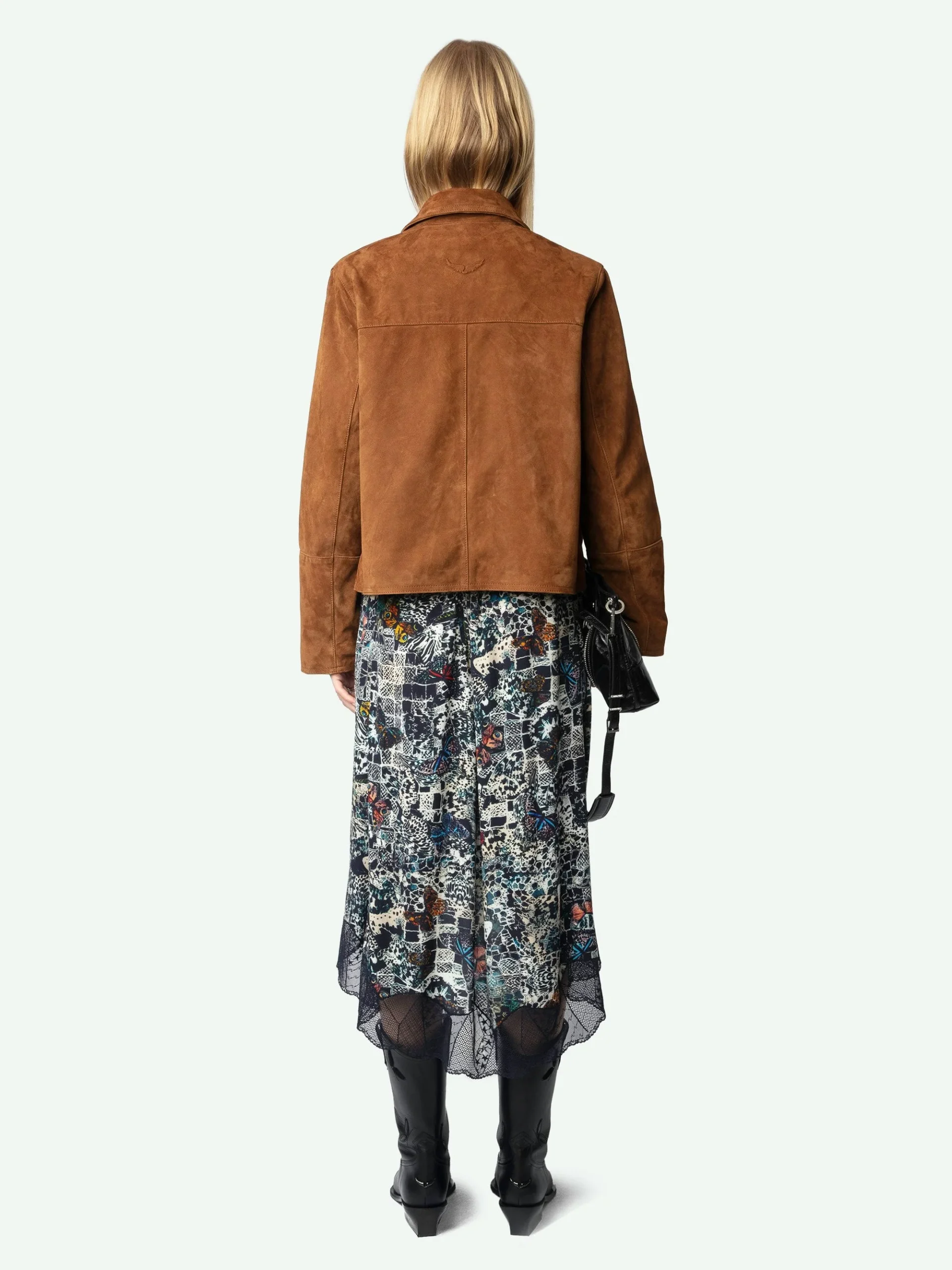 Falda midi de estilo lencero, asimétrica, en viscosa estampada con encaje francés exclusivo.
