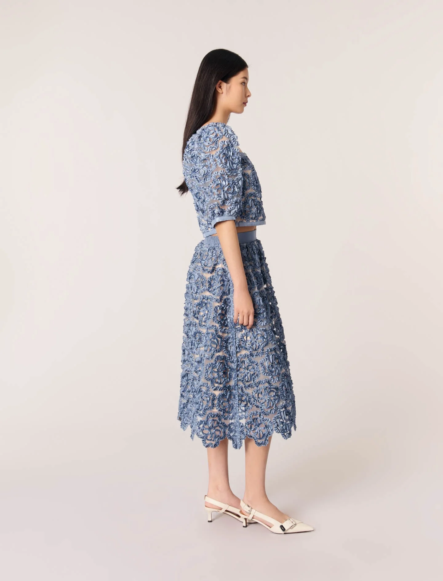 Confeccionada en organza vaporosa, esta falda larga presenta flores satinadas al bies creadas con delicados bordados de cintas. Esta técnica única añade volumen y un llamativo efecto 3D. Los motivos inspirados en la naturaleza, como flores y hojas, añaden un toque romántico y sofisticado a la prenda. Un fondo de rejilla forrada y un bajo festoneado juegan con la transparencia, añadiendo ligereza y fluidez. La cintura semielástica realza la silueta.