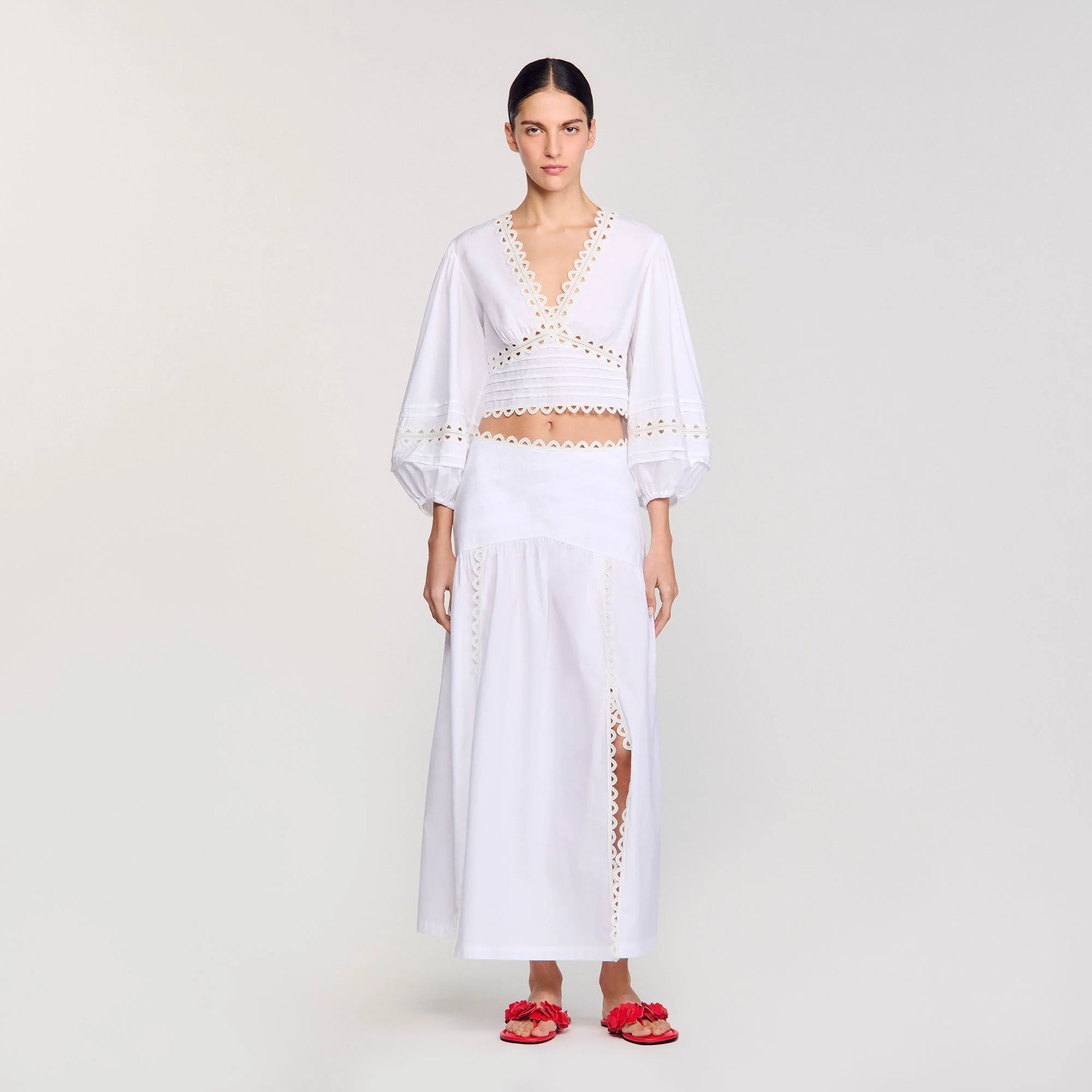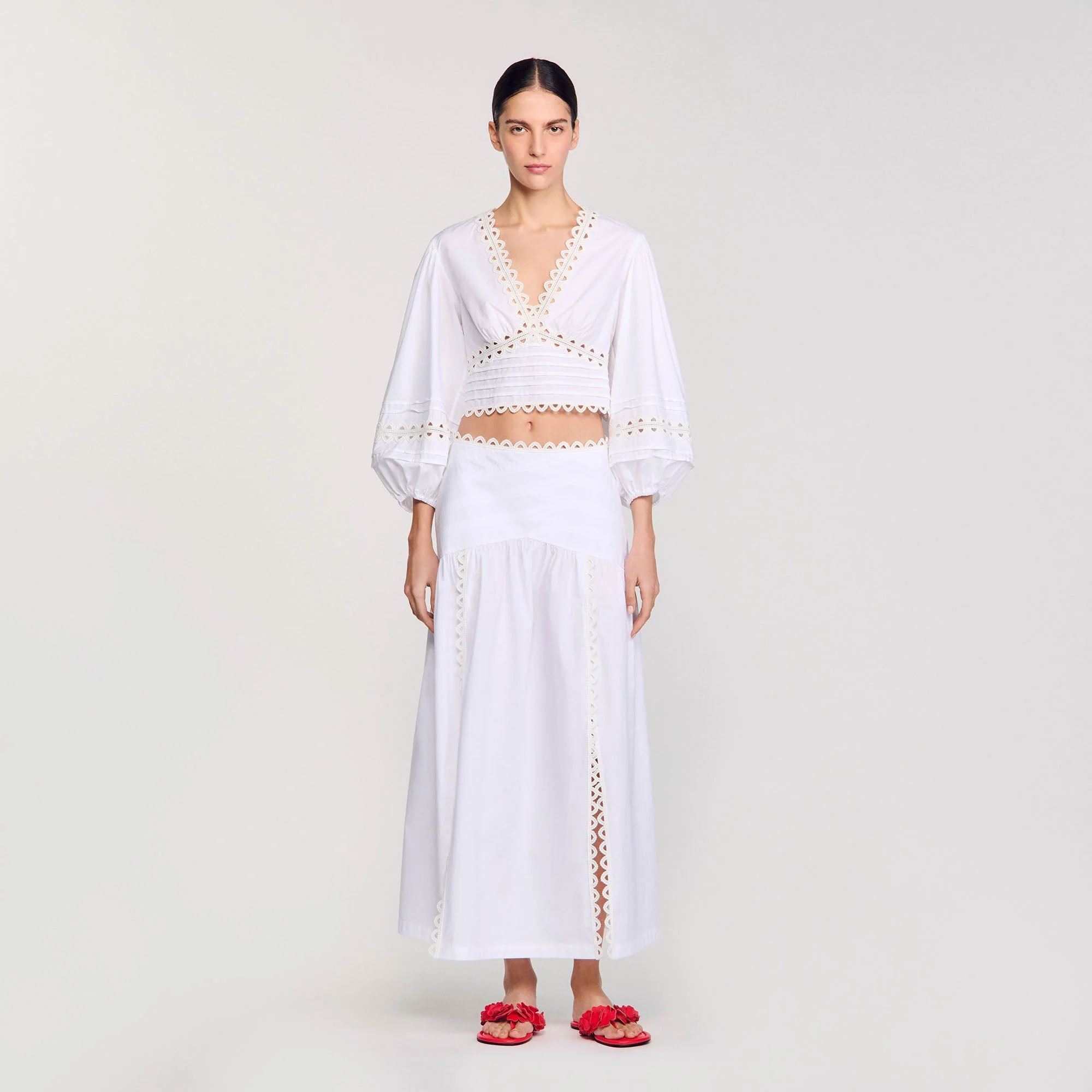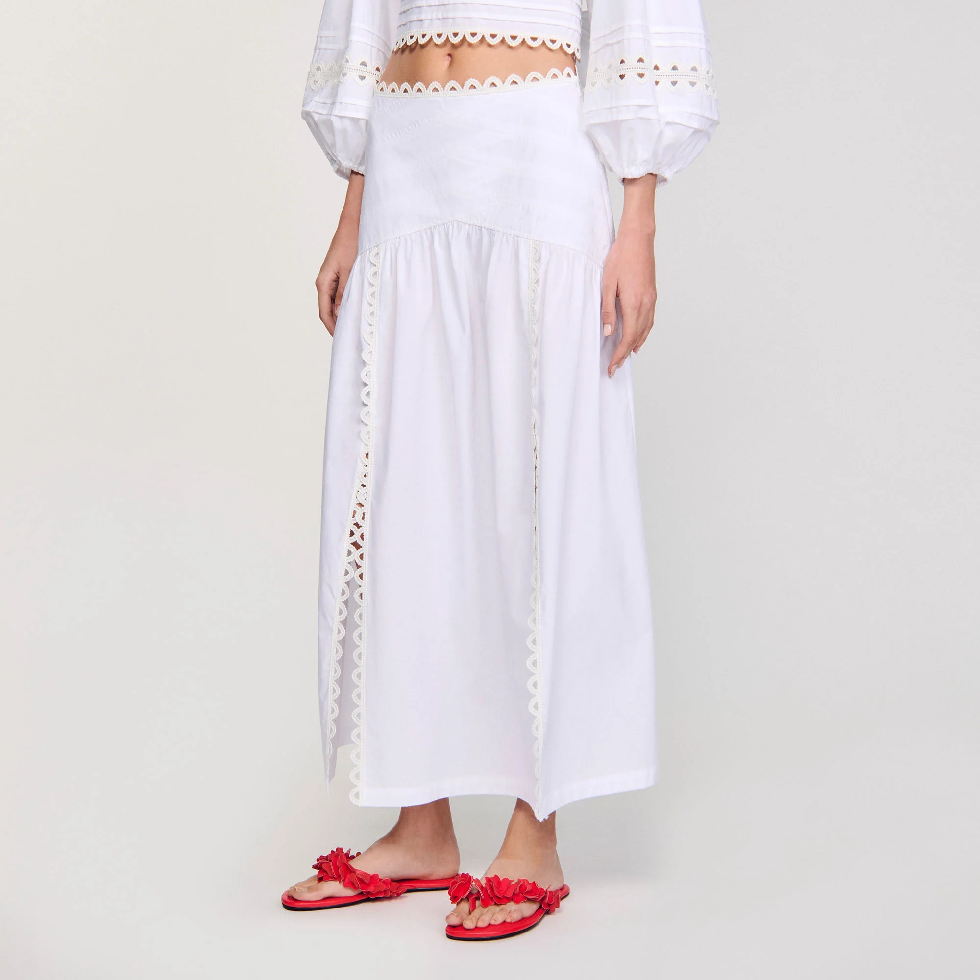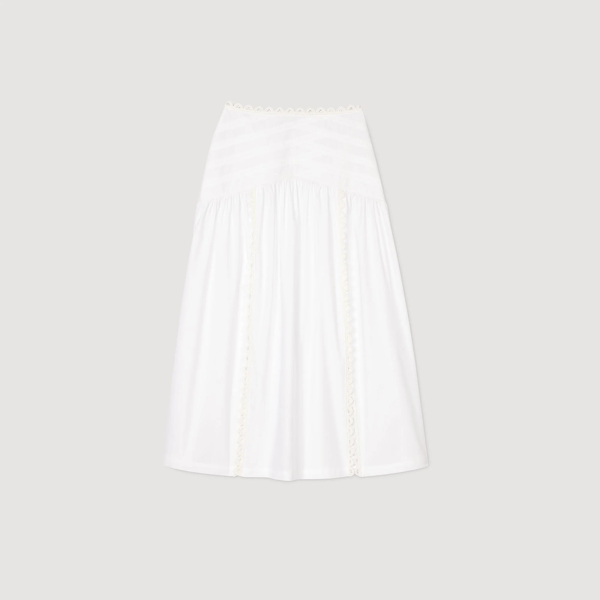 Falda larga con aberturas en la parte delantera, pespuntes en la cintura y adornos a base de galones de encaje.