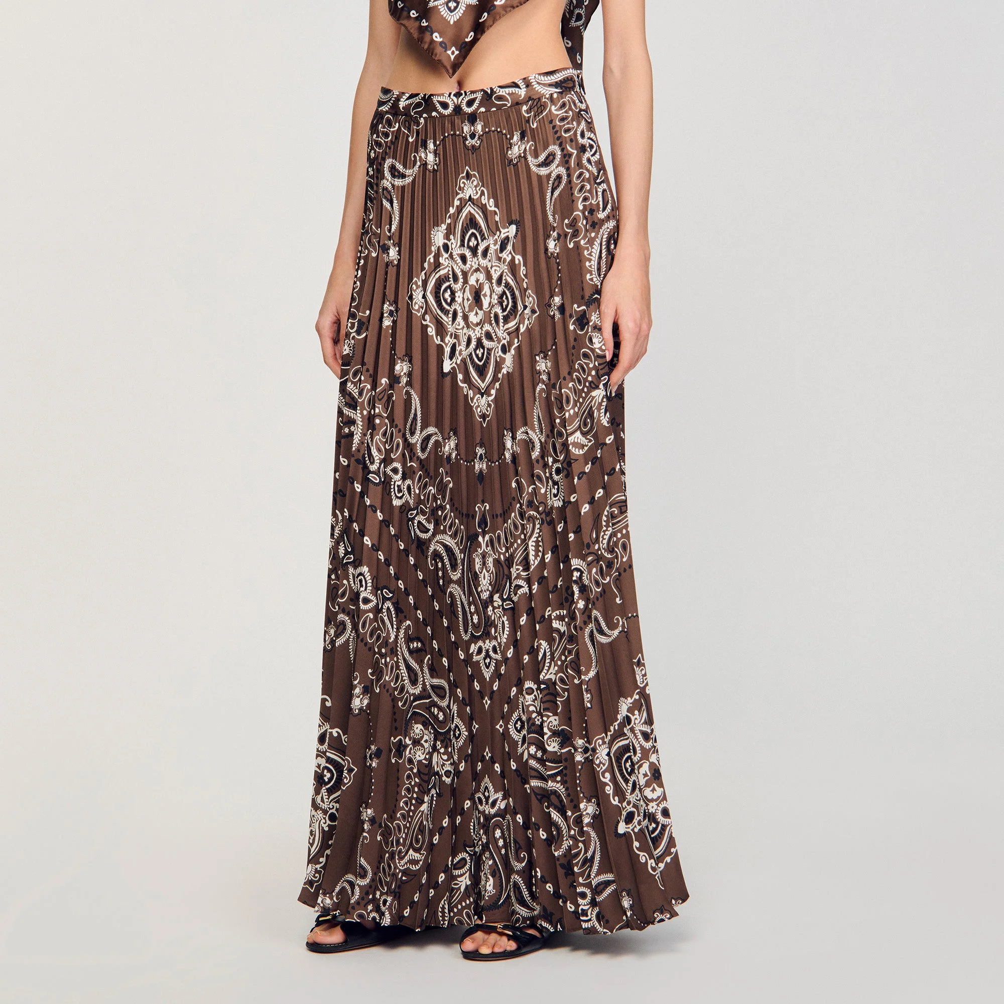 Falda larga plisada adornada con estampado de bandana.