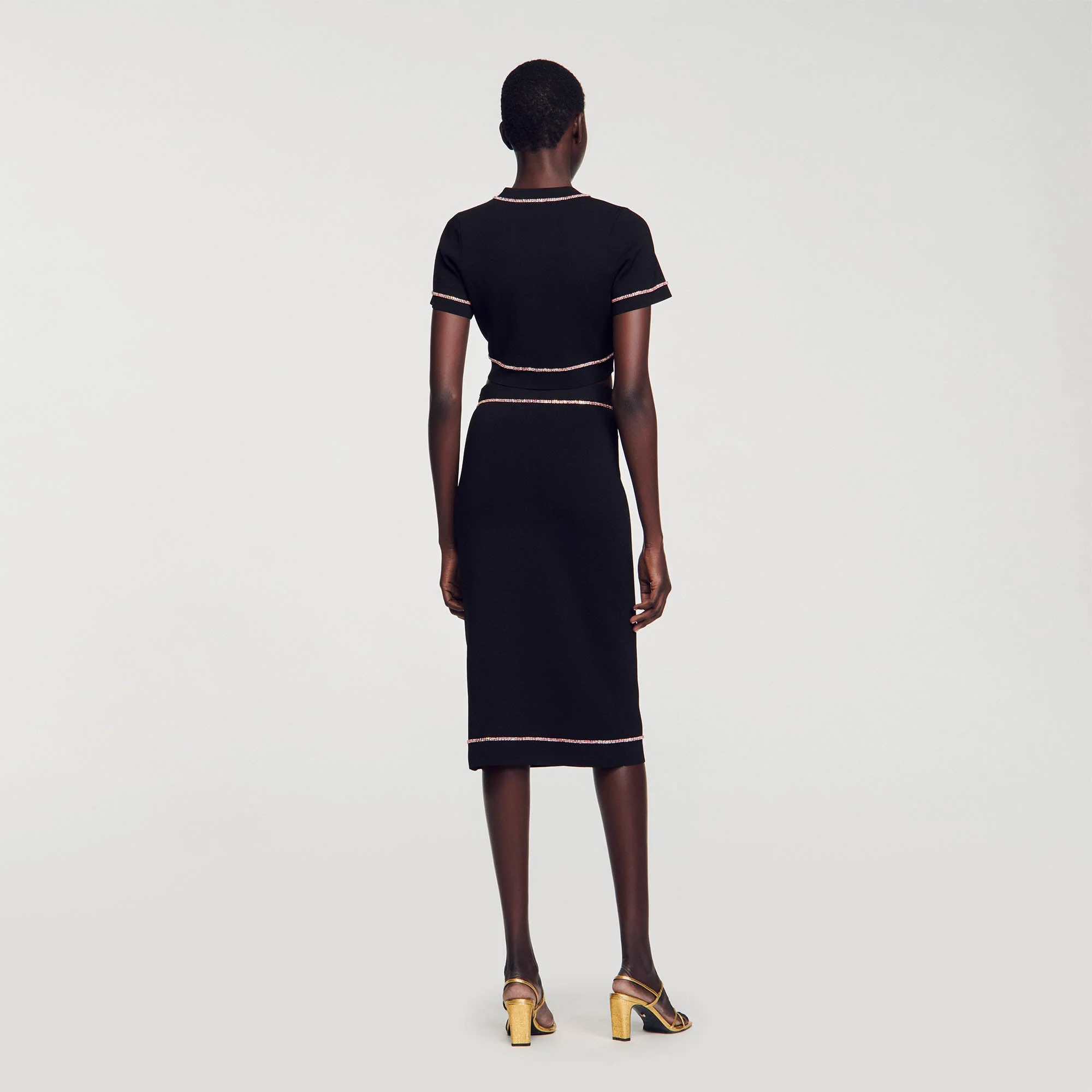 Falda tubo midi de punto con cierre de botones y bolsillos de parche. Decorado con pedrería multicolor.