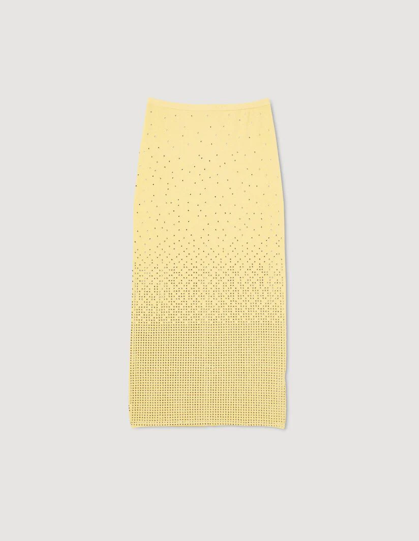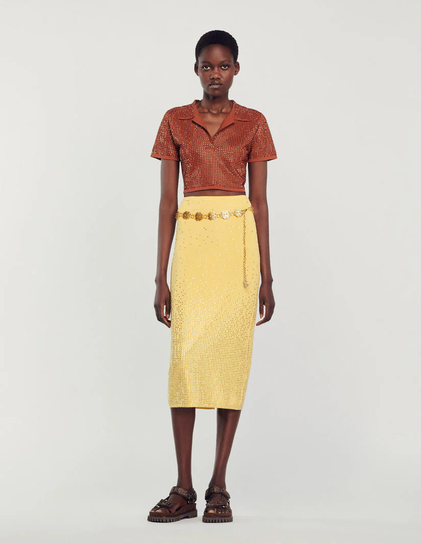 Falda midi de corte ajustado al cuerpo de punto elástico, sublimada con strass en toda la prenda.