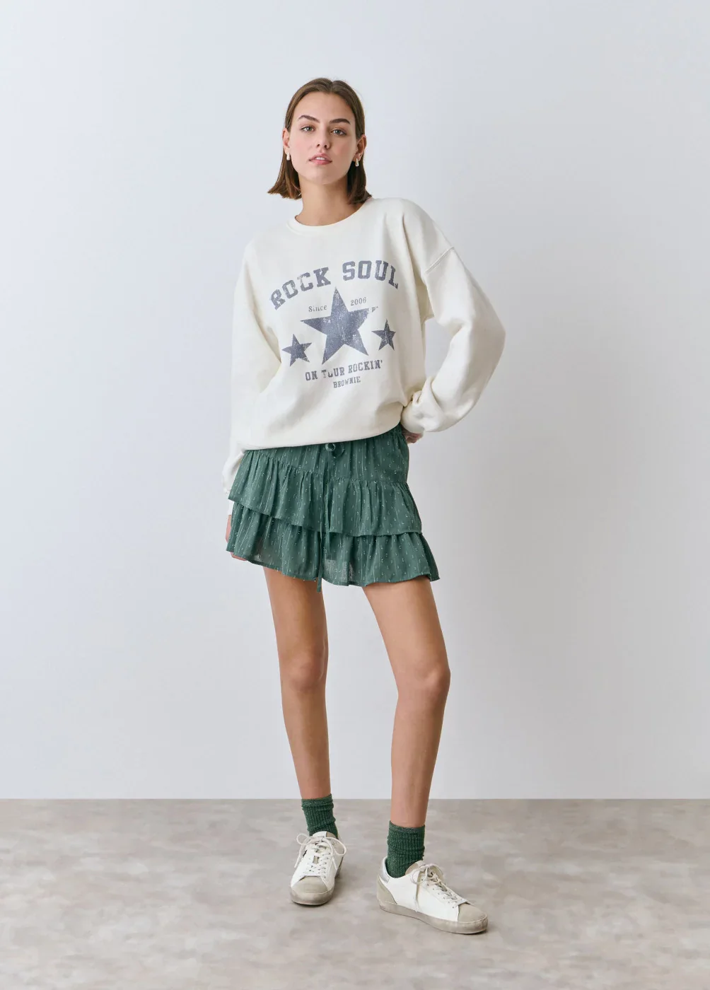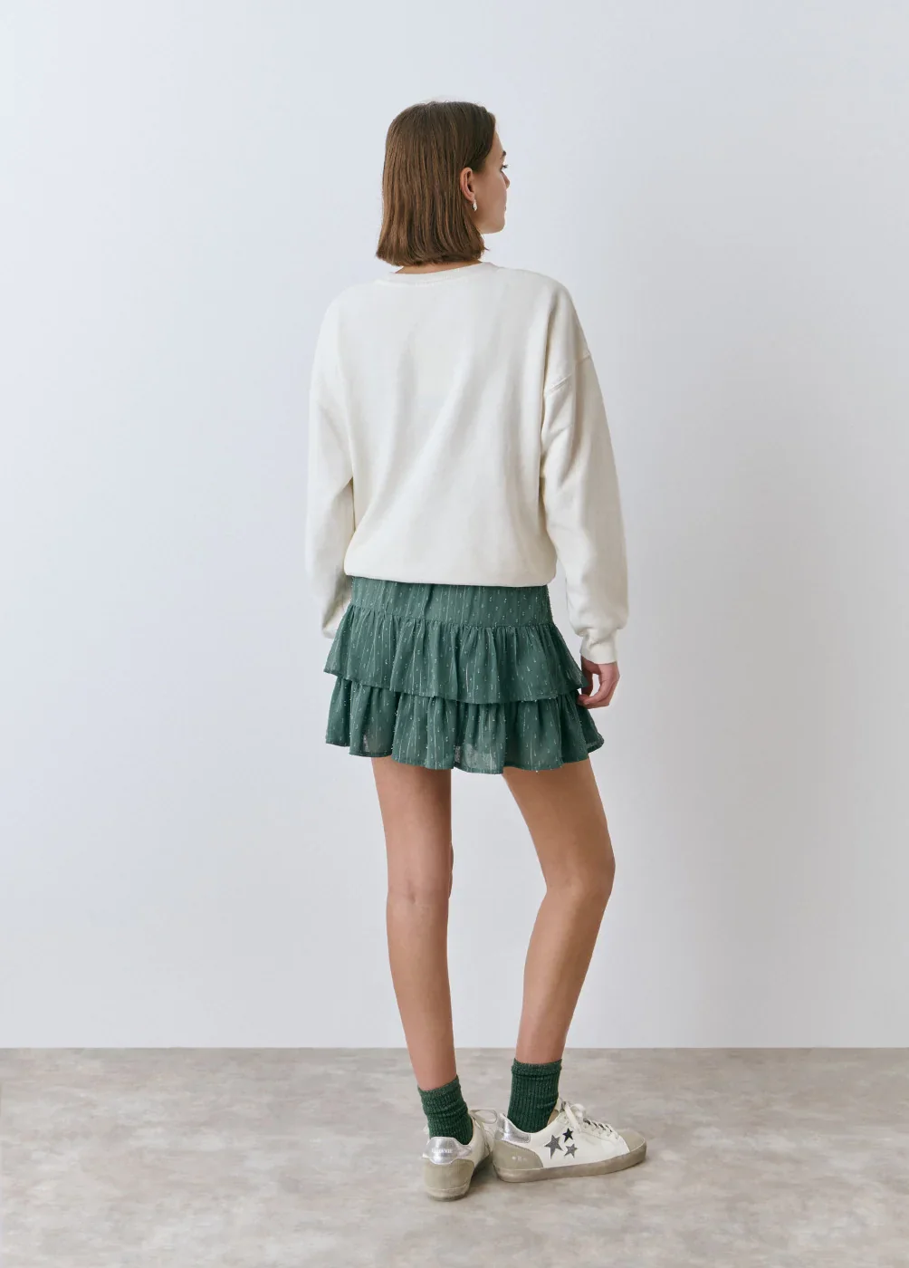 Falda pantalón corta con volantes, detalles en plumeti y brillo, y goma en la cintura con lazada.
