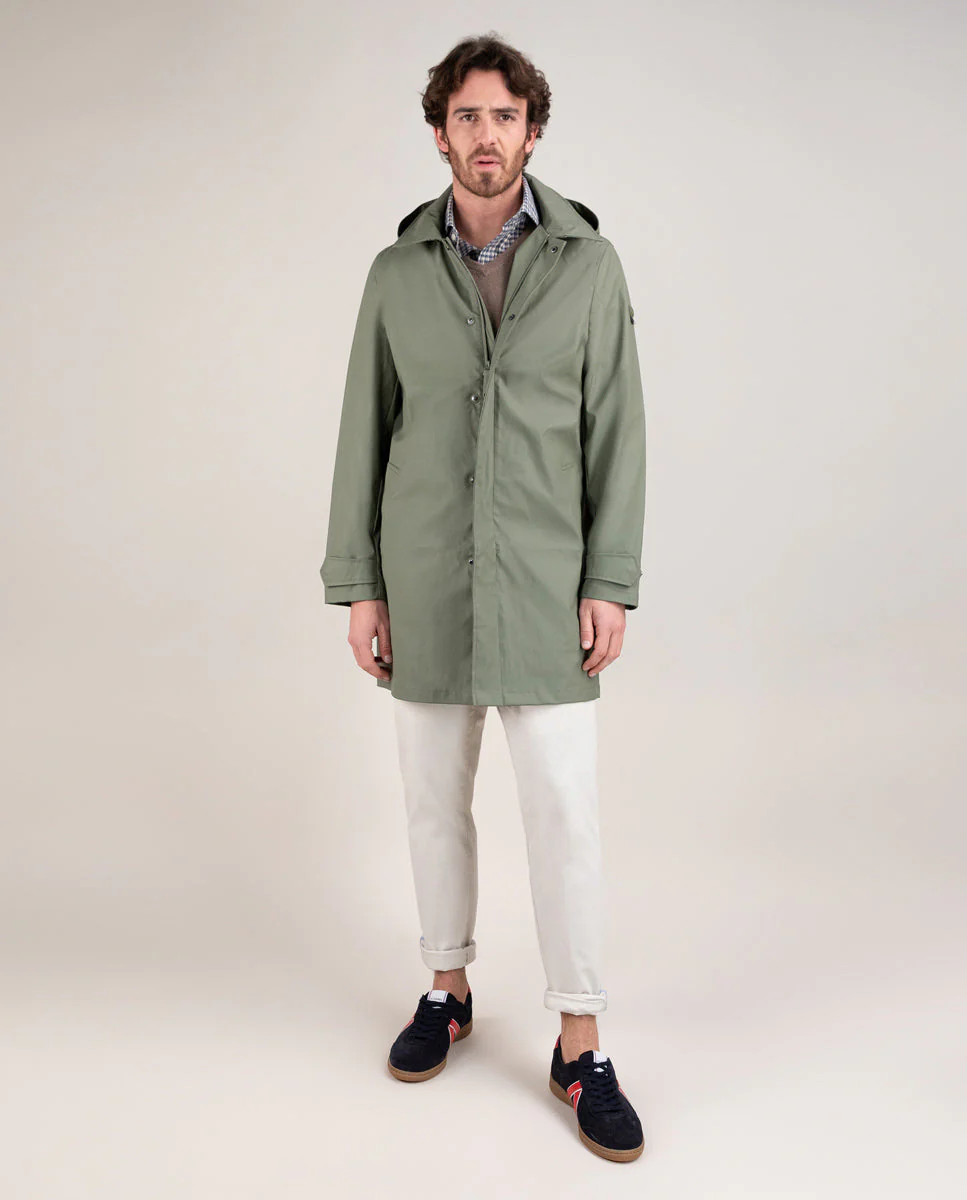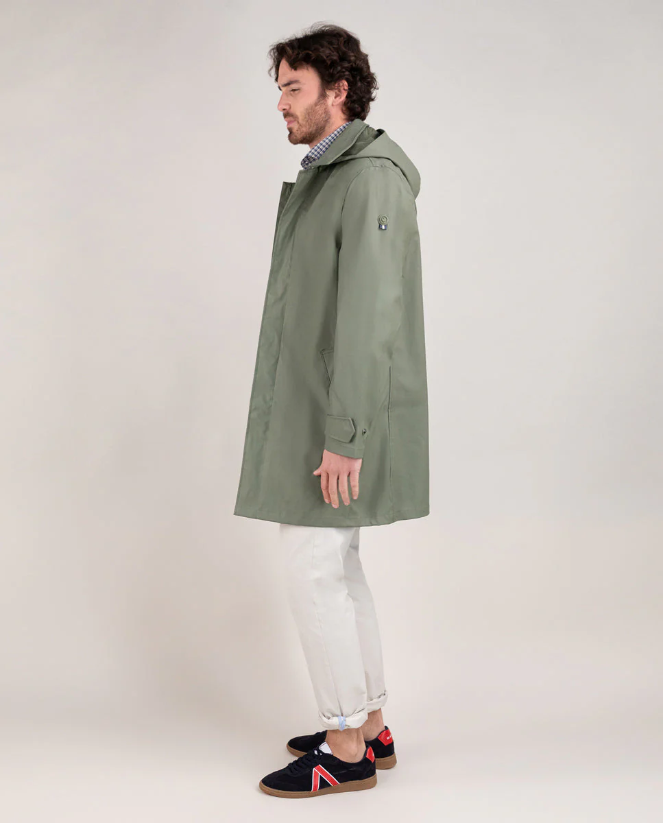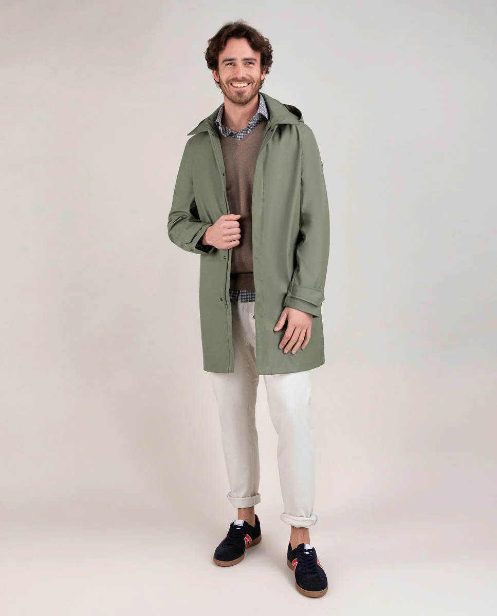 Gabardina de hombre con acabado engomado confeccionada en poliéster reciclado, diseñada para ofrecer protección contra la lluvia y el viento. Su corte recto proporciona un versatilidad, incluye detalles de bandera, logo engomado situado en la manga,sistema de cierre con automáticos para ofrecer mayor funcionalidad. Combinando estilo, sostenibilidad y comodidad en una prenda versátil.