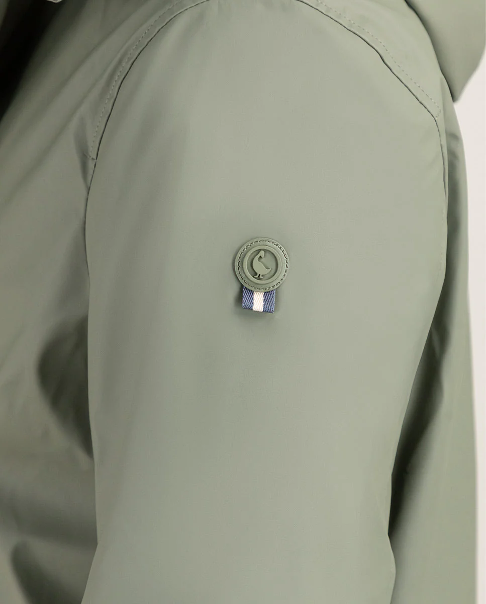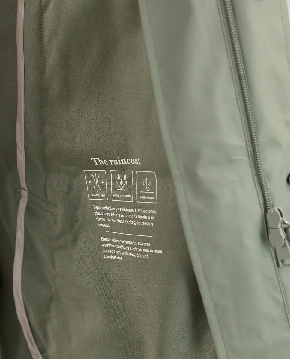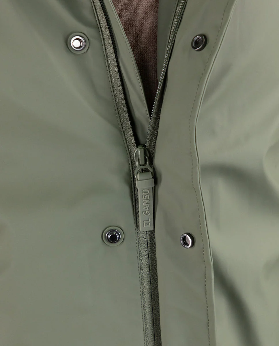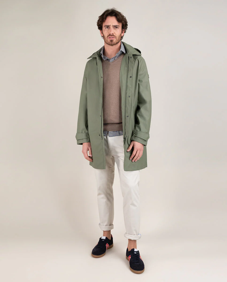 Gabardina de hombre con acabado engomado confeccionada en poliéster reciclado, diseñada para ofrecer protección contra la lluvia y el viento. Su corte recto proporciona un versatilidad, incluye detalles de bandera, logo engomado situado en la manga,sistema de cierre con automáticos para ofrecer mayor funcionalidad. Combinando estilo, sostenibilidad y comodidad en una prenda versátil.