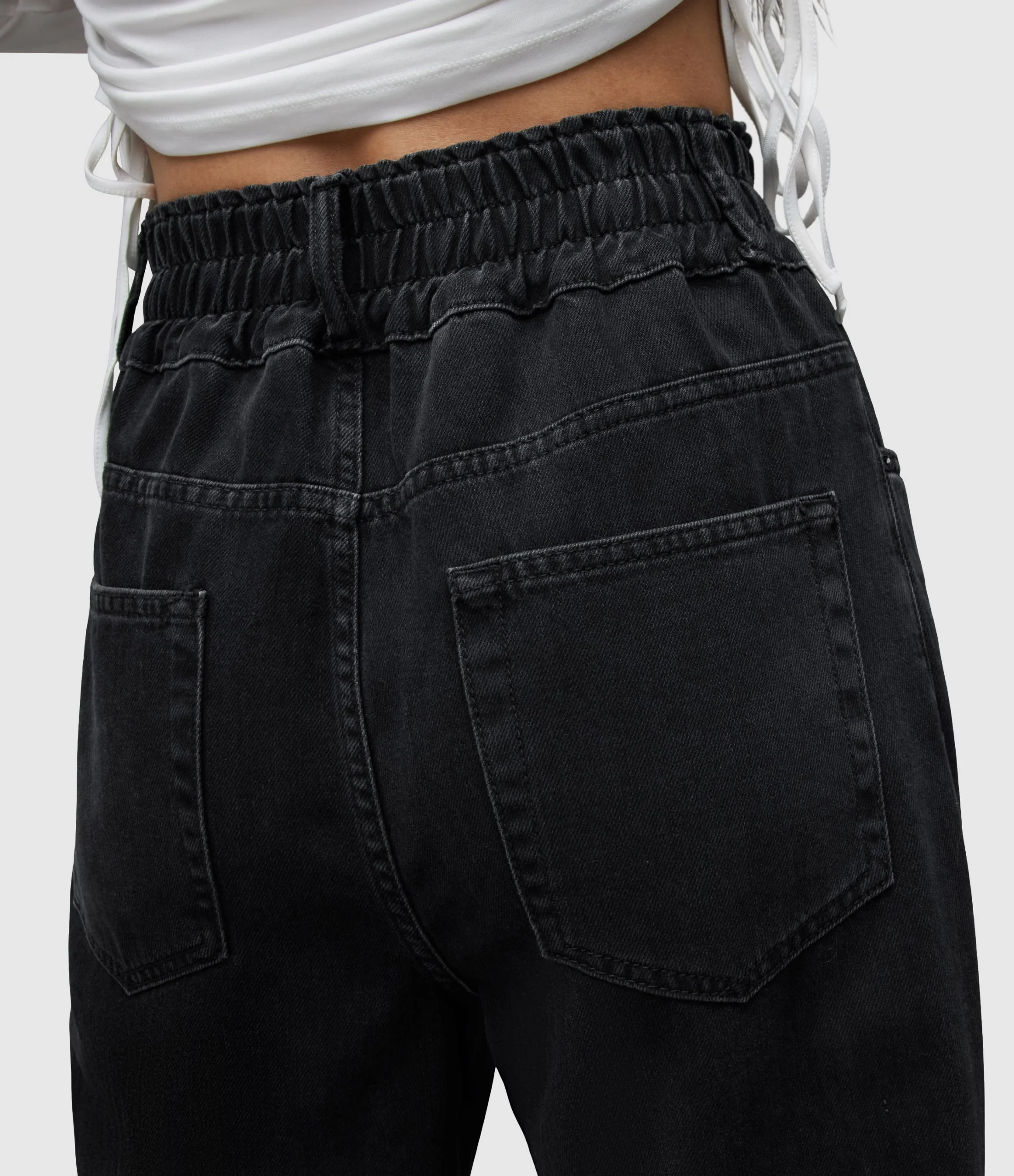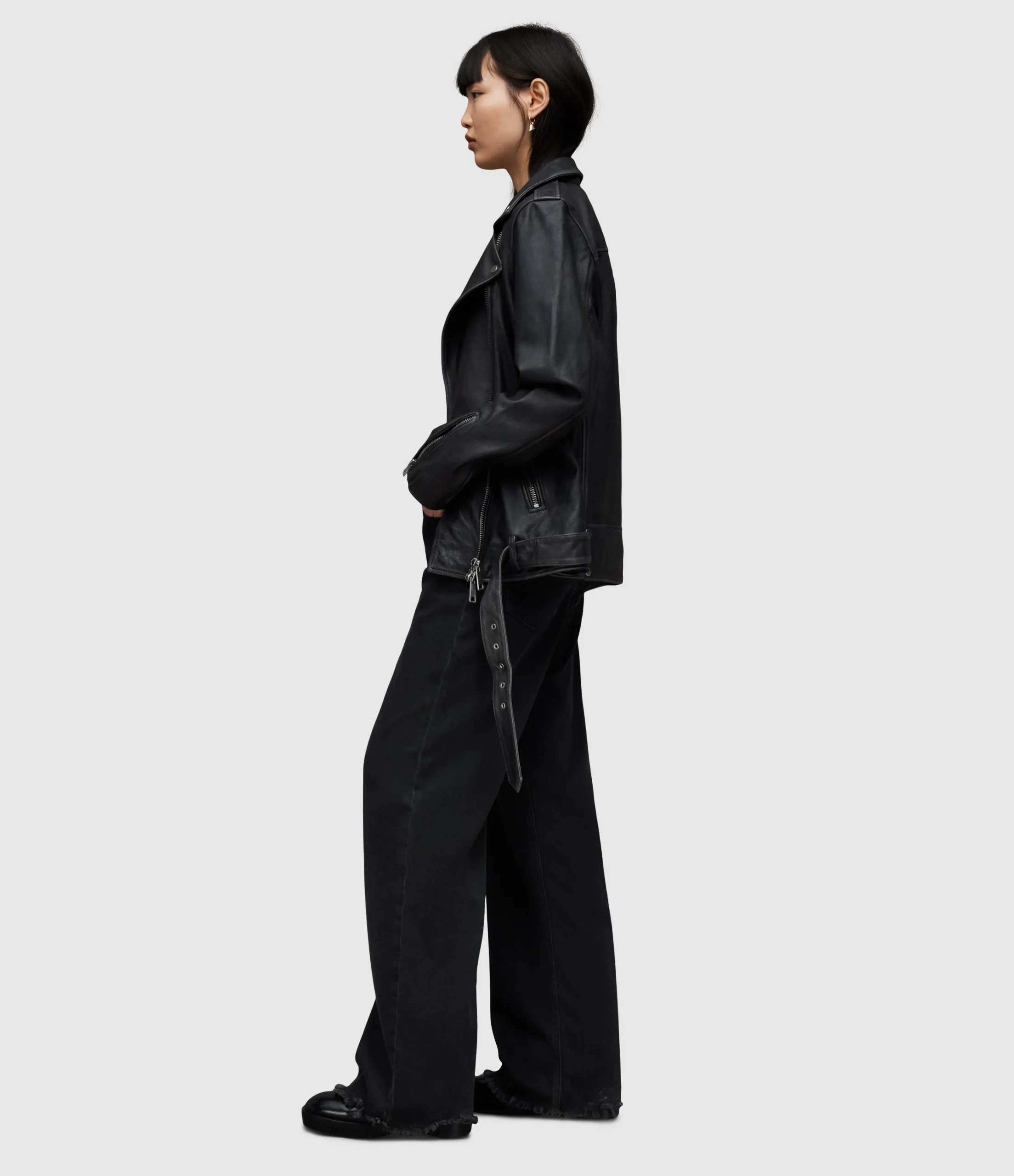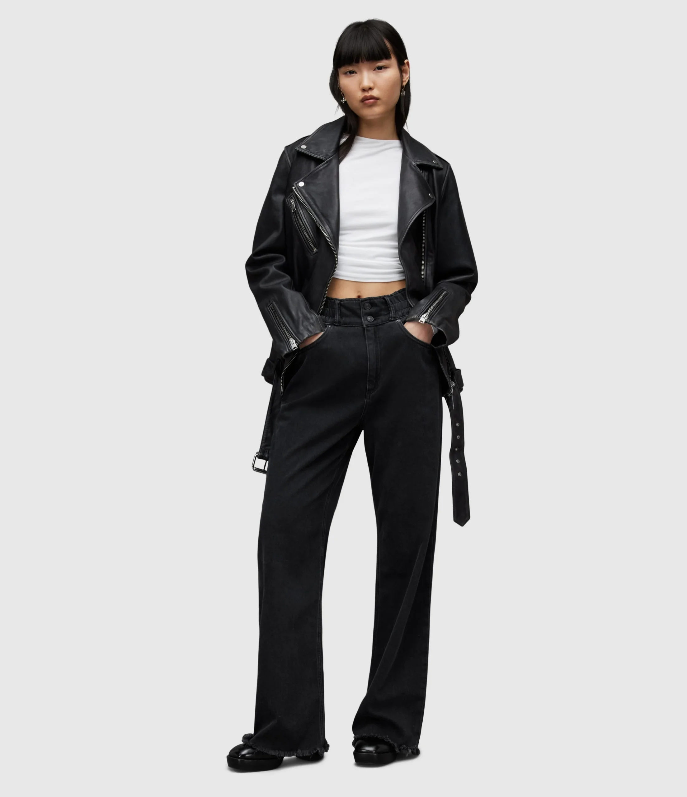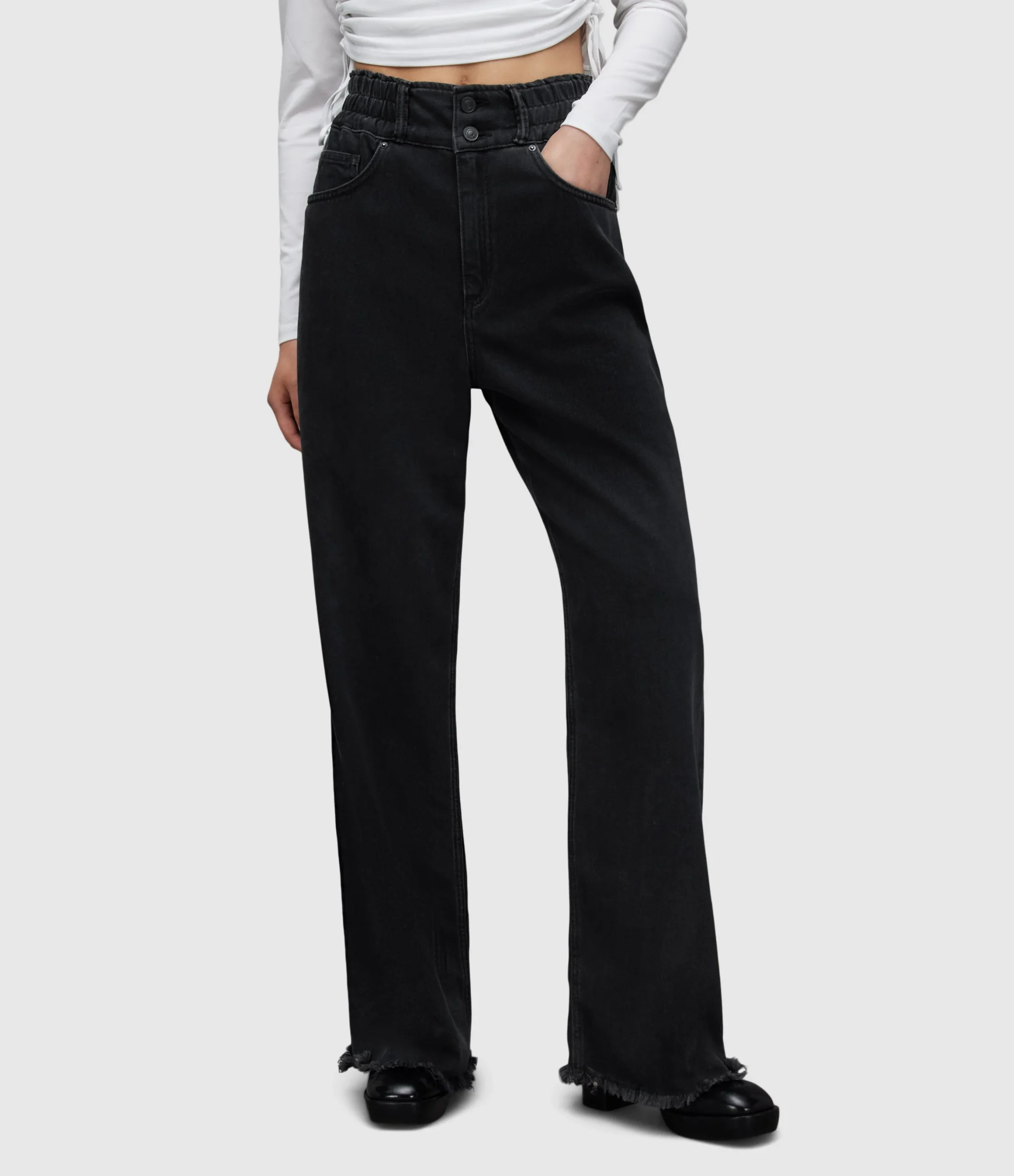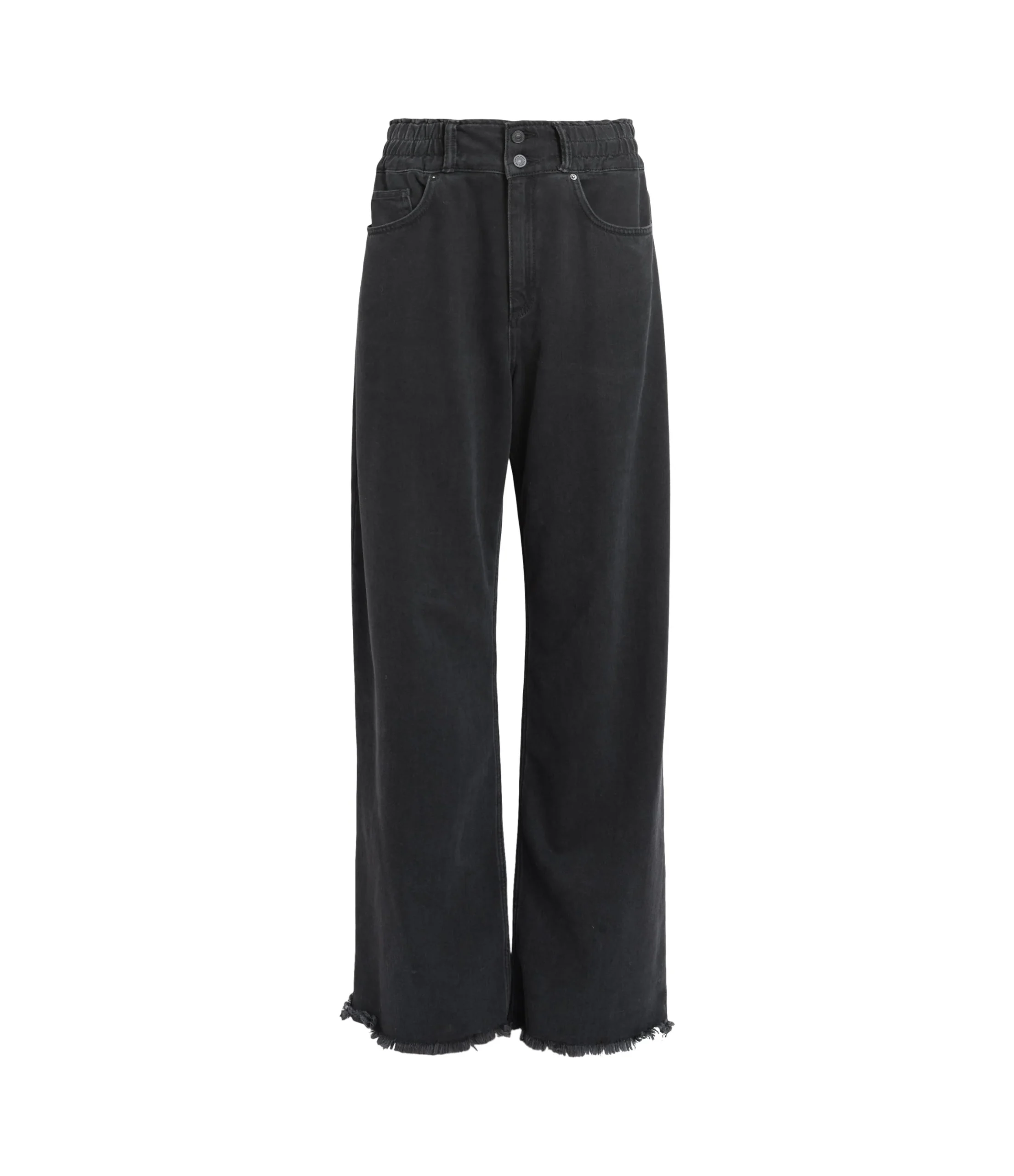 HAILEY WIDE LEG JEAN WE033Z WASHED BLACK SEP Zip closure WIDE LEG HAILEY WAISTBAND = ZIPPER FLY SECURED WITH TWO BUTTONS ON WAISTBAND, ELASTICATED WAIST. WIDE LEG WITH RAW HEM. «INSEAM – 78